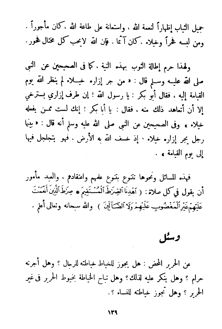 جَمِيلَ الثِّيَابِ إظْهَارًا لِنِعْمَةِ اللَّهِ وَاسْتِعَانَةً عَلَى طَاعَةِ اللَّهِ كَانَ مَأْجُورًا. وَمَنْ لَبِسَهُ فَخْرًا وَخُيَلَاءَ كَانَ آثِمًا. فَإِنَّ اللَّهَ لَا يُحِبُّ كُلَّ مُخْتَالٍ فَخُورٍ. وَلِهَذَا حَرَّمَ إطَالَةَ الثَّوْبِ بِهَذِهِ النِّيَّةِ كَمَا فِي الصَّحِيحَيْنِ عَنْ النَّبِيِّ صَلَّى اللَّهُ عَلَيْهِ وَسَلَّمَ قَالَ: " {مَنْ جَرَّ إزَارَهُ خُيَلَاءَ لَمْ يَنْظُرْ اللَّهُ يَوْمَ الْقِيَامَةِ إلَيْهِ فَقَالَ أَبُو بَكْرٍ: يَا رَسُولَ اللَّهِ إنَّ طَرَفَ إزَارِي يَسْتَرْخِي إلَّا أَنْ أَتَعَاهَدَ ذَلِكَ مِنْهُ فَقَالَ: يَا أَبَا بَكْرٍ إنَّك لَسْت مِمَّنْ يَفْعَلُهُ خُيَلَاءَ} وَفِي الصَّحِيحَيْنِ عَنْ النَّبِيِّ صَلَّى اللَّهُ عَلَيْهِ وَسَلَّمَ أَنَّهُ قَالَ: " {بَيْنَمَا رَجُلٌ يَجُرُّ إزَارَهُ خُيَلَاءَ إذْ خَسَفَ اللَّهُ بِهِ الْأَرْضَ فَهُوَ يَتَجَلْجَلُ فِيهَا إلَى يَوْمِ الْقِيَامَةِ} . فَهَذِهِ الْمَسَائِلُ وَنَحْوُهَا تَتَنَوَّعُ بِتَنَوُّعِ عِلْمِهِمْ وَاعْتِقَادِهِمْ وَالْعَبْدُ مَأْمُورٌ أَنْ يَقُولَ فِي كُلِّ صَلَاةٍ: {اهْدِنَا الصِّرَاطَ الْمُسْتَقِيمَ} {صِرَاطَ الَّذِينَ أَنْعَمْتَ عَلَيْهِمْ غَيْرِ الْمَغْضُوبِ عَلَيْهِمْ وَلَا الضَّالِّينَ} وَاَللَّهُ سُبْحَانَهُ وَتَعَالَى أَعْلَمُ.