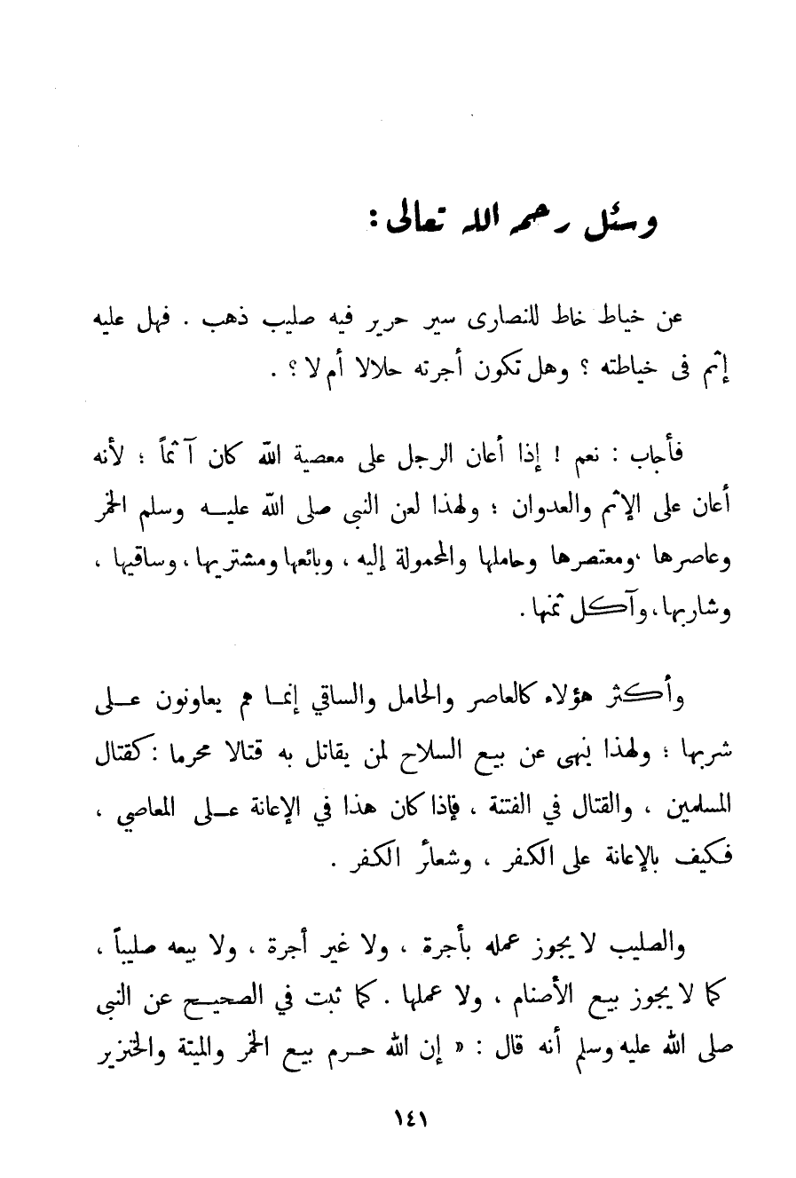 عَنْ خَيَّاطٍ خَاطَ لِلنَّصَارَى سَيْرَ حَرِيرٍ فِيهِ صَلِيبُ ذَهَبٍ. فَهَلْ عَلَيْهِ إثْمٌ فِي خِيَاطَتِهِ؟ وَهَلْ تَكُونُ أُجْرَتُهُ حَلَالًا أَمْ لَا؟ .