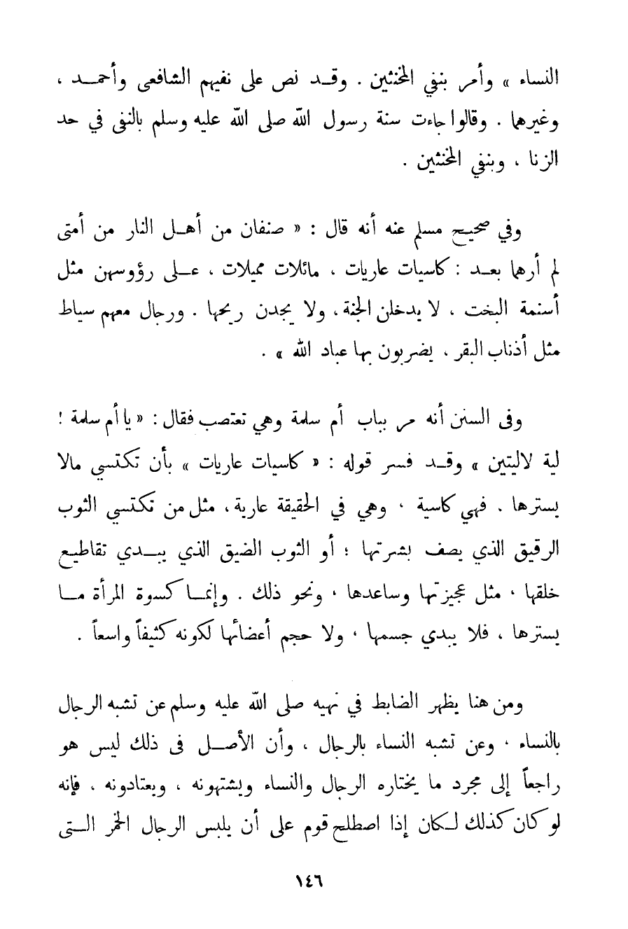 النِّسَاءِ} وَأَمَرَ بِنَفْيِ الْمُخَنَّثِينَ. وَقَدْ نَصَّ عَلَى نَفْيِهِمْ الشَّافِعِيُّ وَأَحْمَد وَغَيْرُهُمَا. وَقَالُوا جَاءَتْ سُنَّةُ رَسُولِ اللَّهِ صَلَّى اللَّهُ عَلَيْهِ وَسَلَّمَ بِالنَّفْيِ فِي حَدِّ الزِّنَا وَنَفْيِ الْمُخَنَّثِينَ. وَفِي صَحِيحِ مُسْلِمٍ عَنْهُ أَنَّهُ قَالَ: {صِنْفَانِ مِنْ أَهْلِ النَّارِ مِنْ أُمَّتِي لَمْ أَرَهُمَا بَعْدُ: كَاسِيَاتٌ عَارِيَاتٌ مَائِلَاتٌ مُمِيلَاتٌ عَلَى رُءُوسِهِنَّ مِثْلُ أَسْنِمَةِ الْبُخْتِ لَا يَدْخُلْنَ الْجَنَّةَ وَلَا يَجِدْنَ رِيحَهَا. وَرِجَالٌ مَعَهُمْ سِيَاطٌ مِثْلُ أَذْنَابِ الْبَقَرِ يَضْرِبُونَ بِهَا عِبَادَ اللَّهِ} . وَفِي السُّنَنِ أَنَّهُ {مَرَّ بِبَابِ أُمِّ سَلَمَةَ وَهِيَ تَعْتَصِبُ فَقَالَ: يَا أُمَّ سَلَمَةَ لَيَّةٌ لَا لَيَّتَيْنِ} وَقَدْ فُسِّرَ قَوْلُهُ: {كَاسِيَاتٌ عَارِيَاتٌ} بِأَنْ تَكْتَسِيَ مَا لَا يَسْتُرُهَا فَهِيَ كَاسِيَةٌ وَهِيَ فِي الْحَقِيقَةِ عَارِيَةٌ مِثْلُ مَنْ تَكْتَسِي الثَّوْبَ الرَّقِيقَ الَّذِي يَصِفُ بَشَرَتَهَا؛ أَوْ الثَّوْبَ الضَّيِّقَ الَّذِي يُبْدِي تَقَاطِيعَ خَلْقِهَا مِثْلَ عَجِيزَتِهَا وَسَاعِدِهَا وَنَحْوِ ذَلِكَ. وَإِنَّمَا كُسْوَةُ الْمَرْأَةِ مَا يَسْتُرُهَا فَلَا يُبْدِي جِسْمَهَا وَلَا حَجْمَ أَعْضَائِهَا لِكَوْنِهِ كَثِيفًا وَاسِعًا. وَمِنْ هُنَا يَظْهَرُ الضَّابِطُ فِي نَهْيِهِ صَلَّى اللَّهُ عَلَيْهِ وَسَلَّمَ عَنْ تَشَبُّهِ الرِّجَالِ بِالنِّسَاءِ وَعَنْ تَشَبُّهِ النِّسَاءِ بِالرِّجَالِ وَأَنَّ الْأَصْلَ فِي ذَلِكَ لَيْسَ هُوَ رَاجِعًا إلَى مُجَرَّدِ مَا يَخْتَارُهُ الرِّجَالُ وَالنِّسَاءُ وَيَشْتَهُونَهُ وَيَعْتَادُونَهُ فَإِنَّهُ لَوْ كَانَ كَذَلِكَ لَكَانَ إذَا اصْطَلَحَ قَوْمٌ عَلَى أَنْ يَلْبَسَ الرِّجَالُ الْخُمُرَ الَّتِي