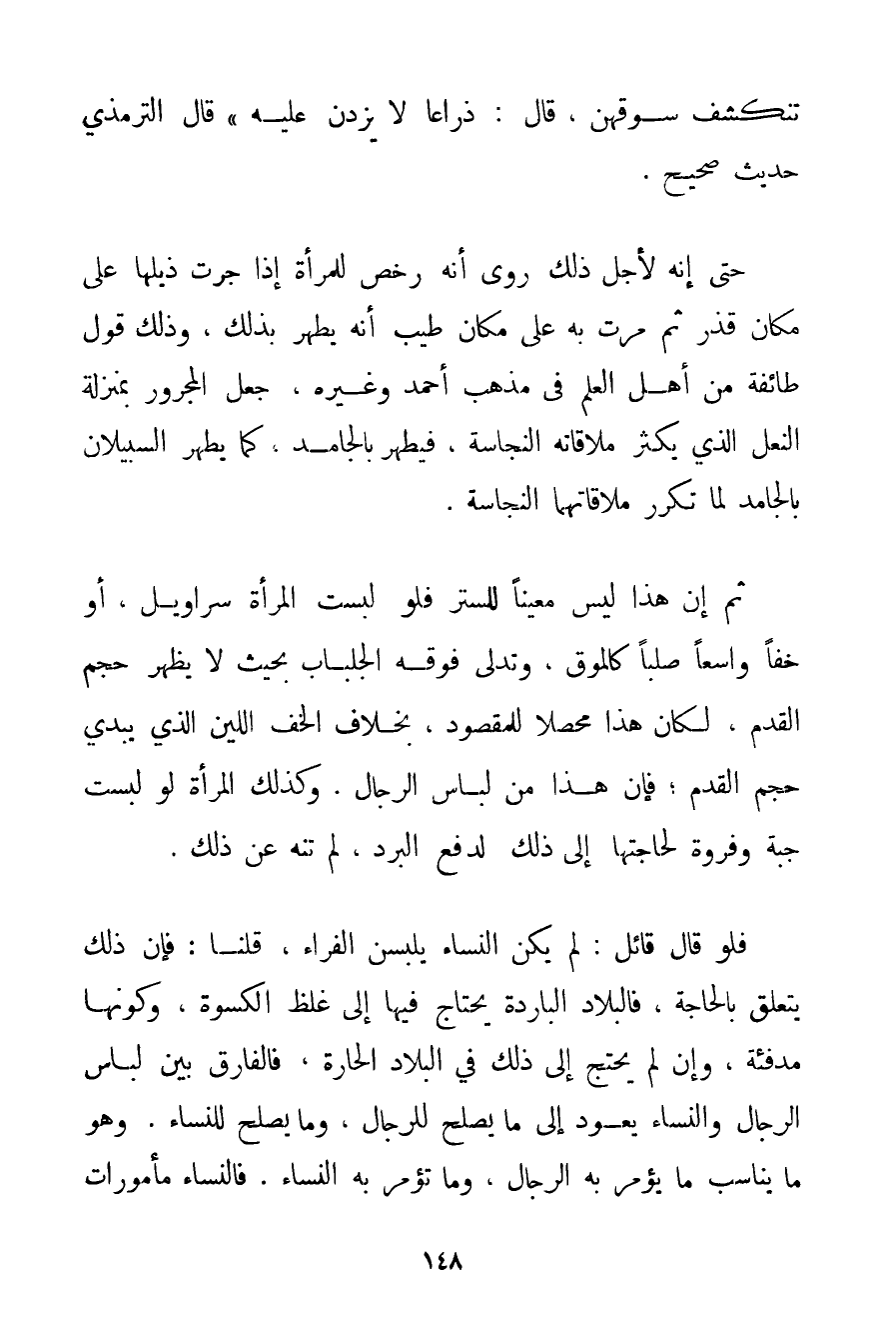 تَنْكَشِفَ سُوقُهُنَّ قَالَ: ذِرَاعًا لَا يَزِدْنَ عَلَيْهِ} قَالَ التِّرْمِذِيُّ حَدِيثٌ صَحِيحٌ. حَتَّى إنَّهُ لِأَجْلِ ذَلِكَ رُوِيَ أَنَّهُ رَخَّصَ لِلْمَرْأَةِ إذَا جَرَّتْ ذَيْلَهَا عَلَى مَكَانٍ قَذِرٍ ثُمَّ مَرَّتْ بِهِ عَلَى مَكَانٍ طَيِّبٍ أَنَّهُ يَطْهُرُ بِذَلِكَ وَذَلِكَ قَوْلُ طَائِفَةٍ مِنْ أَهْلِ الْعِلْمِ فِي مَذْهَبِ أَحْمَد وَغَيْرِهِ جَعَلَ الْمَجْرُورَ بِمَنْزِلَةِ النَّعْلِ الَّذِي يَكْثُرُ مُلَاقَاتُهُ النَّجَاسَةَ فَيَطْهُرُ بِالْجَامِدِ كَمَا يَطْهُرُ السَّبِيلَانِ بِالْجَامِدِ لِمَا تَكَرَّرَ مُلَاقَاتُهُمَا النَّجَاسَةَ. ثُمَّ إنَّ هَذَا لَيْسَ مُعِينًا لِلسَّتْرِ فَلَوْ لَبِسَتْ الْمَرْأَةُ سَرَاوِيلَ أَوْ خُفًّا وَاسِعًا صُلْبًا كَالْمُوقِ وَتَدَلَّى فَوْقَهُ الْجِلْبَابُ بِحَيْثُ لَا يَظْهَرُ حَجْمُ الْقَدَمِ لَكَانَ هَذَا مُحَصِّلًا لِلْمَقْصُودِ بِخِلَافِ الْخُفِّ اللَّيِّنِ الَّذِي يُبْدِي حَجْمَ الْقَدَمِ؛ فَإِنَّ هَذَا مِنْ لِبَاسِ الرِّجَالِ. وَكَذَلِكَ الْمَرْأَةُ لَوْ لَبِسَتْ جُبَّةً وَفَرْوَةً لِحَاجَتِهَا إلَى ذَلِكَ إلَى دَفْعِ الْبَرْدِ لَمْ تَنْهَ عَنْ ذَلِكَ. فَلَوْ قَالَ قَائِلٌ: لَمْ يَكُنْ النِّسَاءُ يَلْبَسْنَ الْفِرَاءَ قُلْنَا: فَإِنَّ ذَلِكَ يَتَعَلَّقُ بِالْحَاجَةِ فَالْبِلَادُ الْبَارِدَةُ يَحْتَاجُ فِيهَا إلَى غِلَظِ الْكُسْوَةِ وَكَوْنِهَا مُدَفِّئَةً وَإِنْ لَمْ يُحْتَجْ إلَى ذَلِكَ فِي الْبِلَادِ الْحَارَّةِ فَالْفَارِقُ بَيْنَ لِبَاسِ الرِّجَالِ وَالنِّسَاءِ يَعُودُ إلَى مَا يَصْلُحُ لِلرِّجَالِ وَمَا يَصْلُحُ لِلنِّسَاءِ. وَهُوَ مَا يُنَاسِبُ مَا يُؤْمَرُ بِهِ الرِّجَالُ وَمَا تُؤْمَرُ بِهِ النِّسَاءُ. فَالنِّسَاءُ مَأْمُورَاتٌ