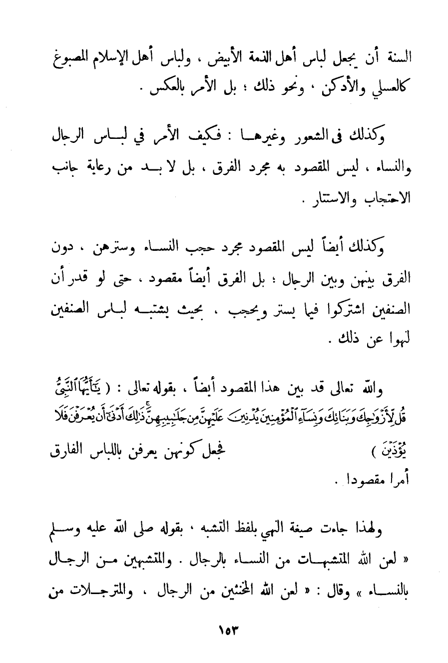مِنْ السُّنَّةِ أَنْ يُجْعَلَ لِبَاسُ أَهْلِ الذِّمَّةِ الْأَبْيَضَ وَلِبَاسُ أَهْلِ الْإِسْلَامِ الْمَصْبُوغَ كَالْعَسَلِيِّ وَالْأَدْكَنِ وَنَحْوِ ذَلِكَ بَلْ الْأَمْرُ بِالْعَكْسِ. كَذَلِكَ فِي الشُّعُورِ وَغَيْرِهَا: فَكَيْفَ الْأَمْرُ فِي لِبَاسِ الرِّجَالِ وَالنِّسَاءِ لَيْسَ الْمَقْصُودُ بِهِ مُجَرَّدَ الْفَرْقِ بَلْ لَا بُدَّ مِنْ رِعَايَةِ جَانِبِ الِاحْتِجَابِ وَالِاسْتِتَارِ. وَكَذَلِكَ أَيْضًا لَيْسَ الْمَقْصُودُ مُجَرَّدَ حَجْبِ النِّسَاءِ وَسَتْرِهِنَّ دُونَ الْفَرْقِ بَيْنَهُنَّ وَبَيْنَ الرِّجَالِ؛ بَلْ الْفَرْقُ أَيْضًا مَقْصُودٌ حَتَّى لَوْ قُدِّرَ أَنَّ الصِّنْفَيْنِ اشْتَرَكُوا فِيمَا يَسْتُرُ وَيَحْجُبُ بِحَيْثُ يُشْتَبَهُ لِبَاسُ الصِّنْفَيْنِ لَنُهُوا عَنْ ذَلِكَ. وَاَللَّهُ تَعَالَى قَدْ بَيَّنَ هَذَا الْمَقْصُودَ أَيْضًا بِقَوْلِهِ تَعَالَى: {يَا أَيُّهَا النَّبِيُّ قُلْ لِأَزْوَاجِكَ وَبَنَاتِكَ وَنِسَاءِ الْمُؤْمِنِينَ يُدْنِينَ عَلَيْهِنَّ مِنْ جَلَابِيبِهِنَّ ذَلِكَ أَدْنَى أَنْ يُعْرَفْنَ فَلَا يُؤْذَيْنَ} فَجَعَلَ كَوْنَهُنَّ يُعْرَفْنَ بِاللِّبَاسِ الْفَارِقِ أَمْرًا مَقْصُودًا. وَلِهَذَا جَاءَتْ صِيغَةُ النَّهْيِ بِلَفْظِ التَّشَبُّهِ بِقَوْلِهِ صَلَّى اللَّهُ عَلَيْهِ وَسَلَّمَ " {لَعَنَ اللَّهُ الْمُتَشَبِّهَاتِ مِنْ النِّسَاءِ بِالرِّجَالِ. والمتشبهين مِنْ الرِّجَالِ بِالنِّسَاءِ} " وَقَالَ: " {لَعَنَ اللَّهُ الْمُخَنَّثِينَ مِنْ الرِّجَالِ والمترجلات مِنْ