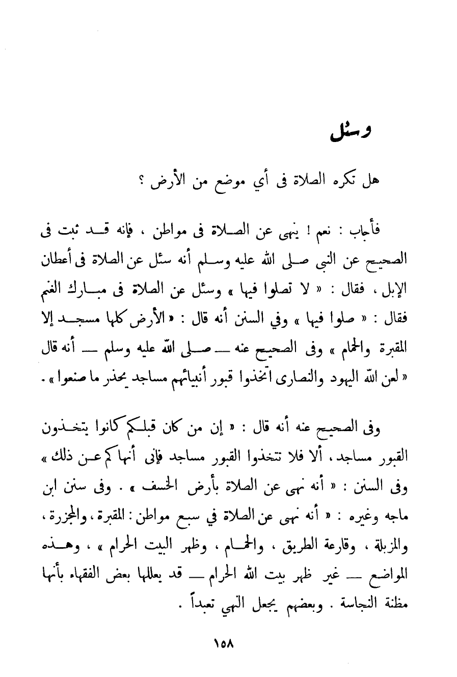 نَعَمْ يُنْهَى عَنْ الصَّلَاةِ فِي مُوَاطِنَ فَإِنَّهُ قَدْ ثَبَتَ فِي الصَّحِيحِ عَنْ النَّبِيِّ صَلَّى اللَّهُ عَلَيْهِ وَسَلَّمَ أَنَّهُ سُئِلَ عَنْ الصَّلَاةِ فِي أَعْطَانِ الْإِبِلِ فَقَالَ: " {لَا تُصَلُّوا فِيهَا} وَسُئِلَ عَنْ الصَّلَاةِ فِي مَبَارِكِ الْغَنَمِ فَقَالَ: " {صَلُّوا فِيهَا} وَفِي السُّنَنِ أَنَّهُ قَالَ: " {الْأَرْضُ كُلُّهَا مَسْجِدٌ إلَّا الْمَقْبَرَةُ وَالْحَمَّامُ} وَفِي الصَّحِيحِ عَنْهُ - صَلَّى اللَّهُ عَلَيْهِ وَسَلَّمَ - أَنَّهُ قَالَ " {لَعَنَ اللَّهُ الْيَهُودَ وَالنَّصَارَى اتَّخَذُوا قُبُورَ أَنْبِيَائِهِمْ مَسَاجِدَ يُحَذِّرُ مَا صَنَعُوا} . وَفِي الصَّحِيحِ عَنْهُ أَنَّهُ قَالَ: " {إنَّ مَنْ كَانَ قَبْلَكُمْ كَانُوا يَتَّخِذُونَ الْقُبُورَ مَسَاجِدَ أَلَا فَلَا تَتَّخِذُوا الْقُبُورَ مَسَاجِدَ فَإِنِّي أَنْهَاكُمْ عَنْ ذَلِكَ} وَفِي السُّنَنِ: " {أَنَّهُ نَهَى عَنْ الصَّلَاةِ بِأَرْضِ الْخَسْفِ} . وَفِي سُنَنِ ابْنِ مَاجَه وَغَيْرِهِ: " {أَنَّهُ نَهَى عَنْ الصَّلَاةِ فِي سَبْعِ مَوَاطِنَ: الْمَقْبَرَةِ وَالْمَجْزَرَةِ وَالْمَزْبَلَةِ وَقَارِعَةِ الطَّرِيقِ وَالْحَمَّامِ وَظَهْرِ الْبَيْتِ الْحَرَامِ} وَهَذِهِ الْمَوَاضِعُ - غَيْرُ ظَهْرِ بَيْتِ اللَّهِ الْحَرَامِ - قَدْ يُعَلِّلُهَا بَعْضُ الْفُقَهَاءِ بِأَنَّهَا مَظِنَّةُ النَّجَاسَةِ. وَبَعْضُهُمْ يَجْعَلُ النَّهْيَ تَعَبُّدًا.