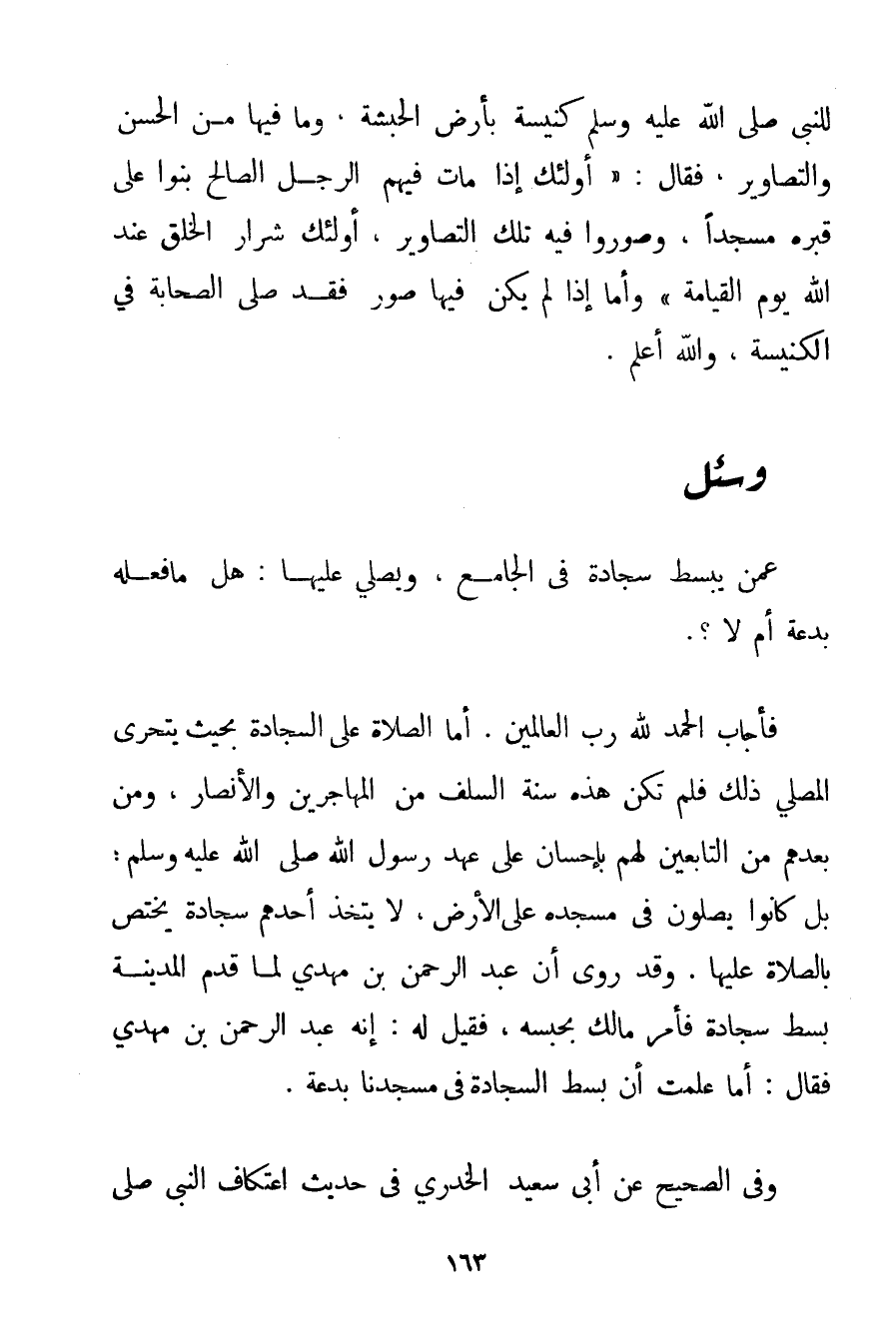 الْحَمْدُ لِلَّهِ رَبِّ الْعَالَمِينَ، أَمَّا الصَّلَاةُ عَلَى السَّجَّادَةِ بِحَيْثُ يَتَحَرَّى الْمُصَلِّي ذَلِكَ فَلَمْ تَكُنْ هَذِهِ سُنَّةَ السَّلَفِ مِنْ الْمُهَاجِرِينَ وَالْأَنْصَارِ وَمَنْ بَعْدَهُمْ مِنْ التَّابِعِينَ لَهُمْ بِإِحْسَانِ عَلَى عَهْدِ رَسُولِ اللَّهِ صَلَّى اللَّهُ عَلَيْهِ وَسَلَّمَ بَلْ كَانُوا يُصَلُّونَ فِي مَسْجِدِهِ عَلَى الْأَرْضِ لَا يَتَّخِذُ أَحَدُهُمْ سَجَّادَةً يَخْتَصُّ بِالصَّلَاةِ عَلَيْهَا. وَقَدْ رُوِيَ أَنَّ عَبْدَ الرَّحْمَنِ بْنَ مَهْدِيٍّ لَمَّا قَدِمَ الْمَدِينَةَ بَسَطَ سَجَّادَةً فَأَمَرَ مَالِكٌ بِحَبْسِهِ فَقِيلَ لَهُ: إنَّهُ عَبْدُ الرَّحْمَنِ بْنُ مَهْدِيٍّ فَقَالَ: أَمَا عَلِمْت أَنَّ بَسْطَ السَّجَّادَةِ فِي مَسْجِدِنَا بِدْعَةٌ. وَفِي الصَّحِيحِ عَنْ أَبِي سَعِيدٍ الخدري فِي حَدِيثِ اعْتِكَافِ النَّبِيِّ