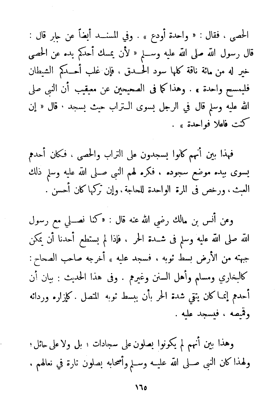 الْحَصَى فَقَالَ: وَاحِدَةٌ أَوْ دَعْ} . وَفِي الْمُسْنَدِ أَيْضًا عَنْ جَابِرٍ قَالَ: قَالَ رَسُولُ اللَّهِ صَلَّى اللَّهُ عَلَيْهِ وَسَلَّمَ " {لَأَنْ يُمْسِكَ أَحَدُكُمْ يَدَهُ عَنْ الْحَصَى خَيْرٌ لَهُ مِنْ مِائَةِ نَاقَةٍ كُلِّهَا سُودُ الْحَدَقِ فَإِنْ غَلَبَ أَحَدَكُمْ الشَّيْطَانُ فَلْيَمْسَحْ وَاحِدَةً} . وَهَذَا كَمَا فِي الصَّحِيحَيْنِ عَنْ معيقيب أَنَّ النَّبِيَّ صَلَّى اللَّهُ عَلَيْهِ وَسَلَّمَ {قَالَ فِي الرَّجُلِ يُسَوِّي التُّرَابَ حَيْثُ يَسْجُدُ قَالَ إنْ كُنْت فَاعِلًا فَوَاحِدَةً} . فَهَذَا بَيَّنَ أَنَّهُمْ كَانُوا يَسْجُدُونَ عَلَى التُّرَابِ وَالْحَصَى فَكَانَ أَحَدُهُمْ يُسَوِّي بِيَدِهِ مَوْضِعَ سُجُودِهِ فَكَرِهَ لَهُمْ النَّبِيُّ صَلَّى اللَّهُ عَلَيْهِ وَسَلَّمَ ذَلِكَ الْعَبَثَ وَرَخَّصَ فِي الْمَرَّةِ الْوَاحِدَةِ لِلْحَاجَةِ وَإِنْ تَرَكَهَا كَانَ أَحْسَنَ. وَعَنْ أَنَسِ بْنِ مَالِكٍ رَضِيَ اللَّهُ عَنْهُ قَالَ: " {كُنَّا نُصَلِّي مَعَ رَسُولِ اللَّهِ صَلَّى اللَّهُ عَلَيْهِ وَسَلَّمَ فِي شِدَّةِ الْحَرِّ فَإِذَا لَمْ يَسْتَطِعْ أَحَدُنَا أَنْ يُمَكِّنَ جَبْهَتَهُ مِنْ الْأَرْضِ بَسَطَ ثَوْبَهُ فَسَجَدَ عَلَيْهِ} أَخْرَجَهُ صَاحِبُ الصِّحَاحِ: كَالْبُخَارِيِّ وَمُسْلِمٍ وَأَهْلُ السُّنَنِ وَغَيْرُهُمْ. وَفِي هَذَا الْحَدِيثِ: بَيَانُ أَنَّ أَحَدَهُمْ إنَّمَا كَانَ يَتَّقِي شِدَّةَ الْحَرِّ بِأَنْ يَبْسُطَ ثَوْبَهُ الْمُتَّصِلَ. كَإِزَارِهِ وَرِدَائِهِ وَقَمِيصِهِ فَيَسْجُدُ عَلَيْهِ. وَهَذَا بَيَّنَ أَنَّهُمْ لَمْ يَكُونُوا يُصَلُّونَ عَلَى سَجَّادَاتٍ؛ بَلْ وَلَا عَلَى حَائِلٍ؛ وَلِهَذَا كَانَ النَّبِيُّ صَلَّى اللَّهُ عَلَيْهِ وَسَلَّمَ وَأَصْحَابُهُ يُصَلُّونَ تَارَةً فِي نِعَالِهِمْ