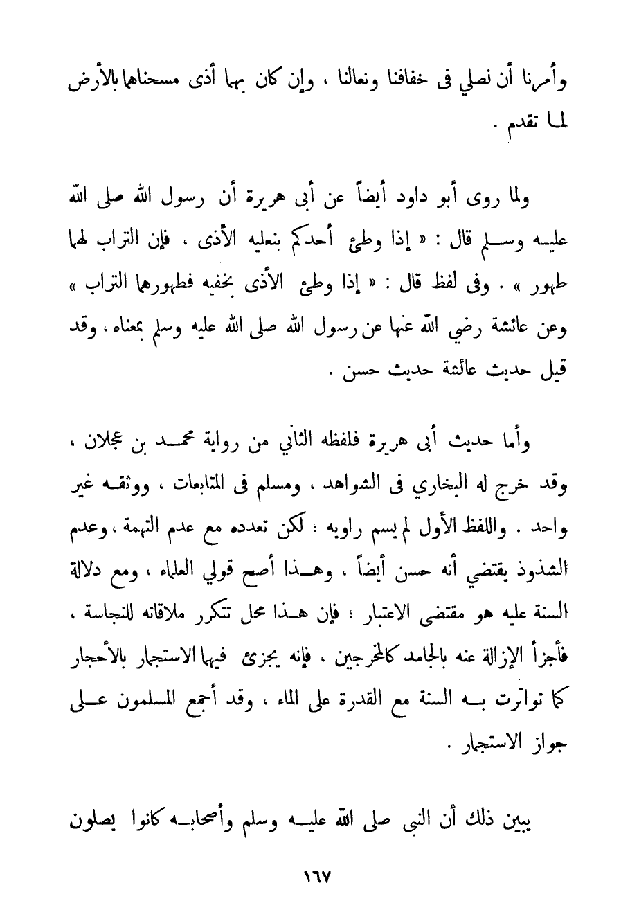 وَأُمِرْنَا أَنْ نُصَلِّيَ فِي خِفَافِنَا وَنِعَالِنَا وَإِنْ كَانَ بِهِمَا أَذًى مَسَحْنَاهُمَا بِالْأَرْضِ لِمَا تَقَدَّمَ. وَلِمَا رَوَى أَبُو دَاوُد أَيْضًا عَنْ أَبِي هُرَيْرَةَ أَنَّ رَسُولَ اللَّهِ صَلَّى اللَّهُ عَلَيْهِ وَسَلَّمَ قَالَ: " {إذَا وَطِئَ أَحَدُكُمْ بِنَعْلَيْهِ الْأَذَى فَإِنَّ التُّرَابَ لَهُمَا طَهُورٌ} . وَفِي لَفْظٍ قَالَ: " {إذَا وَطِئَ الْأَذَى بِخُفَّيْهِ فَطَهُورُهُمَا التُّرَابُ} وَعَنْ عَائِشَةَ رَضِيَ اللَّهُ عَنْهَا عَنْ رَسُولِ اللَّهِ صَلَّى اللَّهُ عَلَيْهِ وَسَلَّمَ بِمَعْنَاهُ وَقَدْ قِيلَ حَدِيثُ عَائِشَةَ حَدِيثٌ حَسَنٌ. وَأَمَّا حَدِيثُ أَبِي هُرَيْرَةَ فَلَفْظُهُ الثَّانِي مِنْ رِوَايَةِ مُحَمَّدِ بْنِ عَجْلَان وَقَدْ خَرَّجَ لَهُ الْبُخَارِيُّ فِي الشَّوَاهِدِ وَمُسْلِمٌ فِي الْمُتَابَعَاتِ وَوَثَّقَهُ غَيْرُ وَاحِدٍ. وَاللَّفْظُ الْأَوَّلُ لَمْ يُسَمَّ رَاوِيهِ؛ لَكِنَّ تَعَدُّدَهُ مَعَ عَدَمِ التُّهْمَةِ وَعَدَمِ الشُّذُوذِ يَقْتَضِي أَنَّهُ حَسَنٌ أَيْضًا وَهَذَا أَصَحُّ قَوْلِي الْعُلَمَاءِ وَمَعَ دَلَالَةِ السُّنَّةِ عَلَيْهِ هُوَ مُقْتَضَى الِاعْتِبَارِ؛ فَإِنَّ هَذَا مَحَلٌّ تَتَكَرَّرُ مُلَاقَاتُهُ لِلنَّجَاسَةِ فَأَجْزَأَ الْإِزَالَةَ عَنْهُ بِالْجَامِدِ كَالْمَخْرَجَيْنِ فَإِنَّهُ يُجْزِئُ فِيهِمَا الِاسْتِجْمَارُ بِالْأَحْجَارِ كَمَا تَوَاتَرَتْ بِهِ السُّنَّةُ مَعَ الْقُدْرَةِ عَلَى الْمَاءِ وَقَدْ أَجْمَعَ الْمُسْلِمُونَ عَلَى جَوَازِ الِاسْتِجْمَارِ. يُبَيِّنُ ذَلِكَ أَنَّ النَّبِيَّ صَلَّى اللَّهُ عَلَيْهِ وَسَلَّمَ وَأَصْحَابَهُ كَانُوا يُصَلُّونَ