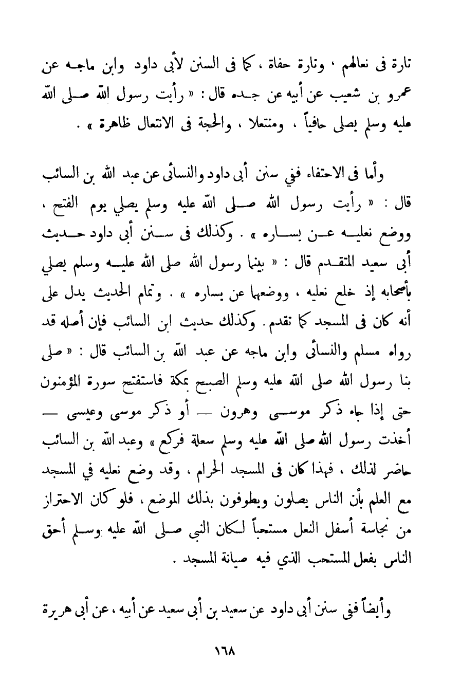 تَارَةً فِي نِعَالِهِمْ وَتَارَةً حُفَاةً كَمَا فِي السُّنَنِ لِأَبِي دَاوُد وَابْنِ مَاجَه عَنْ عَمْرِو بْنِ شُعَيْبٍ عَنْ أَبِيهِ عَنْ جَدِّهِ قَالَ: " {رَأَيْت رَسُولَ اللَّهِ صَلَّى اللَّهُ عَلَيْهِ وَسَلَّمَ يُصَلِّي حَافِيًا وَمُنْتَعِلًا} وَالْحُجَّةُ فِي الِانْتِعَالِ ظَاهِرَةٌ ". وَأَمَّا فِي الِاحْتِفَاءِ فَفِي سُنَنِ أَبِي دَاوُد وَالنَّسَائِي عَنْ عَبْدِ اللَّهِ بْنِ السَّائِبِ قَالَ. " {رَأَيْت رَسُولَ اللَّهِ صَلَّى اللَّهُ عَلَيْهِ وَسَلَّمَ يُصَلِّي يَوْمَ الْفَتْحِ وَوَضَعَ نَعْلَيْهِ عَنْ يَسَارِهِ} وَكَذَلِكَ فِي سُنَنِ أَبِي دَاوُد حَدِيثُ أَبِي سَعِيدٍ الْمُتَقَدِّمِ قَالَ: " {بَيْنَمَا رَسُولُ صَلَّى اللَّهُ عَلَيْهِ وَسَلَّمَ اللَّهِ يُصَلِّي بِأَصْحَابِهِ إذْ خَلَعَ نَعْلَيْهِ وَوَضَعَهُمَا عَنْ يَسَارِهِ} . وَتَمَامُ الْحَدِيثِ يَدُلُّ عَلَى أَنَّهُ كَانَ فِي الْمَسْجِدِ كَمَا تَقَدَّمَ. كَذَلِكَ حَدِيثُ ابْنِ السَّائِبِ فَإِنَّ أَصْلَهُ قَدْ رَوَاهُ مُسْلِمٌ وَالنَّسَائِي وَابْنُ مَاجَه عَنْ عَبْدِ اللَّهِ بْنِ السَّائِبِ قَالَ: " {صَلَّى بِنَا رَسُولُ اللَّهِ صَلَّى اللَّهُ عَلَيْهِ وَسَلَّمَ الصُّبْحَ بِمَكَّةَ فَاسْتَفْتَحَ سُورَةَ الْمُؤْمِنُونَ حَتَّى إذَا جَاءَ ذِكْرُ مُوسَى وَهَارُونَ - أَوْ ذِكْرُ مُوسَى وَعِيسَى - أَخَذَتْ رَسُولَ اللَّهِ صَلَّى اللَّهُ عَلَيْهِ وَسَلَّمَ سَعْلَةٌ فَرَكَعَ} وَعَبْدُ اللَّهِ بْنُ السَّائِبِ حَاضِرٌ لِذَلِكَ فَهَذَا كَانَ فِي الْمَسْجِدِ الْحَرَامِ وَقَدْ وَضَعَ نَعْلَيْهِ فِي الْمَسْجِدِ مَعَ الْعِلْمِ بِأَنَّ النَّاسَ يُصَلُّونَ وَيَطُوفُونَ بِذَلِكَ الْمَوْضِعِ فَلَوْ كَانَ الِاحْتِرَازُ مِنْ نَجَاسَةٍ أَسْفَلَ النَّعْلِ مُسْتَحَبًّا لَكَانَ النَّبِيُّ صَلَّى اللَّهُ عَلَيْهِ وَسَلَّمَ أَحَقَّ النَّاسِ بِفِعْلِ الْمُسْتَحَبِّ الَّذِي فِيهِ صِيَانَةُ الْمَسْجِدِ. وَأَيْضًا فَفِي سُنَنِ أَبِي دَاوُد عَنْ سَعِيدِ بْنِ أَبِي سَعِيدٍ عَنْ أَبِيهِ عَنْ أَبِي هُرَيْرَةَ