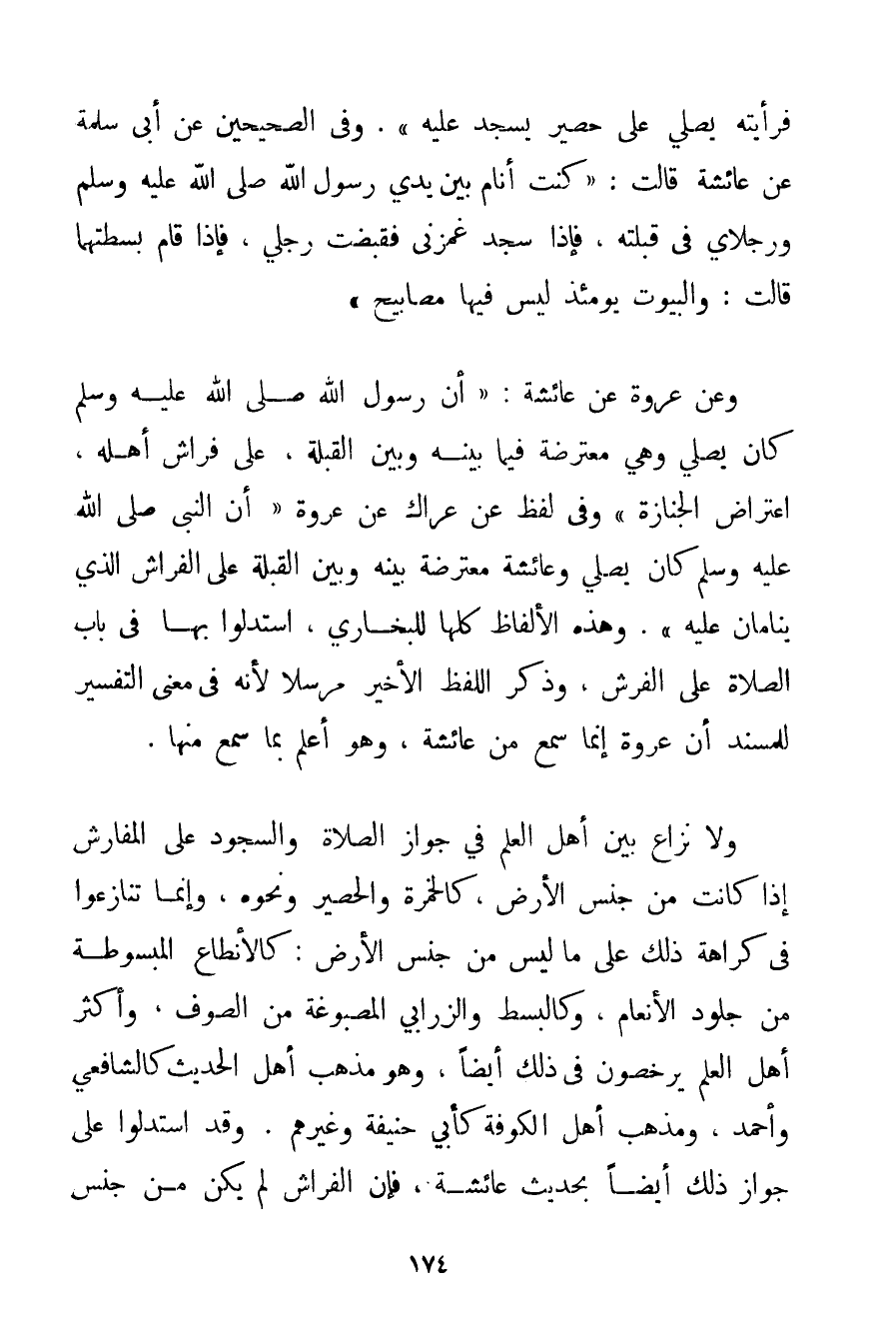 فَرَأَيْته يُصَلِّي عَلَى حَصِيرٍ يَسْجُدُ عَلَيْهِ} . وَفِي الصَّحِيحَيْنِ عَنْ أَبِي سَلَمَةَ عَنْ عَائِشَةَ قَالَتْ: " {كُنْت أَنَامُ بَيْنَ يَدَيْ رَسُولِ اللَّهِ صَلَّى اللَّهُ عَلَيْهِ وَسَلَّمَ وَرِجْلَايَ فِي قِبْلَتِهِ فَإِذَا سَجَدَ غَمَزَنِي فَقَبَضْت رِجْلَيَّ فَإِذَا قَامَ بَسَطْتهمَا قَالَتْ: وَالْبُيُوتُ يَوْمَئِذٍ لَيْسَ فِيهَا مَصَابِيحُ} وَعَنْ عُرْوَةَ عَنْ عَائِشَةَ: " {أَنَّ رَسُولَ اللَّهِ صَلَّى اللَّهُ عَلَيْهِ وَسَلَّمَ كَانَ يُصَلِّي وَهِيَ مُعْتَرِضَةٌ فِيمَا بَيْنَهُ وَبَيْنَ الْقِبْلَةِ عَلَى فِرَاشِ أَهْلِهِ اعْتِرَاضَ الْجِنَازَةِ} وَفِي لَفْظٍ عَنْ عِرَاكٍ عَنْ عُرْوَةَ " {أَنَّ النَّبِيَّ صَلَّى اللَّهُ عَلَيْهِ وَسَلَّمَ كَانَ يُصَلِّي وَعَائِشَةُ مُعْتَرِضَةٌ بَيْنَهُ وَبَيْنَ الْقِبْلَةِ عَلَى الْفِرَاشِ الَّذِي يَنَامَانِ عَلَيْهِ} . وَهَذِهِ الْأَلْفَاظُ كُلُّهَا لِلْبُخَارِيِّ اسْتَدَلُّوا بِهَا فِي بَابِ الصَّلَاةِ عَلَى الْفَرْشِ وَذُكِرَ اللَّفْظُ الْأَخِيرُ مُرْسَلًا لِأَنَّهُ فِي مَعْنَى التَّفْسِيرِ لِلْمُسْنَدِ أَنَّ عُرْوَةَ إنَّمَا سَمِعَ مِنْ عَائِشَةَ وَهُوَ أَعْلَمُ بِمَا سَمِعَ مِنْهَا. وَلَا نِزَاعَ بَيْنَ أَهْلِ الْعِلْمِ فِي جَوَازِ الصَّلَاةِ وَالسُّجُودِ عَلَى الْمَفَارِشِ إذَا كَانَتْ مِنْ جِنْسِ الْأَرْضِ كَالْخُمْرَةِ وَالْحَصِيرِ وَنَحْوِهِ وَإِنَّمَا تَنَازَعُوا فِي كَرَاهَةِ ذَلِكَ عَلَى مَا لَيْسَ مِنْ جِنْسِ الْأَرْضِ: كَالْأَنْطَاعِ الْمَبْسُوطَةِ مِنْ جُلُودِ الْأَنْعَامِ وَكَالْبُسُطِ وَالزَّرَابِيِّ الْمَصْبُوغَةِ مِنْ الصُّوفِ وَأَكْثَرُ أَهْلِ الْعِلْمِ يُرَخِّصُونَ فِي ذَلِكَ أَيْضًا وَهُوَ مَذْهَبُ أَهْلِ الْحَدِيثِ كَالشَّافِعِيِّ وَأَحْمَد وَمَذْهَبُ أَهْلِ الْكُوفَةِ كَأَبِي حَنِيفَةَ وَغَيْرِهِمْ. وَقَدْ اسْتَدَلُّوا عَلَى جَوَازِ ذَلِكَ أَيْضًا بِحَدِيثِ عَائِشَةَ فَإِنَّ الْفِرَاشَ لَمْ يَكُنْ مِنْ جِنْسِ