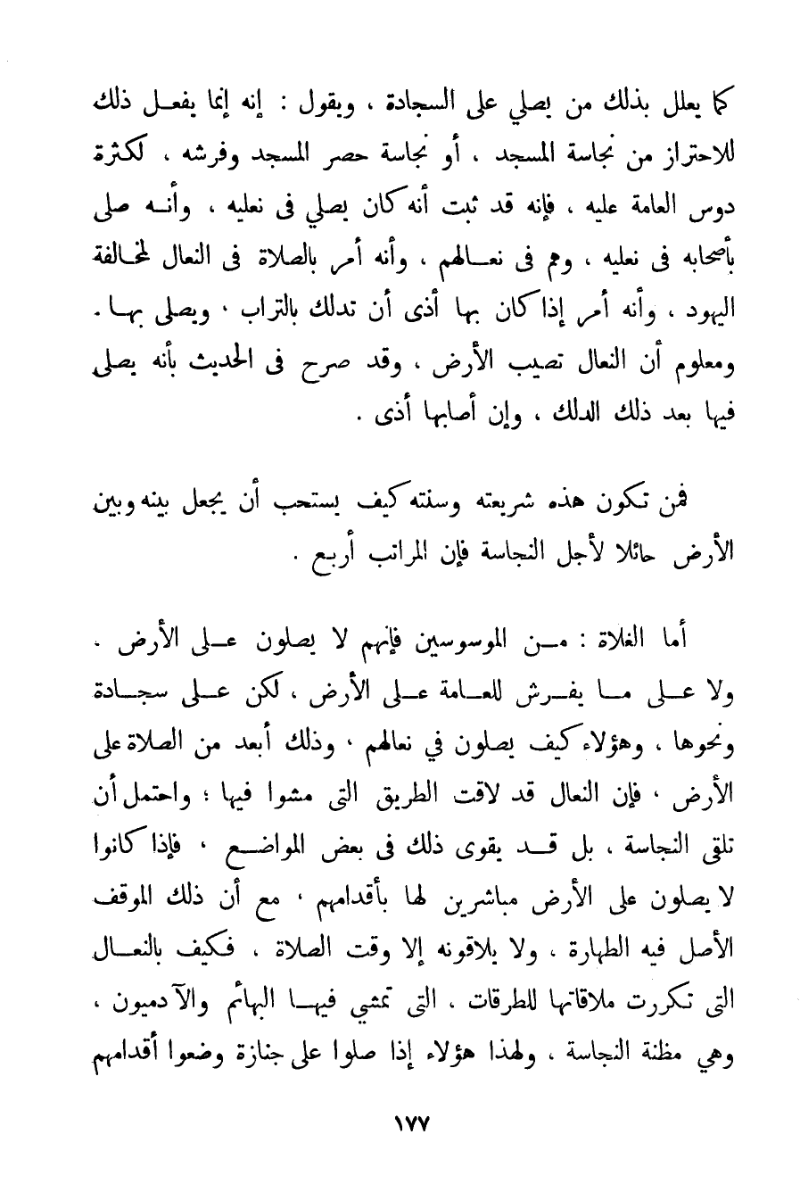 كَمَا يُعَلِّلُ بِذَلِكَ مَنْ يُصَلِّي عَلَى السَّجَّادَةِ وَيَقُولُ: إنَّهُ إنَّمَا يُفْعَلُ ذَلِكَ لِلِاحْتِرَازِ مِنْ نَجَاسَةِ الْمَسْجِدِ أَوْ نَجَاسَةِ حُصْرِ الْمَسْجِدِ وَفُرُشِهِ لِكَثْرَةِ دَوْسِ الْعَامَّةِ عَلَيْهِ فَإِنَّهُ قَدْ ثَبَتَ أَنَّهُ كَانَ يُصَلِّي فِي نَعْلَيْهِ وَأَنَّهُ صَلَّى بِأَصْحَابِهِ فِي نَعْلَيْهِ وَهُمْ فِي نِعَالِهِمْ وَأَنَّهُ أَمَرَ بِالصَّلَاةِ فِي النِّعَالِ لِمُخَالَفَةِ الْيَهُودِ وَأَنَّهُ أَمَرَ إذَا كَانَ بِهَا أَذًى أَنْ تُدَلَّكَ بِالتُّرَابِ وَيُصَلَّى بِهَا. وَمَعْلُومٌ أَنَّ النِّعَالَ تُصِيبُ الْأَرْضَ وَقَدْ صَرَّحَ فِي الْحَدِيثِ بِأَنَّهُ يُصَلِّي فِيهَا بَعْدَ ذَلِكَ الدَّلْكِ وَإِنْ أَصَابَهَا أَذًى. فَمَنْ تَكُونُ هَذِهِ شَرِيعَتُهُ وَسُنَّتُهُ كَيْفَ يُسْتَحَبُّ أَنْ يَجْعَلَ بَيْنَهُ وَبَيْنَ الْأَرْضِ حَائِلًا لِأَجْلِ النَّجَاسَةِ فَإِنَّ الْمَرَاتِبَ أَرْبَعٌ. أَمَّا الْغُلَاةُ: مِنْ الْمُوَسْوِسِينَ فَإِنَّهُمْ لَا يُصَلُّونَ عَلَى الْأَرْضِ وَلَا عَلَى مَا يُفْرَشُ لِلْعَامَّةِ عَلَى الْأَرْضِ لَكِنْ عَلَى سَجَّادَةٍ وَنَحْوِهَا وَهَؤُلَاءِ كَيْفَ يُصَلُّونَ فِي نِعَالِهِمْ وَذَلِكَ أَبْعَدُ مِنْ الصَّلَاةِ عَلَى الْأَرْضِ فَإِنَّ النِّعَالَ قَدْ لَاقَتْ الطَّرِيقَ الَّتِي مَشَوْا فِيهَا؛ وَاحْتَمَلَ أَنْ تَلْقَى النَّجَاسَةَ بَلْ قَدْ يَقْوَى ذَلِكَ فِي بَعْضِ الْمَوَاضِعِ فَإِذَا كَانُوا لَا يُصَلُّونَ عَلَى الْأَرْضِ مُبَاشِرِينَ لَهَا بِأَقْدَامِهِمْ مَعَ أَنَّ ذَلِكَ الْمَوْقِفَ الْأَصْلُ فِيهِ الطَّهَارَةُ وَلَا يُلَاقُونَهُ إلَّا وَقْتَ الصَّلَاةِ فَكَيْفَ بِالنِّعَالِ الَّتِي تَكَرَّرَتْ مُلَاقَاتُهَا لِلطُّرُقَاتِ الَّتِي تَمْشِي فِيهَا الْبَهَائِمُ وَالْآدَمِيُّونَ وَهِيَ مَظِنَّةُ النَّجَاسَةِ وَلِهَذَا هَؤُلَاءِ إذَا صَلَّوْا عَلَى جِنَازَةٍ وَضَعُوا أَقْدَامَهُمْ