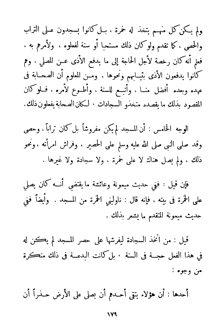 وَلَمْ يَكُنْ كُلٌّ مِنْهُمْ يَتَّخِذُ لَهُ خُمْرَةً بَلْ كَانُوا يَسْجُدُونَ عَلَى التُّرَابِ وَالْحَصَى كَمَا تَقَدَّمَ وَلَوْ كَانَ ذَلِكَ مُسْتَحَبًّا أَوْ سُنَّةً لَفَعَلُوهُ وَلَأَمَرَهُمْ بِهِ فَعُلِمَ أَنَّهُ كَانَ رُخْصَةً لِأَجْلِ الْحَاجَةِ إلَى مَا يَدْفَعُ الْأَذَى عَنْ الْمُصَلِّي وَهُمْ كَانُوا يَدْفَعُونَ الْأَذَى بِثِيَابِهِمْ وَنَحْوِهَا وَمِنْ الْمَعْلُومِ أَنَّ الصَّحَابَةَ فِي عَهْدِهِ وَبَعْدَهُ أَفْضَلُ مِنَّا وَأَتْبَعُ لِلسُّنَّةِ وَأَطْوَعُ لِأَمْرِهِ فَلَوْ كَانَ الْمَقْصُودُ بِذَلِكَ مَا يَقْصِدُهُ مُتَّخِذُو السَّجَّادَاتِ لَكَانَ الصَّحَابَةُ يَفْعَلُونَ ذَلِكَ. الْوَجْهُ الْخَامِسُ: أَنَّ الْمَسْجِدَ لَمْ يَكُنْ مَفْرُوشًا بَلْ كَانَ تُرَابًا وَحَصًى وَقَدْ صَلَّى النَّبِيُّ صَلَّى اللَّهُ عَلَيْهِ وَسَلَّمَ عَلَى الْحَصِيرِ وَفِرَاشِ امْرَأَتِهِ وَنَحْوِ ذَلِكَ وَلَمْ يُصَلِّ هُنَاكَ لَا عَلَى خُمْرَةٍ وَلَا سَجَّادَةٍ وَلَا غَيْرِهَا. فَإِنْ قِيلَ: فَفِي حَدِيثِ مَيْمُونَةَ وَعَائِشَةَ مَا يَقْتَضِي أَنَّهُ كَانَ يُصَلِّي عَلَى الْخُمْرَةِ فِي بَيْتِهِ فَإِنَّهُ قَالَ: نَاوِلِينِي الْخُمْرَةَ مِنْ الْمَسْجِدِ. وَأَيْضًا فَفِي حَدِيثِ مَيْمُونَةَ الْمُتَقَدِّمِ مَا يُشْعِرُ بِذَلِكَ. قِيلَ: مَنْ اتَّخَذَ السَّجَّادَةِ لِيَفْرِشْهَا عَلَى حُصْرِ الْمَسْجِدِ لَمْ يَكُنْ لَهُ فِي هَذَا الْفِعْلِ حُجَّةٌ فِي السُّنَّةِ بَلْ كَانَتْ الْبِدْعَةُ فِي ذَلِكَ مُنْكَرَةٌ مِنْ وُجُوهٍ: أَحَدُهَا: أَنَّ هَؤُلَاءِ يَتَّقِي أَحَدُهُمْ أَنْ يُصَلِّيَ عَلَى الْأَرْضِ حَذَرًا أَنْ