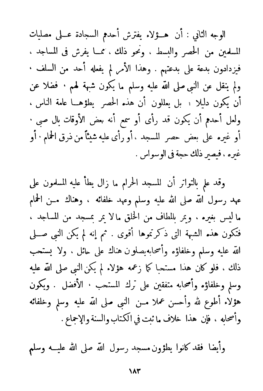 الْوَجْهُ الثَّانِي: أَنَّ هَؤُلَاءِ يَفْتَرِشُ أَحَدُهُمْ السَّجَّادَةَ عَلَى مُصَلَّيَاتِ الْمُسْلِمِينَ مِنْ الْحُصْرِ وَالْبُسُطِ وَنَحْوِ ذَلِكَ مِمَّا يُفْرَشُ فِي الْمَسَاجِدِ فَيَزْدَادُونَ بِدْعَةً عَلَى بِدْعَتِهِمْ. وَهَذَا الْأَمْرُ لَمْ يَفْعَلْهُ أَحَدٌ مِنْ السَّلَفِ وَلَمْ يُنْقَلْ عَنْ النَّبِيِّ صَلَّى اللَّهُ عَلَيْهِ وَسَلَّمَ مَا يَكُونُ شُبْهَةً لَهُمْ فَضْلًا عَنْ أَنْ يَكُونَ دَلِيلًا؛ بَلْ يُعَلِّلُونَ أَنَّ هَذِهِ الْحُصْرَ يَطَؤُهَا عَامَّةُ النَّاسِ وَلَعَلَّ أَحَدَهُمْ أَنْ يَكُونَ قَدْ رَأَى أَوْ سَمِعَ أَنَّهُ بَعْضَ الْأَوْقَاتِ بَالَ صَبِيٌّ أَوْ غَيْرُهُ عَلَى بَعْضِ حُصْرِ الْمَسْجِدِ أَوْ رَأَى عَلَيْهِ شَيْئًا مِنْ ذَرْقِ الْحَمَامِ. أَوْ غَيْرِهِ فَيَصِيرُ ذَلِكَ حُجَّةً فِي الْوَسْوَاسِ. وَقَدْ عُلِمَ بِالتَّوَاتُرِ أَنَّ الْمَسْجِدَ الْحَرَامَ مَا زَالَ يَطَأُ عَلَيْهِ الْمُسْلِمُونَ عَلَى عَهْدِ رَسُولِ اللَّهِ صَلَّى اللَّهُ عَلَيْهِ وَسَلَّمَ وَعَهْدِ خُلَفَائِهِ وَهُنَاكَ مِنْ الْحَمَامِ مَا لَيْسَ بِغَيْرِهِ وَيَمُرُّ بِالْمَطَافِ مِنْ الْخَلْقِ مَا لَا يَمُرُّ بِمَسْجِدِ مِنْ الْمَسَاجِدِ فَتَكُونُ هَذِهِ الشُّبْهَةُ الَّتِي ذَكَرْتُمُوهَا أَقْوَى. ثُمَّ إنَّهُ لَمْ يَكُنْ النَّبِيُّ صَلَّى اللَّهُ عَلَيْهِ وَسَلَّمَ وَخُلَفَاؤُهُ وَأَصْحَابُهُ يُصَلِّي هُنَاكَ عَلَى حَائِلٍ وَلَا يَسْتَحِبُّ ذَلِكَ فَلَوْ كَانَ هَذَا مُسْتَحَبًّا كَمَا زَعَمَهُ هَؤُلَاءِ لَمْ يَكُنْ النَّبِيُّ صَلَّى اللَّهُ عَلَيْهِ وَسَلَّمَ وَخُلَفَاؤُهُ وَأَصْحَابُهُ مُتَّفِقِينَ عَلَى تَرْكِ الْمُسْتَحَبِّ الْأَفْضَلِ. وَيَكُونُ هَؤُلَاءِ أَطْوَعَ لِلَّهِ وَأَحْسَنَ عَمَلًا مِنْ النَّبِيِّ صَلَّى اللَّهُ عَلَيْهِ وَسَلَّمَ وَخُلَفَائِهِ وَأَصْحَابِهِ فَإِنَّ هَذَا خِلَافَ مَا ثَبَتَ فِي الْكِتَابِ وَالسُّنَّةِ وَالْإِجْمَاعِ. وَأَيْضًا فَقَدْ كَانُوا يَطَؤُونَ مَسْجِدَ رَسُولِ اللَّهِ صَلَّى اللَّهُ عَلَيْهِ وَسَلَّمَ