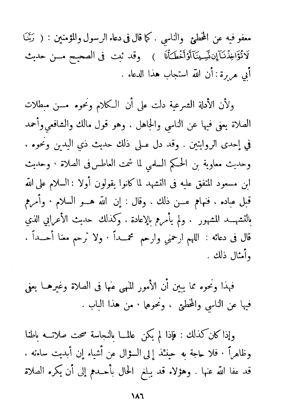 مَعْفُوٌّ فِيهِ عَنْ الْمُخْطِئِ وَالنَّاسِي. كَمَا قَالَ فِي دُعَاءِ الرَّسُولِ وَالْمُؤْمِنِينَ: {رَبَّنَا لَا تُؤَاخِذْنَا إنْ نَسِينَا أَوْ أَخْطَأْنَا} وَقَدْ ثَبَتَ فِي الصَّحِيحِ مِنْ حَدِيثِ أَبِي هُرَيْرَةَ: أَنَّ اللَّهَ اسْتَجَابَ هَذَا الدُّعَاءَ. وَلِأَنَّ الْأَدِلَّةَ الشَّرْعِيَّةَ دَلَّتْ عَلَى أَنَّ الْكَلَامَ وَنَحْوَهُ مِنْ مُبْطِلَاتِ الصَّلَاةِ يُعْفَى فِيهَا عَنْ النَّاسِي وَالْجَاهِلِ وَهُوَ قَوْلُ مَالِكٍ وَالشَّافِعِيِّ وَأَحْمَد فِي إحْدَى الرِّوَايَتَيْنِ. وَقَدْ دَلَّ عَلَى ذَلِكَ حَدِيثُ ذِي الْيَدَيْنِ وَنَحْوِهِ وَحَدِيثُ مُعَاوِيَةَ بْنِ الْحَكَمِ السُّلَمِي لَمَّا شَمَّتَ الْعَاطِسَ فِي الصَّلَاةِ وَحَدِيثُ ابْنِ مَسْعُودٍ الْمُتَّفَقِ عَلَيْهِ فِي التَّشَهُّدِ لَمَّا كَانُوا يَقُولُونَ أَوَّلًا: السَّلَامُ عَلَى اللَّهِ قَبْلَ عِبَادِهِ فَنَهَاهُمْ عَنْ ذَلِكَ وَقَالَ: إنَّ اللَّهَ هُوَ السَّلَامُ وَأَمَرَهُمْ بِالتَّشَهُّدِ الْمَشْهُورِ وَلَمْ يَأْمُرْهُمْ بِالْإِعَادَةِ وَكَذَلِكَ حَدِيثُ الْأَعْرَابِيِّ الَّذِي قَالَ فِي دُعَائِهِ: اللَّهُمَّ ارْحَمْنِي وَارْحَمْ مُحَمَّدًا وَلَا تَرْحَمْ مَعَنَا أَحَدًا وَأَمْثَالُ ذَلِكَ. فَهَذَا وَنَحْوُهُ مِمَّا يُبَيِّنُ أَنَّ الْأُمُورَ الْمَنْهِيَّ عَنْهَا فِي الصَّلَاةِ وَغَيْرِهَا يُعْفَى فِيهَا عَنْ النَّاسِي وَالْمُخْطِئِ وَنَحْوِهِمَا مِنْ هَذَا الْبَابِ. وَإِذَا كَانَ كَذَلِكَ: فَإِذَا لَمْ يَكُنْ عَالِمًا بِالنَّجَاسَةِ صَحَّتْ صَلَاتُهُ بَاطِنًا وَظَاهِرًا فَلَا حَاجَةَ بِهِ حِينَئِذٍ عَنْ السُّؤَالِ عَنْ أَشْيَاءَ إنْ أُبْدِيَتْ سَاءَتْهُ قَدْ عَفَا اللَّهُ عَنْهَا. وَهَؤُلَاءِ قَدْ يَبْلُغُ الْحَالُ بِأَحَدِهِمْ إلَى أَنْ يَكْرَهَ الصَّلَاةَ