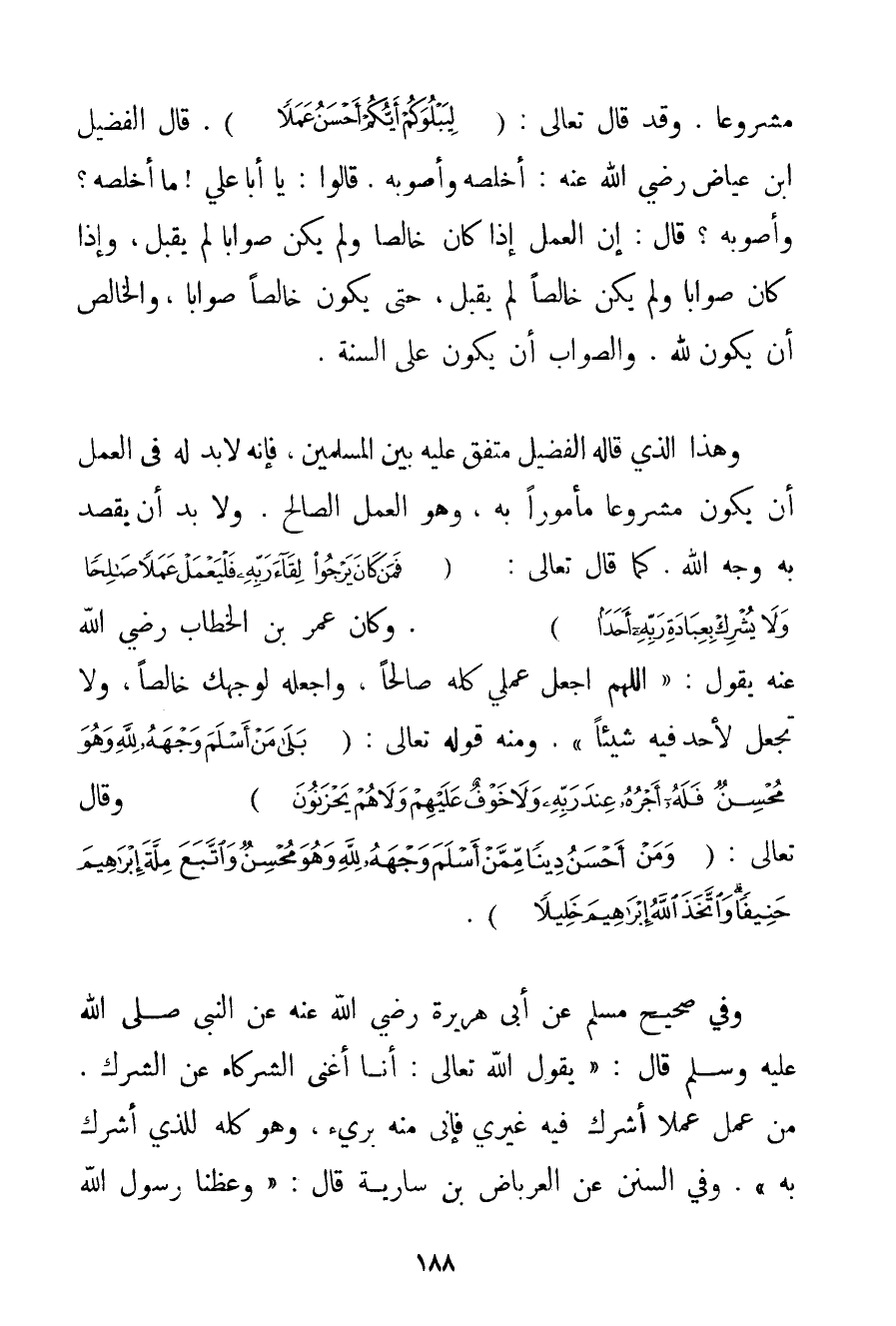 مَشْرُوعًا. وَقَدْ قَالَ تَعَالَى: {لِيَبْلُوَكُمْ أَيُّكُمْ أَحْسَنُ عَمَلًا} . قَالَ الْفُضَيْل ابْنُ عِيَاضٍ رَضِيَ اللَّهُ عَنْهُ أَخْلَصُهُ وَأَصْوَبُهُ. قَالُوا: يَا أَبَا عَلِيٍّ مَا أَخْلَصُهُ؟ وَأَصْوَبُهُ؟ قَالَ: إنَّ الْعَمَلَ إذَا كَانَ خَالِصًا وَلَمْ يَكُنْ صَوَابًا لَمْ يُقْبَلْ وَإِذَا كَانَ صَوَابًا وَلَمْ يَكُنْ خَالِصًا لَمْ يُقْبَلْ حَتَّى يَكُونَ خَالِصًا صَوَابًا وَالْخَالِصُ أَنْ يَكُونَ لِلَّهِ. وَالصَّوَابُ أَنْ يَكُونَ عَلَى السُّنَّةِ. وَهَذَا الَّذِي قَالَهُ الْفُضَيْل مُتَّفَقٌ عَلَيْهِ بَيْنَ الْمُسْلِمِينَ فَإِنَّهُ لَا بُدَّ لَهُ فِي الْعَمَلِ أَنْ يَكُونَ مَشْرُوعًا مَأْمُورًا بِهِ وَهُوَ الْعَمَلُ الصَّالِحُ. وَلَا بُدَّ أَنْ يَقْصِدَ بِهِ وَجْهَ اللَّهِ. كَمَا قَالَ تَعَالَى: {فَمَنْ كَانَ يَرْجُوا لِقَاءَ رَبِّهِ فَلْيَعْمَلْ عَمَلًا صَالِحًا وَلَا يُشْرِكْ بِعِبَادَةِ رَبِّهِ أَحَدًا} . وَكَانَ عُمَرُ بْنُ الْخَطَّابِ رَضِيَ اللَّهُ عَنْهُ يَقُولُ: " اللَّهُمَّ اجْعَلْ عَمَلِي كُلَّهُ صَالِحًا وَاجْعَلْهُ لِوَجْهِك خَالِصًا وَلَا تَجْعَلْ لِأَحَدِ فِيهِ شَيْئًا ". وَمِنْهُ قَوْله تَعَالَى {بَلَى مَنْ أَسْلَمَ وَجْهَهُ لِلَّهِ وَهُوَ مُحْسِنٌ فَلَهُ أَجْرُهُ عِنْدَ رَبِّهِ وَلَا خَوْفٌ عَلَيْهِمْ وَلَا هُمْ يَحْزَنُونَ} وَقَالَ تَعَالَى: {وَمَنْ أَحْسَنُ دِينًا مِمَّنْ أَسْلَمَ وَجْهَهُ لِلَّهِ وَهُوَ مُحْسِنٌ وَاتَّبَعَ مِلَّةَ إبْرَاهِيمَ حَنِيفًا وَاتَّخَذَ اللَّهُ إبْرَاهِيمَ خَلِيلًا} . وَفِي صَحِيحِ مُسْلِمٍ عَنْ أَبِي هُرَيْرَةَ رَضِيَ اللَّهُ عَنْهُ عَنْ النَّبِيِّ صَلَّى اللَّهُ عَلَيْهِ وَسَلَّمَ قَالَ: " {يَقُولُ اللَّهُ تَعَالَى: أَنَا أَغْنَى الشُّرَكَاءِ عَنْ الشِّرْكِ. مَنْ عَمِلَ عَمَلًا أَشْرَكَ فِيهِ غَيْرِي فَإِنِّي مِنْهُ بَرِيءٌ وَهُوَ كُلُّهُ لِلَّذِي أَشْرَكَ بِهِ} . وَفِي السُّنَنِ عَنْ العرباض بْنِ سَارِيَةَ قَالَ: " {وَعَظَنَا رَسُولُ اللَّهِ