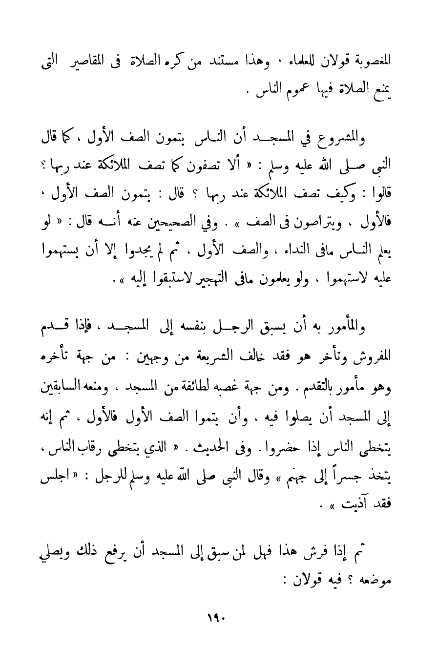 الْمَغْصُوبَةِ قَوْلَانِ لِلْعُلَمَاءِ وَهَذَا مُسْتَنَدُ مَنْ كَرِهَ الصَّلَاةَ فِي الْمَقَاصِيرِ الَّتِي يَمْنَعُ الصَّلَاةَ فِيهَا عُمُومُ النَّاسِ. وَالْمَشْرُوعُ فِي الْمَسْجِدِ أَنَّ النَّاسَ يُتِمُّونَ الصَّفَّ الْأَوَّلَ كَمَا قَالَ النَّبِيُّ صَلَّى اللَّهُ عَلَيْهِ وَسَلَّمَ " {أَلَا تُصَفُّونَ كَمَا تُصَفُّ الْمَلَائِكَةُ عِنْدَ رَبِّهَا؟ قَالُوا: وَكَيْفَ تُصَفُّ الْمَلَائِكَةُ عِنْدَ رَبِّهَا؟ قَالَ: يُتِمُّونَ الصَّفَّ الْأَوَّلَ فَالْأَوَّلَ وَيَتَرَاصُّونَ فِي الصَّفِّ} . وَفِي الصَّحِيحَيْنِ عَنْهُ أَنَّهُ قَالَ: " {لَوْ يَعْلَمُ النَّاسُ مَا فِي النِّدَاءِ وَالصَّفِّ الْأَوَّلِ ثُمَّ لَمْ يَجِدُوا إلَّا أَنْ يستهموا عَلَيْهِ لاستهموا وَلَوْ يَعْلَمُونَ مَا فِي التَّهْجِيرِ لَاسْتَبَقُوا إلَيْهِ} . وَالْمَأْمُورُ بِهِ أَنْ يَسْبِقَ الرَّجُلُ بِنَفْسِهِ إلَى الْمَسْجِدِ فَإِذَا قَدَّمَ الْمَفْرُوشَ وَتَأَخَّرَ هُوَ فَقَدْ خَالَفَ الشَّرِيعَةَ مِنْ وَجْهَيْنِ: مِنْ جِهَةِ تَأَخُّرِهِ وَهُوَ مَأْمُورٌ بِالتَّقَدُّمِ. وَمِنْ جِهَةِ غَصْبِهِ لِطَائِفَةٍ مِنْ الْمَسْجِدِ وَمَنْعِهِ السَّابِقِينَ إلَى الْمَسْجِدِ أَنْ يُصَلُّوا فِيهِ وَأَنْ يُتِمُّوا الصَّفَّ الْأَوَّلَ فَالْأَوَّلَ ثُمَّ إنَّهُ يَتَخَطَّى النَّاسَ إذَا حَضَرُوا. وَفِي الْحَدِيثِ. " {الَّذِي يَتَخَطَّى رِقَابَ النَّاسِ يَتَّخِذُ جِسْرًا إلَى جَهَنَّمَ} وَقَالَ النَّبِيُّ صَلَّى اللَّهُ عَلَيْهِ وَسَلَّمَ لِلرَّجُلِ: " {اجْلِسْ فَقَدْ آذَيْت} . ثُمَّ إذَا فَرَشَ هَذَا فَهَلْ لِمَنْ سَبَقَ إلَى الْمَسْجِدِ أَنْ يَرْفَعَ ذَلِكَ وَيُصَلِّي مَوْضِعَهُ؟ فِيهِ قَوْلَانِ: