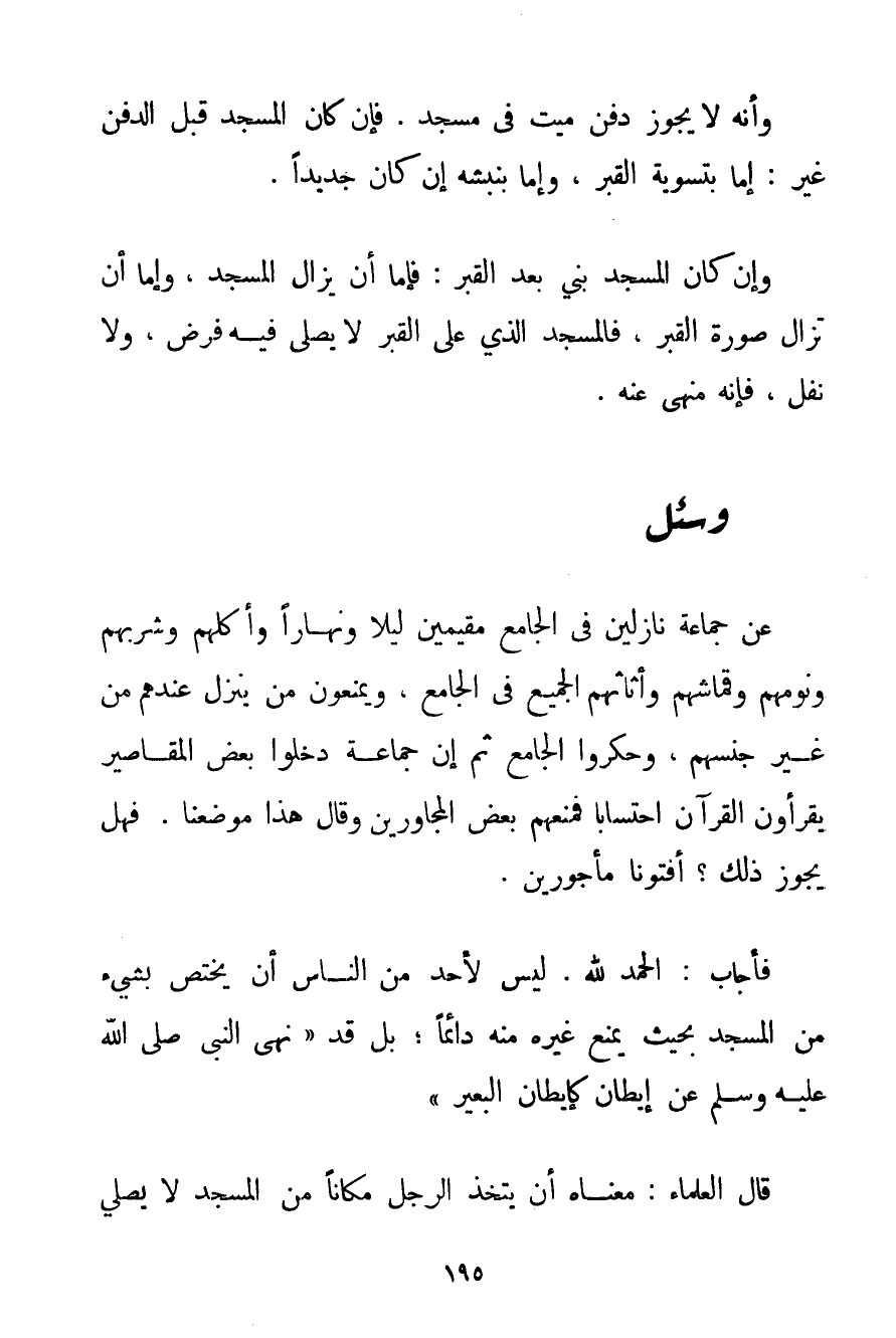 وَأَنَّهُ لَا يَجُوزُ دَفْنُ مَيِّتٍ فِي مَسْجِدٍ. فَإِنْ كَانَ الْمَسْجِدُ قَبْلَ الدَّفْنِ غُيِّرَ: إمَّا بِتَسْوِيَةِ الْقَبْرِ وَإِمَّا بِنَبْشِهِ إنْ كَانَ جَدِيدًا. وَإِنْ كَانَ الْمَسْجِدُ بُنِيَ بَعْدَ الْقَبْرِ: فَإِمَّا أَنْ يُزَالَ الْمَسْجِدُ وَإِمَّا أَنْ تُزَالَ صُورَةُ الْقَبْرِ فَالْمَسْجِدُ الَّذِي عَلَى الْقَبْرِ لَا يُصَلَّى فِيهِ فَرْضٌ وَلَا نَفْلٌ فَإِنَّهُ مَنْهِيٌّ عَنْهُ.