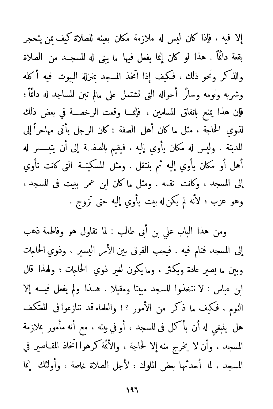 إلَّا فِيهِ فَإِذَا كَانَ لَيْسَ لَهُ مُلَازَمَةُ مَكَانٍ بِعَيْنِهِ لِلصَّلَاةِ كَيْفَ بِمَنْ يَتَحَجَّرُ بُقْعَةً دَائِمًا. هَذَا لَوْ كَانَ إنَّمَا يَفْعَلُ فِيهَا مَا يُبْنَى لَهُ الْمَسْجِدُ مِنْ الصَّلَاةِ وَالذِّكْرِ وَنَحْوِ ذَلِكَ فَكَيْفَ إذَا اتَّخَذَ الْمَسْجِدَ بِمَنْزِلَةِ الْبُيُوتِ فِيهِ أَكْلُهُ وَشُرْبُهُ وَنَوْمُهُ وَسَائِرُ أَحْوَالِهِ الَّتِي تَشْتَمِلُ عَلَى مَا لَمْ تُبْنَ الْمَسَاجِدُ لَهُ دَائِمًا؛ فَإِنَّ هَذَا يُمْنَعُ بِاتِّفَاقِ الْمُسْلِمِينَ فَإِنَّمَا وَقَعَتْ الرُّخْصَةُ فِي بَعْضِ ذَلِكَ لِذَوِي الْحَاجَةِ مِثْلِ مَا كَانَ أَهْلُ الصُّفَّةِ: كَانَ الرَّجُلُ يَأْتِي مُهَاجِرًا إلَى الْمَدِينَةِ وَلَيْسَ لَهُ مَكَانٌ يَأْوِي إلَيْهِ فَيُقِيمُ بِالصُّفَّةِ إلَى أَنْ يَتَيَسَّرَ لَهُ أَهْلٌ أَوْ مَكَانٌ يَأْوِي إلَيْهِ ثُمَّ يَنْتَقِلُ. وَمِثْلِ الْمِسْكِينَةِ الَّتِي كَانَتْ تَأْوِي إلَى الْمَسْجِدِ وَكَانَتْ تَقُمُّهُ. وَمِثْلِ مَا كَانَ ابْنُ عُمَرَ يَبِيتُ فِي الْمَسْجِدِ وَهُوَ عَزَبٌ؛ لِأَنَّهُ لَمْ يَكُنْ لَهُ بَيْتٌ يَأْوِي إلَيْهِ حَتَّى تَزَوَّجَ. وَمِنْ هَذَا الْبَابِ عَلِيُّ بْنُ أَبِي طَالِبٍ: لَمَّا تَقَاوَلَ هُوَ وَفَاطِمَةُ ذَهَبَ إلَى الْمَسْجِدِ فَنَامَ فِيهِ. فَيَجِبُ الْفَرْقُ بَيْنَ الْأَمْرِ الْيَسِيرِ وَذَوِي الْحَاجَاتِ وَبَيْنَ مَا يَصِيرُ عَادَةً وَيَكْثُرُ وَمَا يَكُونُ لِغَيْرِ ذَوِي الْحَاجَاتِ؛ وَلِهَذَا قَالَ ابْنُ عَبَّاسٍ: لَا تَتَّخِذُوا الْمَسْجِدَ مَبِيتًا وَمَقِيلًا. هَذَا وَلَمْ يَفْعَلْ فِيهِ إلَّا النَّوْمُ فَكَيْفَ مَا ذَكَرَ مِنْ الْأُمُورِ وَالْعُلَمَاءُ قَدْ تَنَازَعُوا فِي الْمُعْتَكِفِ هَلْ يَنْبَغِي لَهُ أَنْ يَأْكُلَ فِي الْمَسْجِدِ أَوْ فِي بَيْتِهِ مَعَ أَنَّهُ مَأْمُورٌ بِمُلَازَمَةِ الْمَسْجِدِ وَأَنْ لَا يَخْرُجَ مِنْهُ إلَّا لِحَاجَةِ وَالْأَئِمَّةُ كَرِهُوا اتِّخَاذَ الْمَقَاصِيرَ فِي الْمَسْجِدِ لَمَّا أَحْدَثَهَا بَعْضُ الْمُلُوكِ؛ لِأَجْلِ الصَّلَاةِ خَاصَّةً وَأُولَئِكَ إنَّمَا