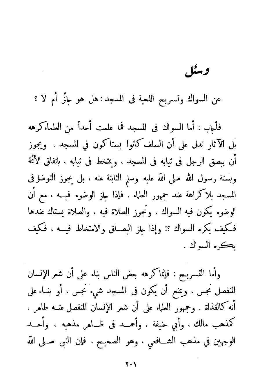 أَمَّا السِّوَاكُ فِي الْمَسْجِدِ فَمَا عَلِمْت أَحَدًا مِنْ الْعُلَمَاءِ كَرِهَهُ بَلْ الْآثَارُ تَدُلُّ عَلَى أَنَّ السَّلَفَ كَانُوا يَسْتَاكُونَ فِي الْمَسْجِدِ وَيَجُوزُ أَنْ يَبْصُقَ الرَّجُلُ فِي ثِيَابِهِ فِي الْمَسْجِدِ وَيَمْتَخِطَ فِي ثِيَابِهِ بِاتِّفَاقِ الْأَئِمَّةِ وَبِسُنَّةِ رَسُولِ اللَّهِ صَلَّى اللَّهُ عَلَيْهِ وَسَلَّمَ الثَّابِتَةِ عَنْهُ بَلْ يَجُوزُ التَّوَضُّؤُ فِي الْمَسْجِدِ بِلَا كَرَاهَةٍ عِنْدَ جُمْهُورِ الْعُلَمَاءِ. فَإِذَا جَازَ الْوُضُوءُ فِيهِ مَعَ أَنَّ الْوُضُوءَ يَكُونُ فِيهِ السِّوَاكُ وَتَجُوزُ الصَّلَاةُ فِيهِ وَالصَّلَاةُ يُسْتَاكُ عِنْدَهَا فَكَيْفَ يُكْرَهُ السِّوَاكُ وَإِذَا جَازَ الْبُصَاقُ وَالِامْتِخَاطُ فِيهِ فَكَيْفَ يُكْرَهُ السِّوَاكُ. وَأَمَّا التَّسْرِيحُ: فَإِنَّمَا كَرِهَهُ بَعْضُ النَّاسِ بِنَاءً عَلَى أَنَّ شَعْرَ الْإِنْسَانِ الْمُنْفَصِلَ نَجِسٌ وَيُمْنَعُ أَنْ يَكُونَ فِي الْمَسْجِدِ شَيْءٌ نَجِسٌ أَوْ بِنَاءً عَلَى أَنَّهُ كَالْقَذَاةِ. وَجُمْهُورُ الْعُلَمَاءِ عَلَى أَنَّ شَعْرَ الْإِنْسَانِ الْمُنْفَصِلِ عَنْهُ طَاهِرٌ كَمَذْهَبِ مَالِكٍ وَأَبِي حَنِيفَةَ وَأَحْمَد فِي ظَاهِرِ مَذْهَبِهِ وَأَحَدِ الْوَجْهَيْنِ فِي مَذْهَبِ الشَّافِعِيِّ وَهُوَ الصَّحِيحُ فَإِنَّ النَّبِيَّ