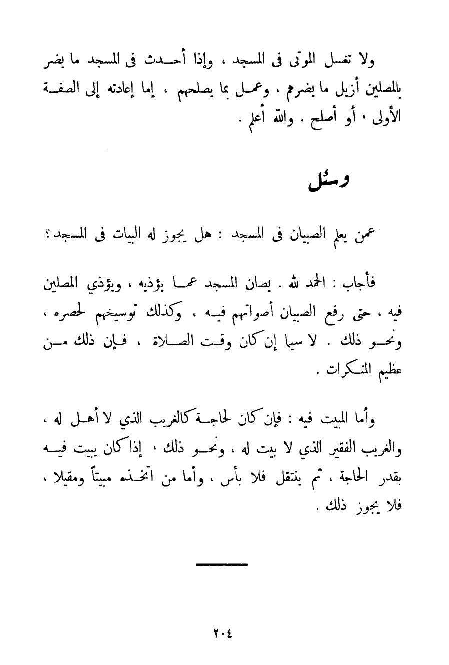 الْحَمْدُ لِلَّهِ، يُصَانُ الْمَسْجِدُ عَمَّا يُؤْذِيهِ وَيُؤْذِي الْمُصَلِّينَ فِيهِ حَتَّى رَفْعُ الصِّبْيَانِ أَصْوَاتَهُمْ فِيهِ وَكَذَلِكَ تَوْسِيخُهُمْ لِحُصْرِهِ وَنَحْوِ ذَلِكَ. لَا سِيَّمَا إنْ كَانَ وَقْتَ الصَّلَاةِ فَإِنَّ ذَلِكَ مِنْ عَظِيمِ الْمُنْكَرَاتِ. وَأَمَّا الْمَبِيتُ فِيهِ: فَإِنْ كَانَ لِحَاجَةِ كَالْغَرِيبِ الَّذِي لَا أَهْلَ لَهُ وَالْغَرِيبِ الْفَقِيرِ الَّذِي لَا بَيْتَ لَهُ وَنَحْوِ ذَلِكَ إذَا كَانَ يَبِيتُ فِيهِ بِقَدْرِ الْحَاجَةِ ثُمَّ يَنْتَقِلُ فَلَا بَأْسَ وَأَمَّا مَنْ اتَّخَذَهُ مَبِيتًا وَمَقِيلًا فَلَا يَجُوزُ ذَلِكَ.