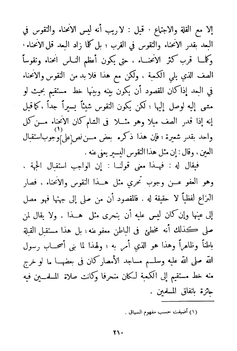إلَّا مَعَ الْقِلَّةِ وَالِاجْتِمَاعِ قِيلَ: لَا رَيْبَ أَنَّهُ لَيْسَ الِانْحِنَاءُ وَالتَّقَوُّسُ فِي الْبُعْدِ بِقَدْرِ الِانْحِنَاءِ وَالتَّقَوُّسِ فِي الْقُرْبِ؛ بَلْ كُلَّمَا زَادَ الْبُعْدُ قَلَّ الِانْحِنَاءُ وَكُلَّمَا قَرُبَ كَثُرَ الِانْحِنَاءُ حَتَّى يَكُونَ أَعْظَمُ النَّاسِ انْحِنَاءً وَتَقَوُّسًا الصَّفُّ الَّذِي يَلِي الْكَعْبَةَ وَلَكِنْ مَعَ هَذَا فَلَا بُدَّ مِنْ التَّقَوُّسِ وَالِانْحِنَاءِ فِي الْبُعْدِ إذَا كَانَ الْمَقْصُودُ أَنْ يَكُونَ بَيْنَهُ وَبَيْنَهَا خَطٌّ مُسْتَقِيمٌ بِحَيْثُ لَوْ مَشَى إلَيْهِ لَوَصَلَ إلَيْهَا؛ لَكِنْ يَكُونُ التَّقَوُّسُ شَيْئًا يَسِيرًا جِدًّا كَمَا قِيلَ إنَّهُ إذَا قُدِّرَ الصَّفُّ مِيلًا وَهُوَ مَثَلًا فِي الشَّامِ كَانَ الِانْحِنَاءُ مِنْ كُلِّ وَاحِدٍ بِقَدْرِ شَعِيرَةٍ؛ فَإِنَّ هَذَا ذَكَرَهُ بَعْضُ مَنْ نَصَّ [عَلَى] (1) وُجُوبِ اسْتِقْبَالِ الْعَيْنِ وَقَالَ: إنَّ مِثْلَ هَذَا التَّقَوُّسِ الْيَسِيرِ يُعْفَى عَنْهُ. فَيُقَالُ لَهُ: فَهَذَا مَعْنَى قَوْلِنَا: إنَّ الْوَاجِبَ اسْتِقْبَالُ الْجِهَةِ وَهُوَ الْعَفْوُ عَنْ وُجُوبِ تَحَرِّي مِثْلِ هَذَا التَّقَوُّسِ وَالِانْحِنَاءِ فَصَارَ النِّزَاعُ لَفْظِيًّا لَا حَقِيقَةَ لَهُ. فَالْمَقْصُودُ أَنَّ مَنْ صَلَّى إلَى جِهَتِهَا فَهُوَ مُصَلٍّ إلَى عَيْنِهَا وَإِنْ كَانَ لَيْسَ عَلَيْهِ أَنْ يَتَحَرَّى مِثْلَ هَذَا. وَلَا يُقَالُ لِمَنْ صَلَّى كَذَلِكَ أَنَّهُ مُخْطِئٌ فِي الْبَاطِنِ مَعْفُوٌّ عَنْهُ؛ بَلْ هَذَا مُسْتَقْبِلٌ الْقِبْلَةَ بَاطِنًا وَظَاهِرًا وَهَذَا هُوَ الَّذِي أُمِرَ بِهِ؛ وَلِهَذَا لَمَّا بَنَى أَصْحَابُ رَسُولِ اللَّهِ صَلَّى اللَّهُ عَلَيْهِ وَسَلَّمَ مَسَاجِدَ الْأَمْصَارِ كَانَ فِي بَعْضِهَا مَا لَوْ خَرَجَ مِنْهُ خَطٌّ مُسْتَقِيمٌ إلَى الْكَعْبَةِ لَكَانَ مُنْحَرِفًا وَكَانَتْ صَلَاةُ الْمُسْلِمِينَ فِيهِ جَائِزَةٌ بِاتِّفَاقِ الْمُسْلِمِينَ.