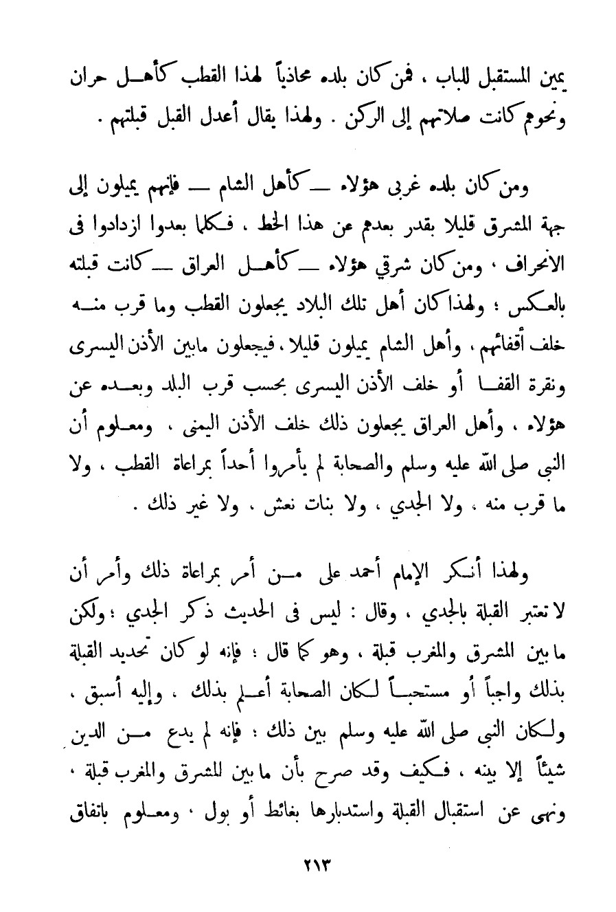 يَمِينِ الْمُسْتَقْبِلِ لِلْبَابِ فَمَنْ كَانَ بَلَدُهُ مُحَاذِيًا لِهَذَا الْقُطْبِ كَأَهْلِ حَرَّانَ وَنَحْوِهِمْ كَانَتْ صَلَاتُهُمْ إلَى الرُّكْنِ. وَلِهَذَا يُقَالُ أَعْدَلُ الْقِبَلِ قِبْلَتُهُمْ. وَمَنْ كَانَ بَلَدُهُ غَرْبِيَّ هَؤُلَاءِ - كَأَهْلِ الشَّامِ - فَإِنَّهُمْ يَمِيلُونَ إلَى جِهَةِ الْمَشْرِقِ قَلِيلًا بِقَدْرِ بُعْدِهِمْ عَنْ هَذَا الْخَطِّ فَكُلَّمَا بَعُدُوا ازْدَادُوا فِي الِانْحِرَافِ وَمَنْ كَانَ شَرْقِيَّ هَؤُلَاءِ - كَأَهْلِ الْعِرَاقِ - كَانَتْ قِبْلَتُهُ بِالْعَكْسِ؛ وَلِهَذَا كَانَ أَهْلُ تِلْكَ الْبِلَادِ يَجْعَلُونَ الْقُطْبَ وَمَا قَرُبَ مِنْهُ خَلْفَ أَقْفَائِهِمْ وَأَهْلُ الشَّامِ يَمِيلُونَ قَلِيلًا فَيَجْعَلُونَ مَا بَيْنَ الْأُذُنِ الْيُسْرَى وَنَقْرَةِ الْقَفَا أَوْ خَلْفَ الْأُذُنِ الْيُسْرَى بِحَسَبِ قُرْبِ الْبَلَدِ وَبُعْدِهِ عَنْ هَؤُلَاءِ وَأَهْلُ الْعِرَاقِ يَجْعَلُونَ ذَلِكَ خَلْفَ الْأُذُنِ الْيُمْنَى وَمَعْلُومٌ أَنَّ النَّبِيَّ صَلَّى اللَّهُ عَلَيْهِ وَسَلَّمَ وَالصَّحَابَةَ لَمْ يَأْمُرُوا أَحَدًا بِمُرَاعَاةِ الْقُطْبِ وَلَا مَا قَرُبَ مِنْهُ وَلَا الْجَدْيُ وَلَا بَنَاتُ نَعْشٍ وَلَا غَيْرُ ذَلِكَ. وَلِهَذَا أَنْكَرَ الْإِمَامُ أَحْمَد عَلَى مَنْ أَمَرَ بِمُرَاعَاةِ ذَلِكَ وَأَمَرَ أَنْ لَا تُعْتَبَرَ الْقِبْلَةُ بِالْجَدْيِ وَقَالَ: لَيْسَ فِي الْحَدِيثِ ذِكْرُ الْجَدْيِ؛ وَلَكِنْ مَا بَيْنَ الْمَشْرِقِ وَالْمَغْرِبِ قِبْلَةٌ وَهُوَ كَمَا قَالَ؛ فَإِنَّهُ لَوْ كَانَ تَحْدِيدُ الْقِبْلَةِ بِذَلِكَ وَاجِبًا أَوْ مُسْتَحَبًّا لَكَانَ الصَّحَابَةُ أَعْلَمَ بِذَلِكَ وَإِلَيْهِ أَسْبَقُ وَلَكَانَ النَّبِيُّ صَلَّى اللَّهُ عَلَيْهِ وَسَلَّمَ بَيَّنَ ذَلِكَ؛ فَإِنَّهُ لَمْ يَدَعْ مِنْ الدِّينِ شَيْئًا إلَّا بَيَّنَهُ فَكَيْفَ وَقَدْ صَرَّحَ بِأَنَّ مَا بَيْنَ الْمَشْرِقِ وَالْمَغْرِبِ قِبْلَةٌ وَنَهَى عَنْ اسْتِقْبَالِ الْقِبْلَةِ وَاسْتِدْبَارِهَا بِغَائِطِ أَوْ بَوْلٍ وَمَعْلُومٌ بِاتِّفَاقِ