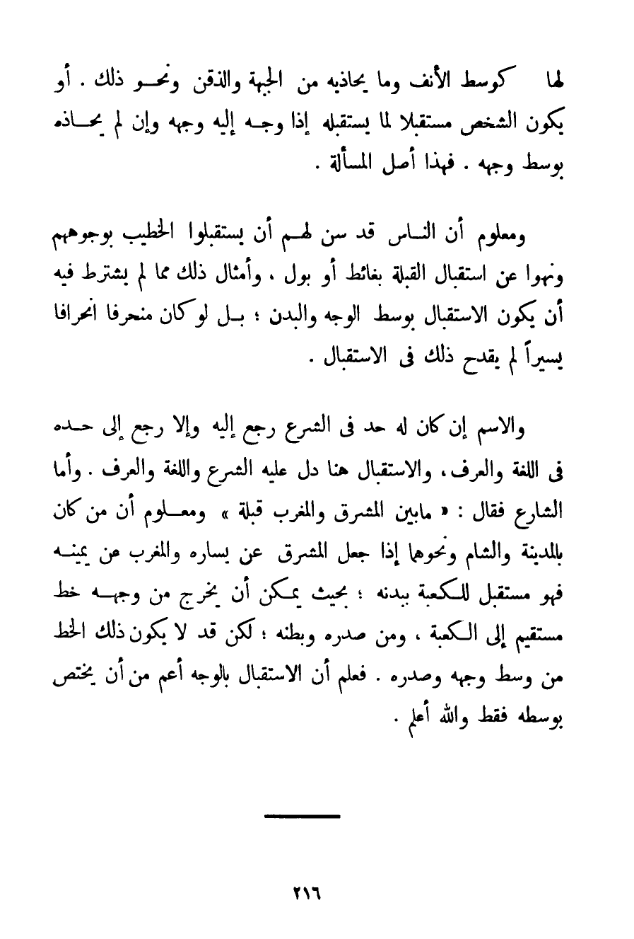 لَهَا - كَوَسَطِ الْأَنْفِ وَمَا يُحَاذِيهِ مِنْ الْجَبْهَةِ وَالذَّقَنِ وَنَحْوِ ذَلِكَ. أَوْ يَكُونَ الشَّخْصُ مُسْتَقْبِلًا لِمَا يَسْتَقْبِلُهُ إذَا وَجَّهَ إلَيْهِ وَجْهَهُ وَإِنْ لَمْ يُحَاذِهِ بِوَسَطِ وَجْهِهِ. فَهَذَا أَصْلُ الْمَسْأَلَةِ. وَمَعْلُومٌ أَنَّ النَّاسَ قَدْ سُنَّ لَهُمْ أَنْ يَسْتَقْبِلُوا الْخَطِيبَ بِوُجُوهِهِمْ وَنُهُوا عَنْ اسْتِقْبَالِ الْقِبْلَةِ بِغَائِطِ أَوْ بَوْلٍ وَأَمْثَالِ ذَلِكَ مِمَّا لَمْ يُشْتَرَطْ فِيهِ أَنْ يَكُونَ الِاسْتِقْبَالُ بِوَسَطِ الْوَجْهِ وَالْبَدَنِ؛ بَلْ لَوْ كَانَ مُنْحَرِفًا انْحِرَافًا يَسِيرًا لَمْ يَقْدَحْ ذَلِكَ فِي الِاسْتِقْبَالِ. وَالِاسْمُ إنْ كَانَ لَهُ حَدٌّ فِي الشَّرْعِ رُجِعَ إلَيْهِ وَإِلَّا رُجِعَ إلَى حَدِّهِ فِي اللُّغَةِ وَالْعُرْفِ وَالِاسْتِقْبَالُ هُنَا دَلَّ عَلَيْهِ الشَّرْعُ وَاللُّغَةُ وَالْعُرْفُ. وَأَمَّا الشَّارِعُ فَقَالَ: {مَا بَيْنَ الْمَشْرِقِ وَالْمَغْرِبِ قِبْلَةٌ} وَمَعْلُومٌ أَنَّ مَنْ كَانَ بِالْمَدِينَةِ وَالشَّامِ وَنَحْوِهِمَا إذَا جَعَلَ الْمَشْرِقَ عَنْ يَسَارِهِ وَالْمَغْرِبَ عَنْ يَمِينِهِ فَهُوَ مُسْتَقْبِلٌ لِلْكَعْبَةِ بِبَدَنِهِ؛ بِحَيْثُ يُمْكِنُ أَنْ يَخْرُجَ مِنْ وَجْهِهِ خَطٌّ مُسْتَقِيمٌ إلَى الْكَعْبَةِ وَمِنْ صَدْرِهِ وَبَطْنِهِ؛ لَكِنْ قَدْ لَا يَكُونُ ذَلِكَ الْخَطُّ مِنْ وَسَطِ وَجْهِهِ وَصَدْرِهِ. فَعُلِمَ أَنَّ الِاسْتِقْبَالَ بِالْوَجْهِ أَعَمُّ مِنْ أَنْ يَخْتَصَّ بِوَسَطِهِ فَقَطْ وَاَللَّهُ أَعْلَمُ.