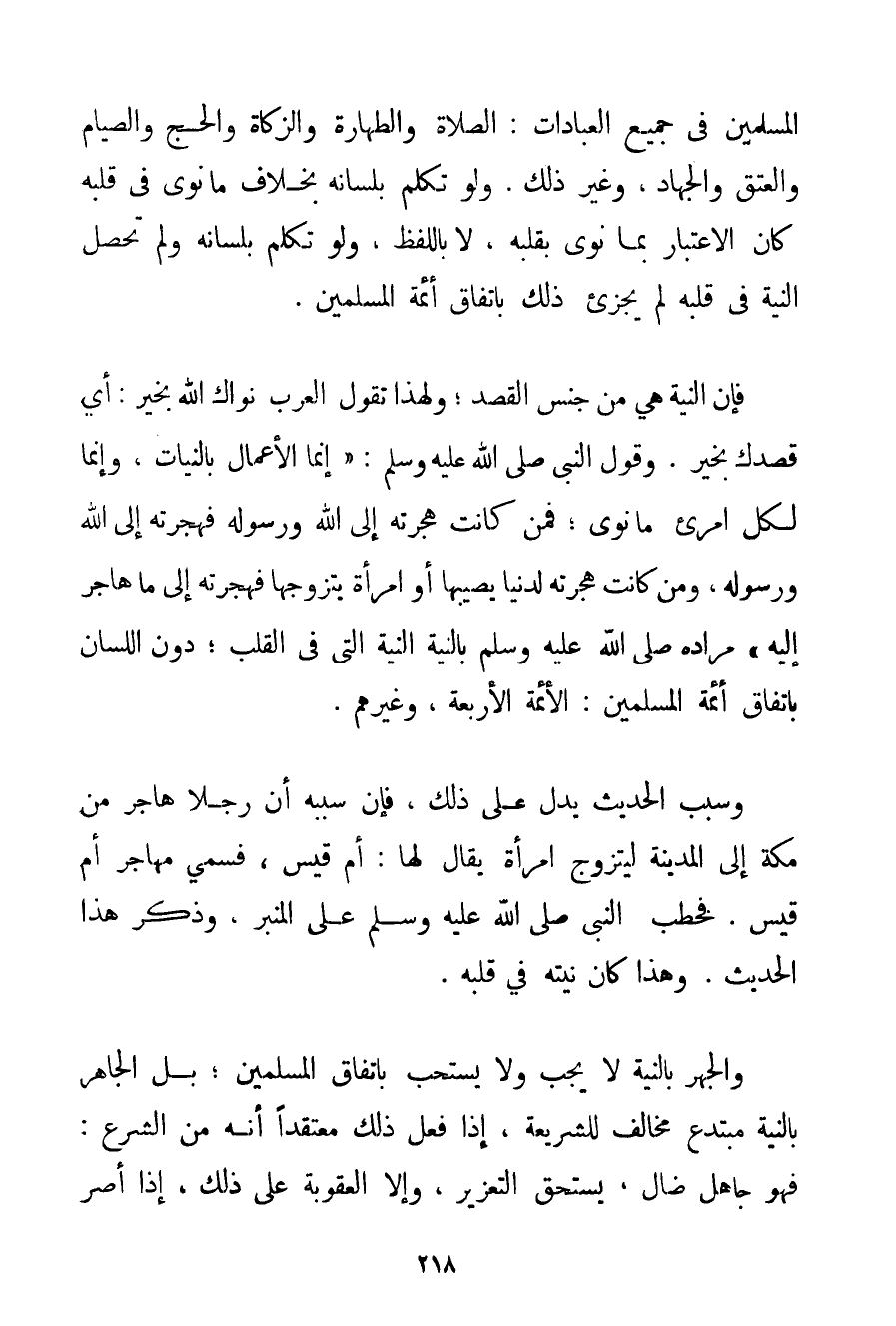 الْمُسْلِمِينَ فِي جَمِيعِ الْعِبَادَاتِ: الصَّلَاةِ وَالطَّهَارَةِ وَالزَّكَاةِ وَالْحَجِّ وَالصِّيَامِ وَالْعِتْقِ وَالْجِهَادِ وَغَيْرِ ذَلِكَ. وَلَوْ تَكَلَّمَ بِلِسَانِهِ بِخِلَافِ مَا نَوَى فِي قَلْبِهِ كَانَ الِاعْتِبَارُ بِمَا نَوَى بِقَلْبِهِ لَا بِاللَّفْظِ وَلَوْ تَكَلَّمَ بِلِسَانِهِ وَلَمْ تَحْصُلْ النِّيَّةُ فِي قَلْبِهِ لَمْ يُجْزِئْ ذَلِكَ بِاتِّفَاقِ أَئِمَّةِ الْمُسْلِمِينَ. فَإِنَّ النِّيَّةَ هِيَ مِنْ جِنْسِ الْقَصْدِ؛ وَلِهَذَا تَقُولُ الْعَرَبُ نَوَاك اللَّهُ بِخَيْرِ: أَيْ قَصَدَك بِخَيْرِ. وَقَوْلُ النَّبِيِّ صَلَّى اللَّهُ عَلَيْهِ وَسَلَّمَ {إنَّمَا الْأَعْمَالُ بِالنِّيَّاتِ وَإِنَّمَا لِكُلِّ امْرِئٍ مَا نَوَى؛ فَمَنْ كَانَتْ هِجْرَتُهُ إلَى اللَّهِ وَرَسُولِهِ فَهِجْرَتُهُ إلَى اللَّهِ وَرَسُولِهِ وَمَنْ كَانَتْ هِجْرَتُهُ لِدُنْيَا يُصِيبُهَا أَوْ امْرَأَةٍ يَتَزَوَّجُهَا فَهِجْرَتُهُ إلَى مَا هَاجَرَ إلَيْهِ} مُرَادُهُ صَلَّى اللَّهُ عَلَيْهِ وَسَلَّمَ بِالنِّيَّةِ النِّيَّةُ الَّتِي فِي الْقَلْبِ؛ دُونَ اللِّسَانِ بِاتِّفَاقِ أَئِمَّةِ الْمُسْلِمِينَ: الْأَئِمَّةِ الْأَرْبَعَةِ وَغَيْرِهِمْ. وَسَبَبُ الْحَدِيثِ يَدُلُّ عَلَى ذَلِكَ فَإِنَّ سَبَبَهُ أَنَّ رَجُلًا هَاجَرَ مِنْ مَكَّةَ إلَى الْمَدِينَةِ لِيَتَزَوَّجَ امْرَأَةً يُقَالُ لَهَا: أُمُّ قَيْسٍ فَسُمِّيَ مُهَاجِرَ أُمِّ قَيْسٍ. فَخَطَبَ النَّبِيُّ صَلَّى اللَّهُ عَلَيْهِ وَسَلَّمَ عَلَى الْمِنْبَرِ وَذَكَرَ هَذَا الْحَدِيثَ. وَهَذَا كَانَ نِيَّتُهُ فِي قَلْبِهِ. وَالْجَهْرُ بِالنِّيَّةِ لَا يَجِبُ وَلَا يُسْتَحَبُّ بِاتِّفَاقِ الْمُسْلِمِينَ؛ بَلْ الْجَاهِرُ بِالنِّيَّةِ مُبْتَدِعٌ مُخَالِفٌ لِلشَّرِيعَةِ إذَا فَعَلَ ذَلِكَ مُعْتَقِدًا أَنَّهُ مِنْ الشَّرْعِ: فَهُوَ جَاهِلٌ ضَالٌّ يَسْتَحِقُّ التَّعْزِيرَ وَإِلَّا الْعُقُوبَةَ عَلَى ذَلِكَ إذَا أَصَرَّ