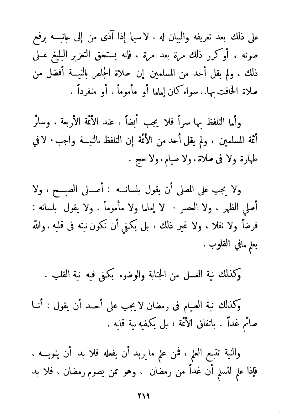 عَلَى ذَلِكَ بَعْدَ تَعْرِيفِهِ وَالْبَيَانِ لَهُ لَا سِيَّمَا إذَا آذَى مَنْ إلَى جَانِبِهِ بِرَفْعِ صَوْتِهِ أَوْ كَرَّرَ ذَلِكَ مَرَّةً بَعْدَ مَرَّةٍ فَإِنَّهُ يَسْتَحِقُّ التَّعْزِيرَ الْبَلِيغَ عَلَى ذَلِكَ وَلَمْ يَقُلْ أَحَدٌ مِنْ الْمُسْلِمِينَ إنَّ صَلَاةَ الْجَاهِرِ بِالنِّيَّةِ أَفْضَلُ مِنْ صَلَاةِ الْخَافِتِ بِهَا سَوَاءٌ كَانَ إمَامًا أَوْ مَأْمُومًا أَوْ مُنْفَرِدًا. وَأَمَّا التَّلَفُّظُ بِهَا سِرًّا فَلَا يَجِبُ أَيْضًا عِنْدَ الْأَئِمَّةِ الْأَرْبَعَةِ وَسَائِرِ أَئِمَّةِ الْمُسْلِمِينَ وَلَمْ يَقُلْ أَحَدٌ مِنْ الْأَئِمَّةِ إنَّ التَّلَفُّظَ بِالنِّيَّةِ وَاجِبٌ لَا فِي طَهَارَةٍ وَلَا فِي صَلَاةٍ وَلَا صِيَامٍ وَلَا حَجٍّ. وَلَا يَجِبُ عَلَى الْمُصَلِّي أَنْ يَقُولَ بِلِسَانِهِ: أُصَلِّي الصُّبْحَ وَلَا أُصَلِّي الظُّهْرَ وَلَا الْعَصْرَ وَلَا إمَامًا وَلَا مَأْمُومًا وَلَا يَقُولُ بِلِسَانِهِ: فَرْضًا وَلَا نَفْلًا وَلَا غَيْرَ ذَلِكَ؛ بَلْ يَكْفِي فِي أَنْ تَكُونَ نِيَّتُهُ فِي قَلْبِهِ وَاَللَّهُ يَعْلَمُ مَا فِي الْقُلُوبِ. وَكَذَلِكَ نِيَّةُ الْغُسْلِ مِنْ الْجَنَابَةِ وَالْوُضُوءِ يَكْفِي فِيهِ نِيَّةُ الْقَلْبِ. وَكَذَلِكَ نِيَّةُ الصِّيَامِ فِي رَمَضَانَ لَا يَجِبُ عَلَى أَحَدٍ أَنْ يَقُولَ: أَنَا صَائِمٌ غَدًا. بِاتِّفَاقِ الْأَئِمَّةِ؛ بَلْ يَكْفِيهِ نِيَّةُ قَلْبِهِ. وَالنِّيَّةُ تَتْبَعُ الْعِلْمَ فَمَنْ عَلِمَ مَا يُرِيدُ أَنْ يَفْعَلَهُ فَلَا بُدَّ أَنْ يَنْوِيَهُ فَإِذَا عَلِمَ الْمُسْلِمُ أَنَّ غَدًا مِنْ رَمَضَانَ وَهُوَ مِمَّنْ يَصُومُ رَمَضَانَ فَلَا بُدَّ