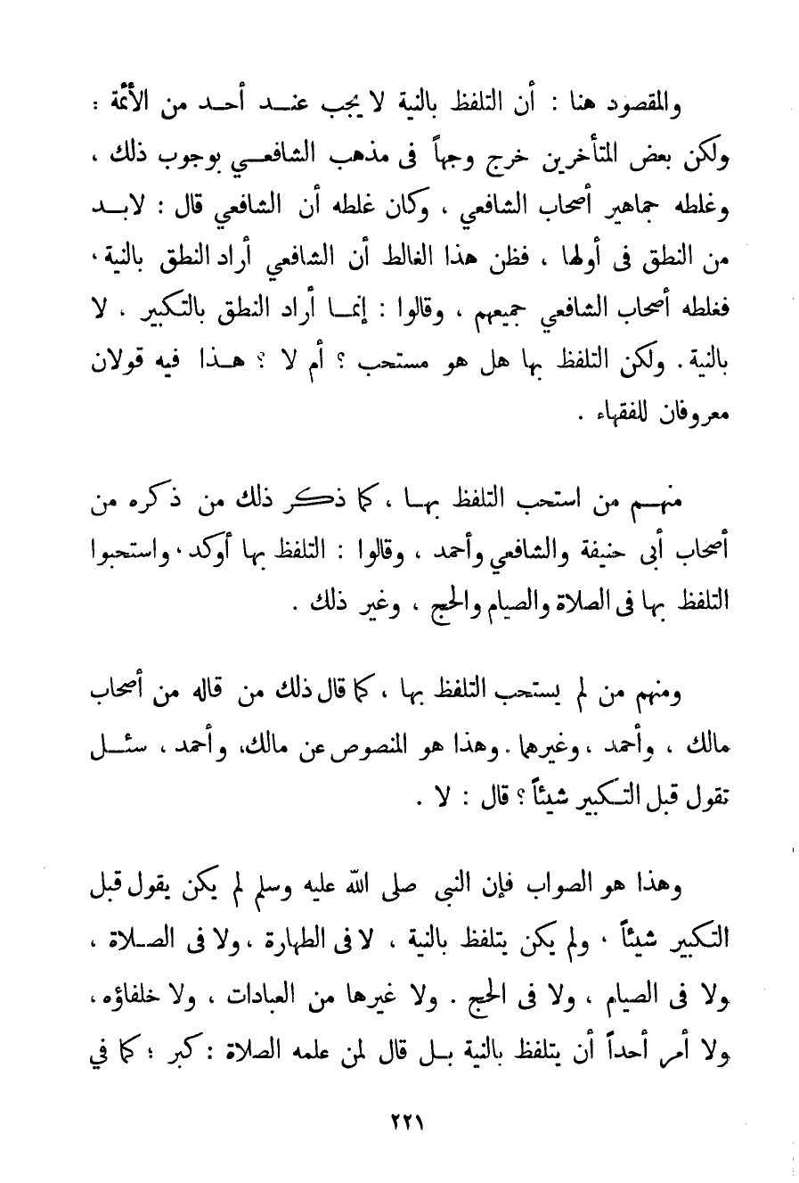 وَالْمَقْصُودُ هُنَا: أَنَّ التَّلَفُّظَ بِالنِّيَّةِ لَا يَجِبُ عِنْدَ أَحَدٍ مِنْ الْأَئِمَّةِ: وَلَكِنَّ بَعْضَ الْمُتَأَخِّرِينَ خَرَّجَ وَجْهًا فِي مَذْهَبِ الشَّافِعِيِّ بِوُجُوبِ ذَلِكَ وَغَلَّطَهُ جَمَاهِيرُ أَصْحَابِ الشَّافِعِيِّ وَكَانَ غَلَطُهُ أَنَّ الشَّافِعِيَّ قَالَ: لَا بُدَّ مِنْ النُّطْقِ فِي أَوَّلِهَا فَظَنَّ هَذَا الغالط أَنَّ الشَّافِعِيَّ أَرَادَ النُّطْقَ بِالنِّيَّةِ فَغَلَّطَهُ أَصْحَابُ الشَّافِعِيِّ جَمِيعُهُمْ وَقَالُوا: إنَّمَا أَرَادَ النُّطْقَ بِالتَّكْبِيرِ لَا بِالنِّيَّةِ. وَلَكِنَّ التَّلَفُّظَ بِهَا هَلْ هُوَ مُسْتَحَبٌّ؟ أَمْ لَا؟ هَذَا فِيهِ قَوْلَانِ مَعْرُوفَانِ لِلْفُقَهَاءِ. مِنْهُمْ مَنْ اسْتَحَبَّ التَّلَفُّظَ بِهَا كَمَا ذَكَرَ ذَلِكَ مَنْ ذَكَرَهُ مِنْ أَصْحَابِ أَبِي حَنِيفَةَ وَالشَّافِعِيِّ وَأَحْمَد وَقَالُوا: التَّلَفُّظُ بِهَا أَوْكَدُ وَاسْتَحَبُّوا التَّلَفُّظَ بِهَا فِي الصَّلَاةِ وَالصِّيَامِ وَالْحَجِّ وَغَيْرِ ذَلِكَ. وَمِنْهُمْ مَنْ لَمْ يَسْتَحِبَّ التَّلَفُّظَ بِهَا كَمَا قَالَ ذَلِكَ مَنْ قَالَهُ مِنْ أَصْحَابِ مَالِكٍ وَأَحْمَد وَغَيْرِهِمَا. وَهَذَا هُوَ الْمَنْصُوصُ عَنْ مَالِكٍ وَأَحْمَد سُئِلَ تَقُولُ قَبْلَ التَّكْبِيرِ شَيْئًا؟ قَالَ: لَا. وَهَذَا هُوَ الصَّوَابُ فَإِنَّ النَّبِيَّ صَلَّى اللَّهُ عَلَيْهِ وَسَلَّمَ لَمْ يَكُنْ يَقُولُ قَبْلَ التَّكْبِيرِ شَيْئًا وَلَمْ يَكُنْ يَتَلَفَّظُ بِالنِّيَّةِ لَا فِي الطَّهَارَةِ وَلَا فِي الصَّلَاةِ وَلَا فِي الصِّيَامِ وَلَا فِي الْحَجِّ. وَلَا غَيْرِهَا مِنْ الْعِبَادَاتِ وَلَا خُلَفَاؤُهُ وَلَا أَمَرَ أَحَدًا أَنْ يَتَلَفَّظَ بِالنِّيَّةِ بَلْ قَالَ لِمَنْ عَلَّمَهُ الصَّلَاةَ: كَبِّرْ؛ كَمَا فِي