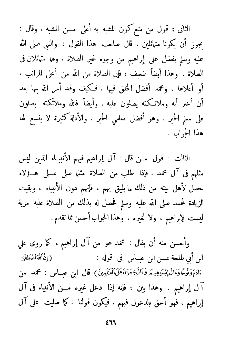 الثَّانِي: قَوْلُ مَنْ مَنَعَ كَوْنَ الْمُشَبَّهِ بِهِ أَعْلَى مِنْ الْمُشَبَّهِ وَقَالَ: يَجُوزُ أَنْ يَكُونَا مُتَمَاثِلَيْنِ قَالَ صَاحِبُ هَذَا الْقَوْلِ: وَالنَّبِيُّ صَلَّى اللَّهُ عَلَيْهِ وَسَلَّمَ يُفَضَّلُ عَلَى إبْرَاهِيمَ مِنْ وُجُوهٍ غَيْرِ الصَّلَاةِ وَهُمَا مُتَمَاثِلَانِ فِي الصَّلَاةِ وَهَذَا أَيْضًا ضَعِيفٌ؛ فَإِنَّ الصَّلَاةَ مِنْ اللَّهِ مِنْ أَعْلَى الْمَرَاتِبِ أَوْ أَعْلَاهَا وَمُحَمَّدٌ أَفْضَلُ الْخَلْقِ فِيهَا فَكَيْفَ وَقَدْ أَمَرَ اللَّهُ بِهَا بَعْدَ أَنْ أَخْبَرَ أَنَّهُ وَمَلَائِكَتَهُ يُصَلُّونَ عَلَيْهِ. وَأَيْضًا فَاَللَّهُ وَمَلَائِكَتُهُ يُصَلُّونَ عَلَى مُعَلِّمِ الْخَيْرِ وَهُوَ أَفْضَلُ مُعَلِّمِي الْخَيْرِ وَالْأَدِلَّةُ كَثِيرَةٌ لَا يَتَّسِعُ لَهَا هَذَا الْجَوَابُ. الثَّالِثُ: قَوْلُ مَنْ قَالَ: آلُ إبْرَاهِيمَ فِيهِمْ الْأَنْبِيَاءُ الَّذِينَ لَيْسَ مِثْلُهُمْ فِي آلِ مُحَمَّدٍ فَإِذَا طَلَبَ مِنْ الصَّلَاةِ مِثْلَمَا صَلَّى عَلَى هَؤُلَاءِ حَصَلَ لِأَهْلِ بَيْتِهِ مِنْ ذَلِكَ مَا يَلِيقُ بِهِمْ فَإِنَّهُمْ دُونَ الْأَنْبِيَاءِ وَبَقِيَتْ الزِّيَادَةُ لِمُحَمَّدِ صَلَّى اللَّهُ عَلَيْهِ وَسَلَّمَ فَحَصَلَ لَهُ بِذَلِكَ مِنْ الصَّلَاةِ عَلَيْهِ مَزِيَّةٌ لَيْسَتْ لِإِبْرَاهِيمَ وَلَا لِغَيْرِهِ وَهَذَا الْجَوَابُ أَحْسَنُ مِمَّا تَقَدَّمَ. وَأَحْسَنُ مِنْهُ أَنْ يُقَالَ: مُحَمَّدٌ هُوَ مِنْ آلِ إبْرَاهِيمَ كَمَا رَوَى عَلِيُّ ابْنِ أَبِي طَلْحَةَ عَنْ ابْنِ عَبَّاسٍ فِي قَوْلِهِ: {إنَّ اللَّهَ اصْطَفَى آدَمَ وَنُوحًا وَآلَ إبْرَاهِيمَ وَآلَ عِمْرَانَ عَلَى الْعَالَمِينَ} قَالَ ابْنِ عَبَّاسٍ: مُحَمَّدٌ مِنْ آلِ إبْرَاهِيمَ. وَهَذَا بَيِّنٌ؛ فَإِنَّهُ إذَا دَخَلَ غَيْرُهُ مِنْ الْأَنْبِيَاءِ فِي آلِ إبْرَاهِيمَ فَهُوَ أَحَقُّ بِالدُّخُولِ فِيهِمْ فَيَكُونُ قَوْلُنَا: كَمَا صَلَّيْت عَلَى آلِ