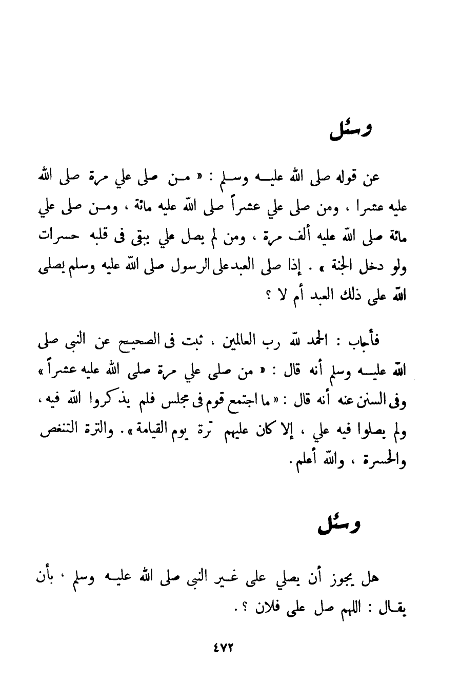 الْحَمْدُ لِلَّهِ رَبِّ الْعَالَمِينَ، ثَبَتَ فِي الصَّحِيحِ عَنْ النَّبِيِّ صَلَّى اللَّهُ عَلَيْهِ وَسَلَّمَ أَنَّهُ قَالَ: {مَنْ صَلَّى عَلَيَّ مَرَّةً صَلَّى اللَّهُ عَلَيْهِ عَشْرًا} وَفِي السُّنَنِ عَنْهُ أَنَّهُ قَالَ: {مَا اجْتَمَعَ قَوْمٌ فِي مَجْلِسٍ فَلَمْ يَذْكُرُوا اللَّهَ فِيهِ وَلَمْ يُصَلُّوا فِيهِ عَلَيَّ إلَّا كَانَ عَلَيْهِمْ تِرَةً يَوْمَ الْقِيَامَةِ} . وَالتِّرَةُ التَّنَغُّصُ وَالْحَسْرَةُ وَاَللَّهُ أَعْلَمُ.