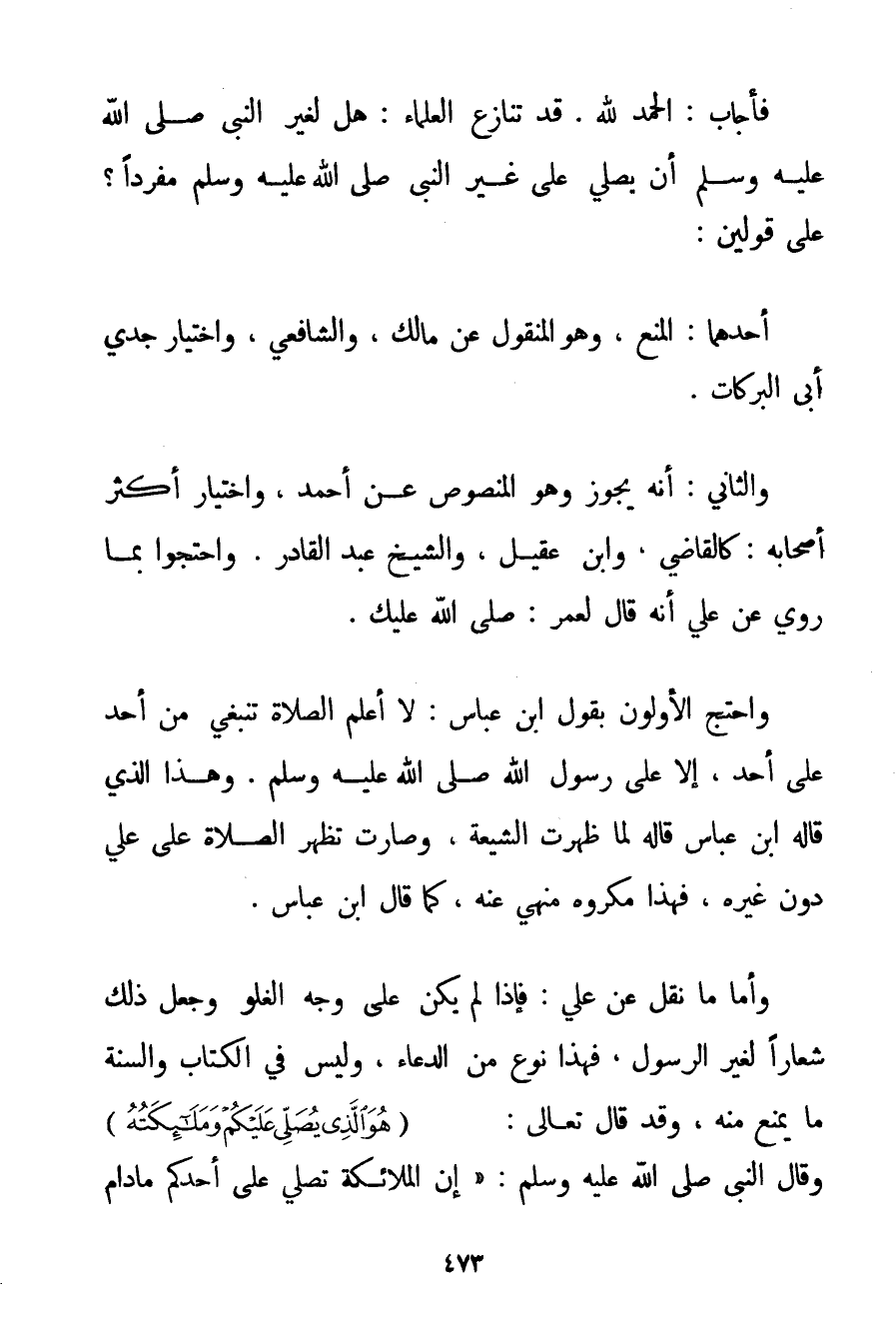 الْحَمْدُ لِلَّهِ، قَدْ تَنَازَعَ الْعُلَمَاءُ: هَلْ لِغَيْرِ النَّبِيِّ صَلَّى اللَّهُ عَلَيْهِ وَسَلَّمَ أَنْ يُصَلِّيَ عَلَى غَيْرِ النَّبِيِّ صَلَّى اللَّهُ عَلَيْهِ وَسَلَّمَ مُفْرَدًا؟ عَلَى قَوْلَيْنِ: أَحَدُهُمَا: الْمَنْعُ وَهُوَ الْمَنْقُولُ عَنْ مَالِكٍ وَالشَّافِعِيِّ وَاخْتِيَارُ جَدِّي أَبِي الْبَرَكَاتِ. وَالثَّانِي: أَنَّهُ يَجُوزُ وَهُوَ الْمَنْصُوصُ عَنْ أَحْمَد وَاخْتِيَارُ أَكْثَرِ أَصْحَابِهِ: كَالْقَاضِي وَابْنِ عَقِيلٍ وَالشَّيْخِ عَبْدِ الْقَادِرِ. وَاحْتَجُّوا بِمَا رُوِيَ عَنْ عَلِيٍّ أَنَّهُ قَالَ لِعُمَرِ: صَلَّى اللَّهُ عَلَيْك. وَاحْتَجَّ الْأَوَّلُونَ بِقَوْلِ ابْنِ عَبَّاسٍ: لَا أَعْلَمُ الصَّلَاةَ تَنْبَغِي مِنْ أَحَدٍ عَلَى أَحَدٍ إلَّا عَلَى رَسُولِ اللَّهِ صَلَّى اللَّهُ عَلَيْهِ وَسَلَّمَ. وَهَذَا الَّذِي قَالَهُ ابْنُ عَبَّاسٍ قَالَهُ لَمَّا ظَهَرَتْ الشِّيعَةُ وَصَارَتْ تُظْهِرُ الصَّلَاةَ عَلَى عَلِيٍّ دُونَ غَيْرِهِ فَهَذَا مَكْرُوهٌ مَنْهِيٌّ عَنْهُ كَمَا قَالَ ابْنُ عَبَّاسٍ. وَأَمَّا مَا نُقِلَ عَنْ عَلِيٍّ: فَإِذَا لَمْ يَكُنْ عَلَى وَجْهِ الْغُلُوِّ وَجُعِلَ ذَلِكَ شِعَارًا لِغَيْرِ الرَّسُولِ فَهَذَا نَوْعٌ مِنْ الدُّعَاءِ وَلَيْسَ فِي الْكِتَابِ وَالسُّنَّةِ مَا يَمْنَعُ مِنْهُ وَقَدْ قَالَ تَعَالَى: {هُوَ الَّذِي يُصَلِّي عَلَيْكُمْ وَمَلَائِكَتُهُ} وَقَالَ النَّبِيُّ صَلَّى اللَّهُ عَلَيْهِ وَسَلَّمَ {إنَّ الْمَلَائِكَةَ تُصَلِّي عَلَى أَحَدِكُمْ مَا دَامَ