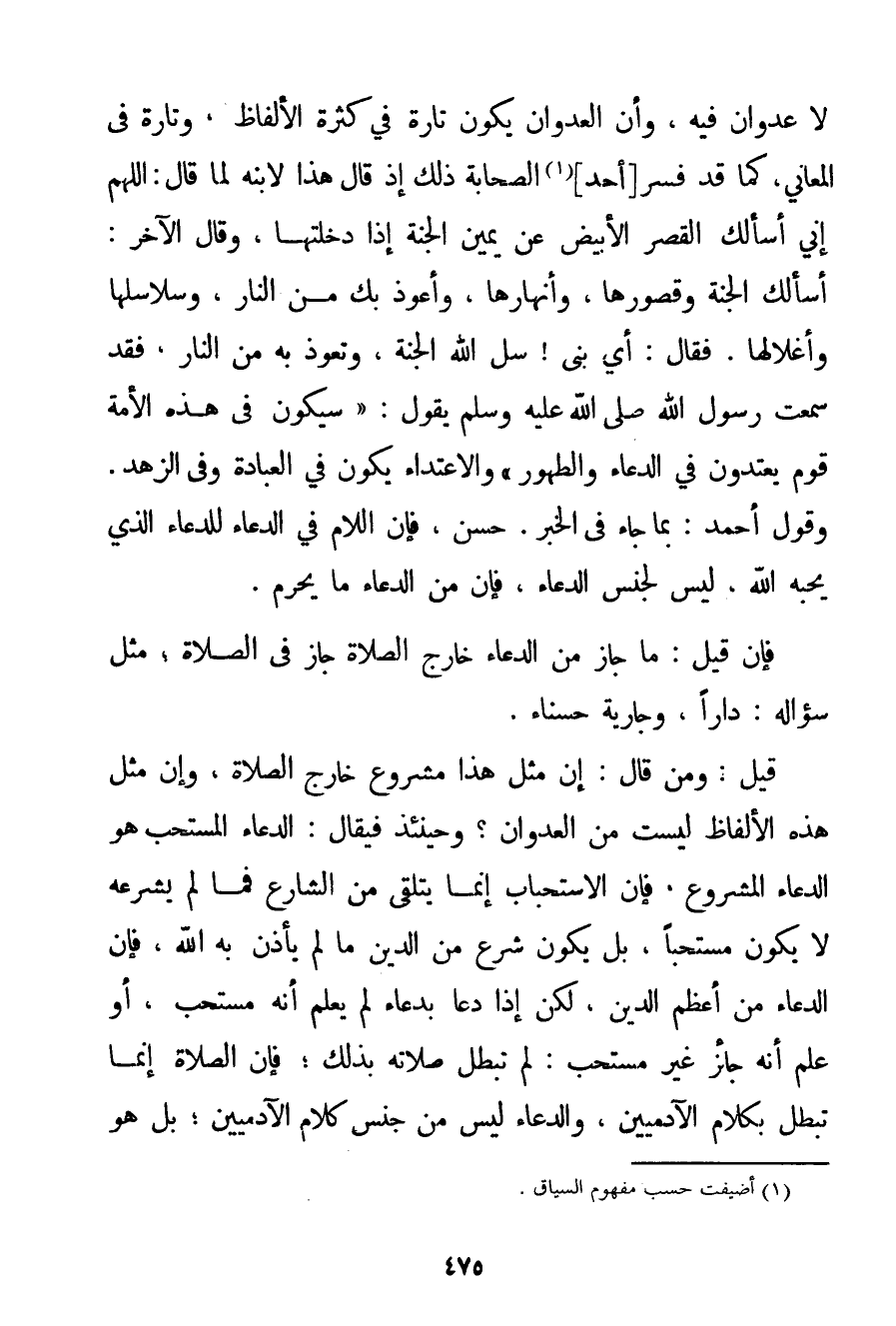 لَا عُدْوَانَ فِيهِ وَأَنَّ الْعُدْوَانَ يَكُونُ تَارَةً فِي كَثْرَةِ الْأَلْفَاظِ وَتَارَةً فِي الْمَعَانِي كَمَا قَدْ فَسَّرَ [أَحَدُ] (1) الصَّحَابَةِ ذَلِكَ إذْ قَالَ هَذَا لِابْنِهِ لَمَّا قَالَ: اللَّهُمَّ إنِّي أَسْأَلُك الْقَصْرَ الْأَبْيَضَ عَنْ يَمِينِ الْجَنَّةِ إذَا دَخَلْتهَا وَقَالَ الْآخَرُ: أَسْأَلُك الْجَنَّةَ وَقُصُورَهَا وَأَنْهَارَهَا وَأَعُوذُ بِك مِنْ النَّارِ وَسَلَاسِلِهَا وَأَغْلَالِهَا. فَقَالَ: أَيْ بُنَيَّ سَلْ اللَّهَ الْجَنَّةَ وَتَعَوَّذْ بِهِ مِنْ النَّارِ فَقَدْ سَمِعْت رَسُولَ اللَّهِ صَلَّى اللَّهُ عَلَيْهِ وَسَلَّمَ يَقُولُ: {سَيَكُونُ فِي هَذِهِ الْأُمَّةِ قَوْمٌ يَعْتَدُونَ فِي الدُّعَاءِ وَالطَّهُورِ} وَالِاعْتِدَاءُ يَكُونُ فِي الْعِبَادَةِ وَفِي الزُّهْدِ. وَقَوْلُ أَحْمَد: بِمَا جَاءَ فِي الْخَبَرِ. حَسَنٌ فَإِنَّ اللَّامَ فِي الدُّعَاءِ لِلدُّعَاءِ الَّذِي يُحِبُّهُ اللَّهُ لَيْسَ لِجِنْسِ الدُّعَاءِ فَإِنَّ مِنْ الدُّعَاءِ مَا يَحْرُمُ. فَإِنْ قِيلَ: مَا جَازَ مِنْ الدُّعَاءِ خَارِجَ الصَّلَاةِ جَازَ فِي الصَّلَاةِ مِثْلَ سُؤَالِهِ: دَارًا وَجَارِيَةً حَسْنَاءَ. قِيلَ: وَمَنْ قَالَ: إنَّ مِثْلَ هَذَا مَشْرُوعٌ خَارِجَ الصَّلَاةِ وَإِنَّ مِثْلَ هَذِهِ الْأَلْفَاظِ لَيْسَتْ مِنْ الْعُدْوَانِ؟ وَحِينَئِذٍ فَيُقَالُ: الدُّعَاءُ الْمُسْتَحَبُّ هُوَ الدُّعَاءُ الْمَشْرُوعُ فَإِنَّ الِاسْتِحْبَابَ إنَّمَا يُتَلَقَّى مِنْ الشَّارِعِ فَمَا لَمْ يَشْرَعْهُ لَا يَكُونُ مُسْتَحَبًّا بَلْ يَكُونُ شَرَعَ مِنْ الدِّينِ مَا لَمْ يَأْذَنْ بِهِ اللَّهُ فَإِنَّ الدُّعَاءَ مِنْ أَعْظَمِ الدِّينِ لَكِنْ إذَا دَعَا بِدُعَاءِ لَمْ يَعْلَمْ أَنَّهُ مُسْتَحَبٌّ أَوْ عَلِمَ أَنَّهُ جَائِزٌ غَيْرَ مُسْتَحَبٍّ: لَمْ تَبْطُلْ صَلَاتُهُ بِذَلِكَ؛ فَإِنَّ الصَّلَاةَ إنَّمَا تَبْطُلُ بِكَلَامِ الْآدَمِيِّينَ وَالدُّعَاءَ لَيْسَ مِنْ جِنْسِ كَلَامِ الْآدَمِيِّينَ؛ بَلْ هُوَ