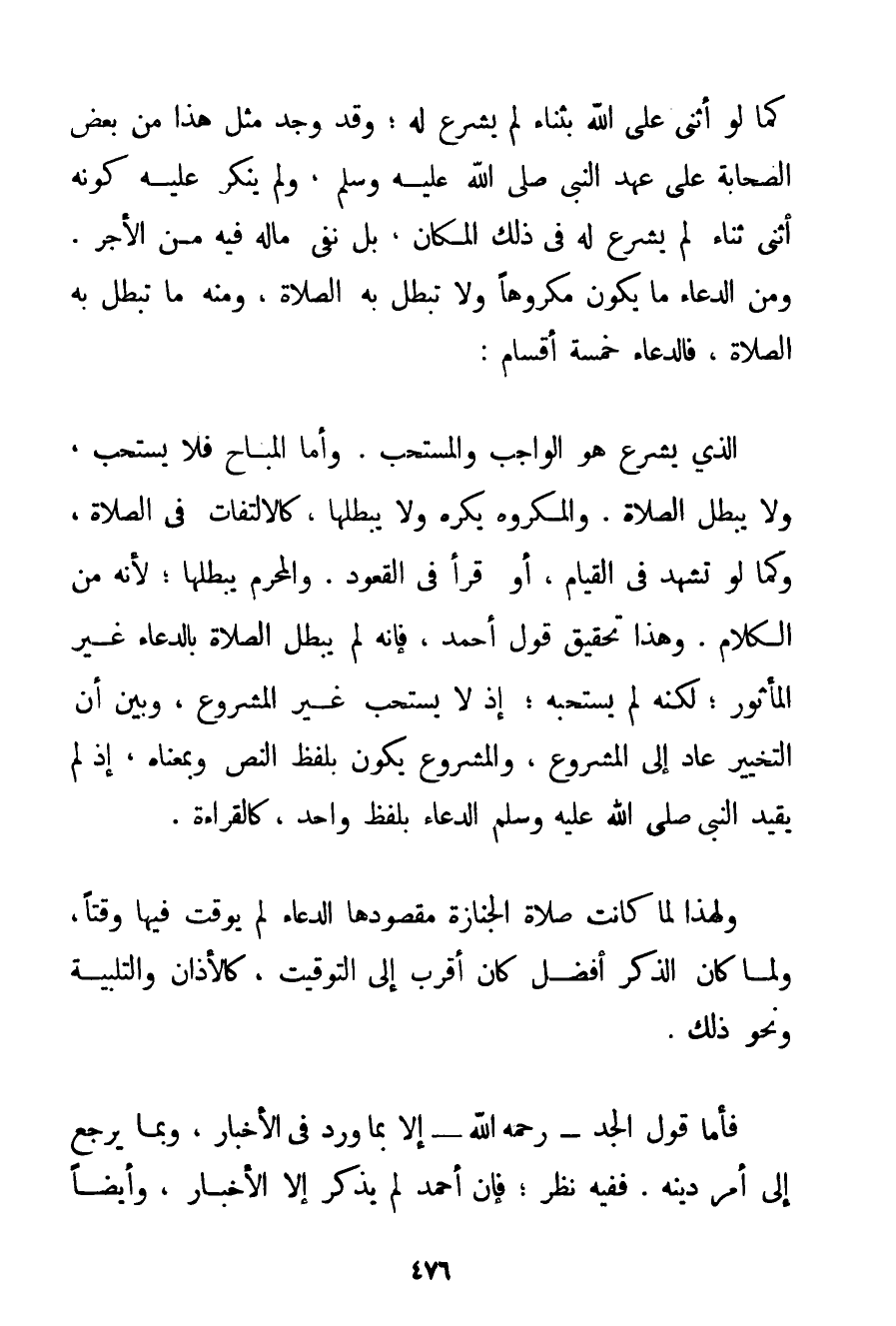 كَمَا لَوْ أَثْنَى عَلَى اللَّهِ بِثَنَاءِ لَمْ يُشْرَع لَهُ؛ وَقَدْ وُجِدَ مِثْلُ هَذَا مِنْ بَعْضِ الصَّحَابَةِ عَلَى عَهْدِ النَّبِيِّ صَلَّى اللَّهُ عَلَيْهِ وَسَلَّمَ وَلَمْ يُنْكِرْ عَلَيْهِ كَوْنَهُ أَثْنَى ثَنَاءً لَمْ يُشْرَع لَهُ فِي ذَلِكَ الْمَكَانِ بَلْ نَفَى مَا لَهُ فِيهِ مِنْ الْأَجْرِ. وَمِنْ الدُّعَاءِ مَا يَكُونُ مَكْرُوهًا وَلَا تَبْطُلُ بِهِ الصَّلَاةُ وَمِنْهُ مَا تَبْطُلُ بِهِ الصَّلَاةُ فَالدُّعَاءُ خَمْسَةُ أَقْسَامٍ: الَّذِي يُشْرَع هُوَ الْوَاجِبُ وَالْمُسْتَحَبُّ. وَأَمَّا الْمُبَاحُ فَلَا يُسْتَحَبُّ وَلَا يُبْطِلُ الصَّلَاةَ. وَالْمَكْرُوهُ يُكْرَهُ وَلَا يُبْطِلُهَا كَالِالْتِفَاتِ فِي الصَّلَاةِ وَكَمَا لَوْ تَشَهَّدَ فِي الْقِيَامِ أَوْ قَرَأَ فِي الْقُعُودِ. وَالْمُحَرَّمُ يُبْطِلُهَا؛ لِأَنَّهُ مِنْ الْكَلَامِ. وَهَذَا تَحْقِيقُ قَوْلِ أَحْمَد فَإِنَّهُ لَمْ يُبْطِلْ الصَّلَاةَ بِالدُّعَاءِ غَيْرِ الْمَأْثُورِ؛ لَكِنَّهُ لَمْ يَسْتَحِبَّهُ؛ إذْ لَا يُسْتَحَبُّ غَيْرُ الْمَشْرُوعِ وَبَيَّنَ أَنَّ التَّخْيِيرَ عَادَ إلَى الْمَشْرُوعِ وَالْمَشْرُوعُ يَكُونُ بِلَفْظِ النَّصِّ وَبِمَعْنَاهُ إذْ لَمْ يُقَيِّدْ النَّبِيُّ صَلَّى اللَّهُ عَلَيْهِ وَسَلَّمَ الدُّعَاءَ بِلَفْظِ وَاحِدٍ كَالْقِرَاءَةِ. وَلِهَذَا لَمَّا كَانَتْ صَلَاةُ الْجِنَازَةِ مَقْصُودُهَا الدُّعَاءُ لَمْ يُوَقِّتْ فِيهَا وَقْتًا وَلَمَّا كَانَ الذِّكْرُ أَفْضَلَ كَانَ أَقْرَبَ إلَى التَّوْقِيتِ كَالْأَذَانِ وَالتَّلْبِيَةِ وَنَحْوِ ذَلِكَ. فَأَمَّا قَوْلُ الْجَدِّ - رَحِمَهُ اللَّهُ - إلَّا بِمَا وَرَدَ فِي الْأَخْبَارِ وَبِمَا يَرْجِعُ إلَى أَمْرِ دِينِهِ. فَفِيهِ نَظَرٌ؛ فَإِنَّ أَحْمَد لَمْ يَذْكُرْ إلَّا الْأَخْبَارَ وَأَيْضًا