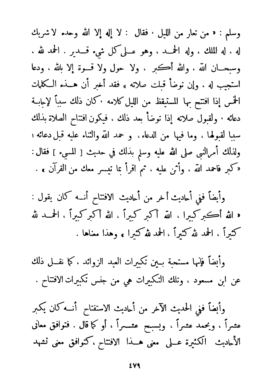 {مَنْ تَعَارَّ مِنْ اللَّيْلِ فَقَالَ: لَا إلَهَ إلَّا اللَّهُ وَحْدَهُ لَا شَرِيكَ لَهُ لَهُ الْمُلْكُ وَلَهُ الْحَمْدُ وَهُوَ عَلَى كُلِّ شَيْءٍ قَدِيرٌ. الْحَمْدُ لِلَّهِ وَسُبْحَانَ اللَّهِ وَاَللَّهُ أَكْبَرُ وَلَا حَوْلَ وَلَا قُوَّةَ إلَّا بِاَللَّهِ وَدَعَا اُسْتُجِيبَ لَهُ وَإِنْ تَوَضَّأَ قُبِلَتْ صَلَاتُهُ} فَقَدْ أَخْبَرَ أَنَّ هَذِهِ الْكَلِمَاتِ الْخَمْسَ إذَا افْتَتَحَ بِهَا الْمُسْتَيْقِظُ مِنْ اللَّيْلِ كَلَامَهُ كَانَ ذَلِكَ سَبَبًا لِإِجَابَةِ دُعَائِهِ وَلِقَبُولِ صَلَاتِهِ إذَا تَوَضَّأَ بَعْدَ ذَلِكَ فَيَكُونُ افْتِتَاحُ الصَّلَاةِ بِذَلِكَ سَبَبًا لِقَبُولِهَا وَمَا فِيهَا مِنْ الدُّعَاءِ وَحَمْدِ اللَّهِ وَالثَّنَاءِ عَلَيْهِ قَبْلَ دُعَائِهِ؛ وَلِذَلِكَ أَمَرَ النَّبِيُّ صَلَّى اللَّهُ عَلَيْهِ وَسَلَّمَ بِذَلِكَ فِي حَدِيثِ الْمُسِيءِ فَقَالَ: {كَبِّرْ فَاحْمَدْ اللَّهَ وَأُثَنَّ عَلَيْهِ ثُمَّ اقْرَأْ بِمَا تَيَسَّرَ مَعَك مِنْ الْقُرْآنِ} . وَأَيْضًا فَفِي أَحَادِيثَ أُخَرَ مِنْ أَحَادِيثِ الِافْتِتَاحِ أَنَّهُ كَانَ يَقُولُ: {اللَّهُ أَكْبَرُ كَبِيرًا اللَّهُ أَكْبَرُ كَبِيرًا اللَّهُ أَكْبَرُ كَبِيرًا الْحَمْدُ لِلَّهِ كَثِيرًا الْحَمْدُ لِلَّهِ كَثِيرًا الْحَمْدُ لِلَّهِ كَثِيرًا} وَهَذَا مَعْنَاهَا. وَأَيْضًا فَإِنَّهَا مُسْتَحَبَّةٌ بَيْنَ تَكْبِيرَاتِ الْعِيدِ الزَّوَائِدِ كَمَا نُقِلَ ذَلِكَ عَنْ ابْنِ مَسْعُودٍ وَتِلْكَ التَّكْبِيرَاتُ هِيَ مِنْ جِنْسِ تَكْبِيرَاتِ الِافْتِتَاحِ. وَأَيْضًا فَفِي الْحَدِيثِ الْآخَرِ مِنْ أَحَادِيثِ الِاسْتِفْتَاحِ أَنَّهُ كَانَ يُكَبِّرُ عَشْرًا وَيَحْمَدُ عَشْرًا وَيُسَبِّحُ عَشْرًا أَوْ كَمَا قَالَ. فَتَوَافُقُ مَعَانِي الْأَحَادِيثِ الْكَثِيرَةِ عَلَى مَعْنَى هَذَا الِافْتِتَاحِ كَتَوَافُقِ مَعْنَى تَشَهُّدِ أَبِي