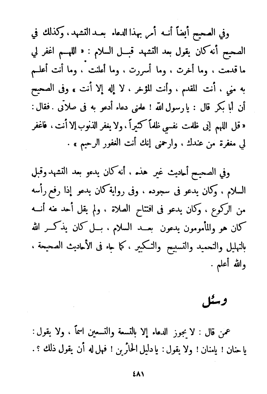 وَفِي الصَّحِيحِ أَيْضًا أَنَّهُ أَمَرَ بِهَذَا الدُّعَاءِ بَعْدَ التَّشَهُّدِ وَكَذَلِكَ فِي الصَّحِيحِ أَنَّهُ كَانَ يَقُولُ بَعْدَ التَّشَهُّدِ قَبْلَ السَّلَامِ: {اللَّهُمَّ اغْفِرْ لِي مَا قَدَّمْت وَمَا أَخَّرْت وَمَا أَسْرَرْت وَمَا أَعْلَنْت وَمَا أَنْتَ أَعْلَمُ بِهِ مِنِّي أَنْتَ الْمُقَدِّمُ وَأَنْتَ الْمُؤَخِّرُ لَا إلَهَ إلَّا أَنْتَ} وَفِي الصَّحِيحِ أَنَّ أَبَا بَكْرٍ قَالَ: يَا رَسُولَ اللَّهِ عَلِّمْنِي دُعَاءً أَدْعُو بِهِ فِي صَلَاتِي. فَقَالَ: {قُلْ اللَّهُمَّ إنِّي ظَلَمْت نَفْسِي ظُلْمًا كَثِيرًا وَلَا يَغْفِرُ الذُّنُوبَ إلَّا أَنْتَ فَاغْفِرْ لِي مَغْفِرَةً مِنْ عِنْدِك وَارْحَمْنِي إنَّك أَنْتَ الْغَفُورُ الرَّحِيمُ} . وَفِي الصَّحِيحِ أَحَادِيثُ غَيْرُ هَذِهِ أَنَّهُ كَانَ يَدْعُو بَعْدَ التَّشَهُّدِ وَقَبْلَ السَّلَامِ وَكَانَ يَدْعُو فِي سُجُودِهِ وَفِي رِوَايَةٍ كَانَ يَدْعُو إذَا رَفَعَ رَأْسَهُ مِنْ الرُّكُوعِ وَكَانَ يَدْعُو فِي افْتِتَاحِ الصَّلَاةِ وَلَمْ يَقُلْ أَحَدٌ عَنْهُ أَنَّهُ كَانَ هُوَ وَالْمَأْمُومُونَ يَدْعُونَ بَعْدَ السَّلَامِ بَلْ كَانَ يَذْكُرُ اللَّهَ بِالتَّهْلِيلِ وَالتَّحْمِيدِ وَالتَّسْبِيحِ وَالتَّكْبِيرِ كَمَا جَاءَ فِي الْأَحَادِيثِ الصَّحِيحَةِ وَاَللَّهُ أَعْلَمُ.