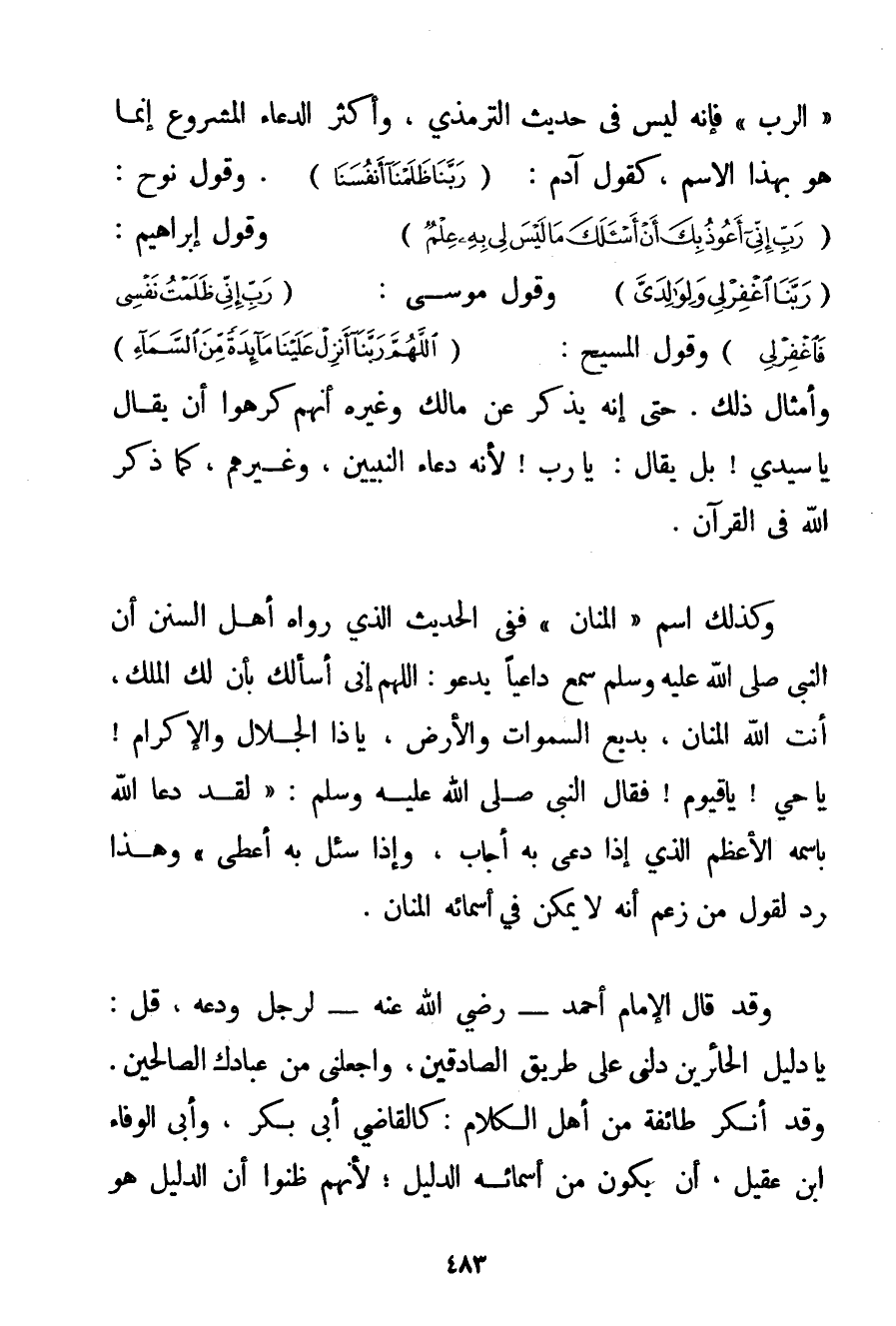 " الرَّبِّ " فَإِنَّهُ لَيْسَ فِي حَدِيثِ التِّرْمِذِيِّ وَأَكْثَرُ الدُّعَاءِ الْمَشْرُوعِ إنَّمَا هُوَ بِهَذَا الِاسْمِ كَقَوْلِ آدَمَ: {رَبَّنَا ظَلَمْنَا أَنْفُسَنَا} . وَقَوْلِ نُوحٍ: {رَبِّ إنِّي أَعُوذُ بِكَ أَنْ أَسْأَلَكَ مَا لَيْسَ لِي بِهِ عِلْمٌ} وَقَوْلِ إبْرَاهِيمَ: {رَبَّنَا اغْفِرْ لِي وَلِوَالِدَيَّ} وَقَوْلِ مُوسَى: {رَبِّ إنِّي ظَلَمْتُ نَفْسِي فَاغْفِرْ لِي} وَقَوْلِ الْمَسِيحِ: {اللَّهُمَّ رَبَّنَا أَنْزِلْ عَلَيْنَا مَائِدَةً مِنَ السَّمَاءِ} وَأَمْثَالِ ذَلِكَ. حَتَّى أَنَّهُ يُذْكَرُ عَنْ مَالِكٍ وَغَيْرِهِ أَنَّهُمْ كَرِهُوا أَنْ يُقَالَ يَا سَيِّدِي بَلْ يُقَالُ: يَا رَبِّ لِأَنَّهُ دُعَاءُ النَّبِيِّينَ وَغَيْرِهِمْ كَمَا ذَكَرَ اللَّهُ فِي الْقُرْآنِ. وَكَذَلِكَ اسْمُ " الْمَنَّانِ " فَفِي الْحَدِيثِ الَّذِي رَوَاهُ أَهْلُ السُّنَنِ {أَنَّ النَّبِيَّ صَلَّى اللَّهُ عَلَيْهِ وَسَلَّمَ سَمِعَ دَاعِيًا يَدْعُو: اللَّهُمَّ إنِّي أَسْأَلُك بِأَنَّ لَك الْمُلْكُ أَنْتَ اللَّهُ الْمَنَّانُ بَدِيعُ السَّمَوَاتِ وَالْأَرْضِ يَا ذَا الْجَلَالِ وَالْإِكْرَامِ يَا حَيُّ يَا قَيُّومُ فَقَالَ النَّبِيُّ صَلَّى اللَّهُ عَلَيْهِ وَسَلَّمَ لَقَدْ دَعَا اللَّهَ بِاسْمِهِ الْأَعْظَمِ الَّذِي إذَا دُعِيَ بِهِ أَجَابَ وَإِذَا سُئِلَ بِهِ أَعْطَى} وَهَذَا رَدٌّ لِقَوْلِ مَنْ زَعَمَ أَنَّهُ لَا يُمْكِنُ فِي أَسْمَائِهِ الْمَنَّانُ. وَقَدْ قَالَ الْإِمَامُ أَحْمَد - رَضِيَ اللَّهُ عَنْهُ - لِرَجُلِ وَدَّعَهُ قُلْ: يَا دَلِيلَ الْحَائِرِينَ دُلَّنِي عَلَى طَرِيقِ الصَّادِقِينَ وَاجْعَلْنِي مِنْ عِبَادِك الصَّالِحِينَ. وَقَدْ أَنْكَرَ طَائِفَةٌ مِنْ أَهْلِ الْكَلَامِ: كَالْقَاضِي أَبِي بَكْرٍ وَأَبِي الْوَفَاءِ ابْنِ عَقِيلٍ أَنْ يَكُونَ مِنْ أَسْمَائِهِ الدَّلِيلُ؛ لِأَنَّهُمْ ظَنُّوا أَنَّ الدَّلِيلَ