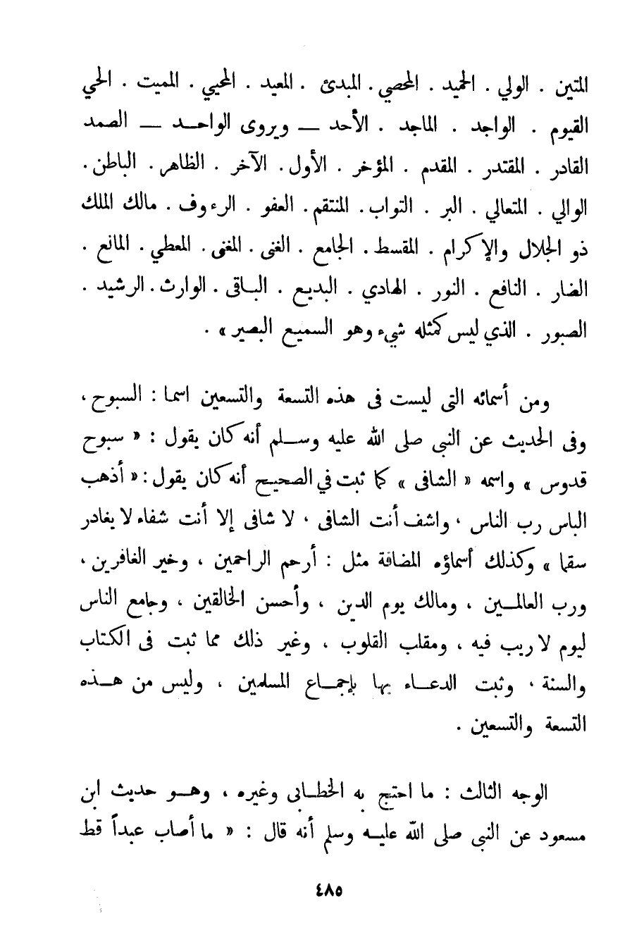 الْمَتِينُ. الْوَلِيُّ. الْحَمِيدُ. الْمُحْصِي. الْمُبْدِئُ. الْمُعِيدُ. الْمُحْيِي. الْمُمِيتُ. الْحَيُّ الْقَيُّومُ. الْوَاجِدُ. الْمَاجِدُ. الْأَحَدُ - وَيُرْوَى الْوَاحِدُ - الصَّمَدُ الْقَادِرُ. الْمُقْتَدِرُ. الْمُقَدِّمُ. الْمُؤَخِّرُ. الْأَوَّلُ. الْآخِرُ. الظَّاهِرُ. الْبَاطِنُ. الْوَالِي. الْمُتَعَالِي. الْبَرُّ. التَّوَّابُ. الْمُنْتَقِمُ. الْعَفُوُّ. الرَّءُوفُ. مَالِكُ الْمُلْكِ ذُو الْجَلَالِ وَالْإِكْرَامِ. الْمُقْسِطُ. الْجَامِعُ. الْغَنِيُّ. الْمُغْنِي. الْمُعْطِي. الْمَانِعُ. الضَّارُّ. النَّافِعُ. النُّورُ. الْهَادِي. الْبَدِيعُ. الْبَاقِي. الْوَارِثُ. الرَّشِيدُ. الصَّبُورُ. الَّذِي لَيْسَ كَمِثْلِهِ شَيْءٌ وَهُوَ السَّمِيعُ الْبَصِيرُ ". وَمِنْ أَسْمَائِهِ الَّتِي لَيْسَتْ فِي هَذِهِ التِّسْعَةِ وَالتِّسْعِينَ اسْمُهُ: السُّبُّوحُ وَفِي الْحَدِيثِ عَنْ النَّبِيِّ صَلَّى اللَّهُ عَلَيْهِ وَسَلَّمَ أَنَّهُ كَانَ يَقُولُ: {سُبُّوحٌ قُدُّوسٌ} وَاسْمُهُ " الشَّافِي " كَمَا ثَبَتَ فِي الصَّحِيحِ أَنَّهُ كَانَ يَقُولُ: {أَذْهِبْ الْبَأْسَ رَبَّ النَّاسِ وَاشْفِ أَنْتَ الشَّافِي لَا شَافِيَ إلَّا أَنْتَ شِفَاءً لَا يُغَادِرُ سَقَمًا} وَكَذَلِكَ أَسْمَاؤُهُ الْمُضَافَةُ مِثْلَ: أَرْحَمُ الرَّاحِمِينَ وَخَيْرُ الْغَافِرِينَ وَرَبُّ الْعَالَمِينَ وَمَالِكُ يَوْمِ الدِّينِ وَأَحْسَنُ الْخَالِقِينَ وَجَامِعُ النَّاسِ لِيَوْمِ لَا رَيْبَ فِيهِ وَمُقَلِّبُ الْقُلُوبِ وَغَيْرُ ذَلِكَ مِمَّا ثَبَتَ فِي الْكِتَابِ وَالسُّنَّةِ وَثَبَتَ فِي الدُّعَاءِ بِهَا بِإِجْمَاعِ الْمُسْلِمِينَ وَلَيْسَ مِنْ هَذِهِ التِّسْعَةِ وَالتِّسْعِينَ. الْوَجْهُ الثَّالِثُ: مَا احْتَجَّ بِهِ الخطابي وَغَيْرُهُ وَهُوَ حَدِيثُ ابْنِ مَسْعُودٍ عَنْ النَّبِيِّ صَلَّى اللَّهُ عَلَيْهِ وَسَلَّمَ أَنَّهُ قَالَ: {مَا أَصَابَ عَبْدًا قَطُّ