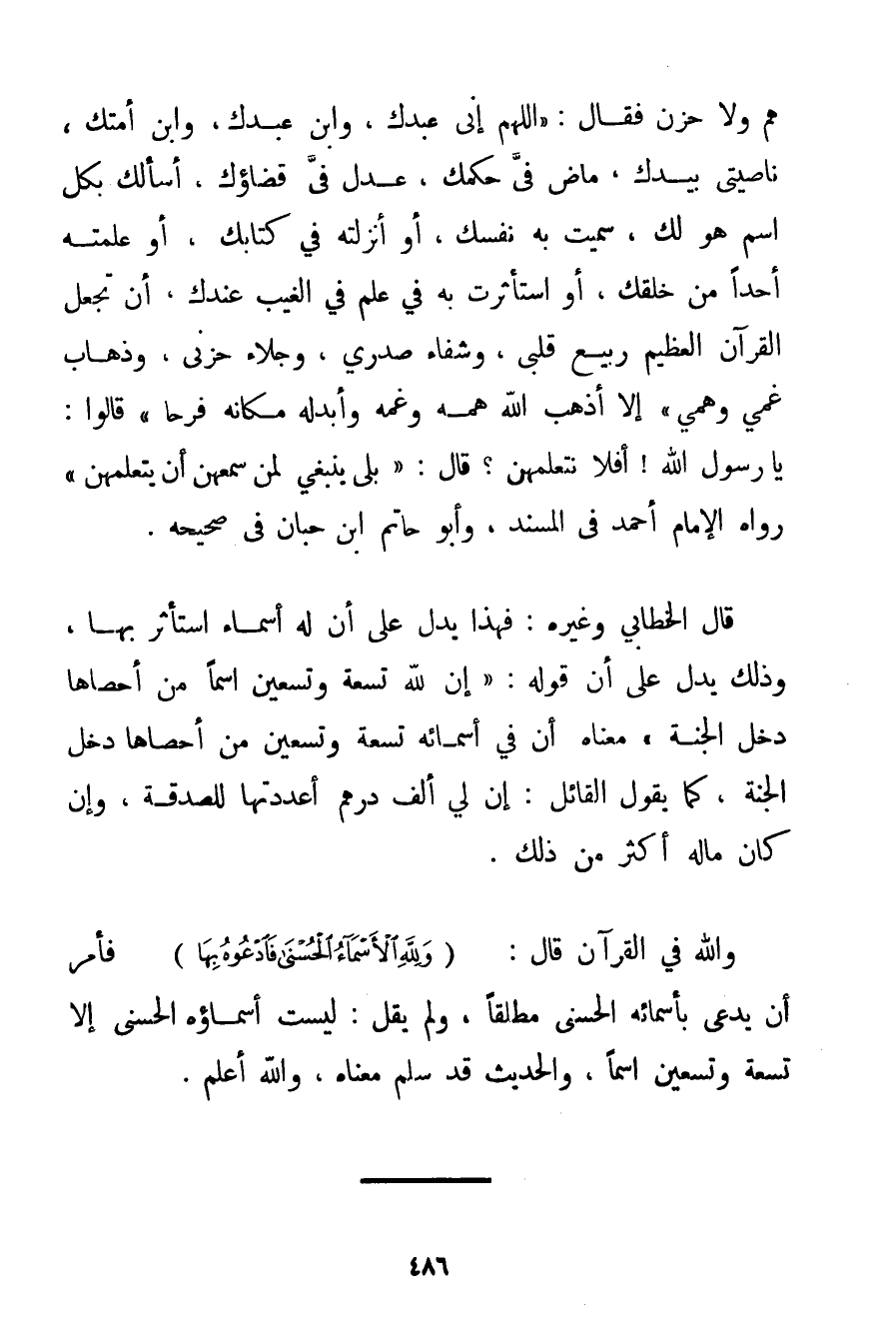 هَمٌّ وَلَا حَزَنٌ فَقَالَ: اللَّهُمَّ إنِّي عَبْدُك وَابْنُ عَبْدِك وَابْنُ أَمَتِك نَاصِيَتِي بِيَدِك مَاضٍ فِيَّ حُكْمُك عَدْلٌ فِيَّ قَضَاؤُك. أَسْأَلُك بِكُلِّ اسْمٍ هُوَ لَك سَمَّيْت بِهِ نَفْسَك أَوْ أَنْزَلْته فِي كِتَابِك أَوْ عَلَّمْته أَحَدًا مَنْ خَلْقِك أَوْ اسْتَأْثَرَتْ بِهِ فِي عِلْمِ فِي الْغَيْبِ عِنْدَك أَنْ تَجْعَلَ الْقُرْآنَ الْعَظِيمَ رَبِيعَ قَلْبِي وَشِفَاءَ صَدْرِي وَجَلَاءَ حُزْنِي وَذَهَابَ غَمِّي وَهَمِّي إلَّا أَذْهَبَ اللَّهُ هَمَّهُ وَغَمَّهُ وَأَبْدَلَهُ مَكَانَهُ فَرَحًا قَالُوا: يَا رَسُولَ اللَّهِ أَفَلَا نَتَعَلَّمُهُنَّ؟ قَالَ: بَلَى يَنْبَغِي لِمَنْ سَمِعَهُنَّ أَنْ يَتَعَلَّمَهُنَّ} رَوَاهُ الْإِمَامُ أَحْمَد فِي الْمُسْنَدِ وَأَبُو حَاتِمٍ وَابْنُ حِبَّانَ فِي صَحِيحِهِ. قَالَ الخطابي وَغَيْرُهُ: فَهَذَا يَدُلُّ عَلَى أَنَّ لَهُ أَسْمَاءً اسْتَأْثَرَ بِهَا وَذَلِكَ يَدُلُّ عَلَى أَنَّ قَوْلَهُ: {إنَّ لِلَّهِ تِسْعَةً وَتِسْعِينَ اسْمًا مَنْ أَحْصَاهَا دَخَلَ الْجَنَّةَ} أَنَّ فِي أَسْمَائِهِ تِسْعَةً وَتِسْعِينَ مَنْ أَحْصَاهَا دَخَلَ الْجَنَّةَ كَمَا يَقُولُ الْقَائِلُ: إنَّ لِي أَلْفَ دِرْهَمٍ أَعْدَدْتهَا لِلصَّدَقَةِ وَإِنْ كَانَ مَالُهُ أَكْثَرَ مِنْ ذَلِكَ. وَاَللَّهُ فِي الْقُرْآنِ قَالَ: {وَلِلَّهِ الْأَسْمَاءُ الْحُسْنَى فَادْعُوهُ بِهَا} فَأَمَرَ أَنْ يُدْعَى بِأَسْمَائِهِ الْحُسْنَى مُطْلَقًا وَلَمْ يَقُلْ: لَيْسَتْ أَسْمَاؤُهُ الْحُسْنَى إلَّا تِسْعَةً وَتِسْعِينَ اسْمًا وَالْحَدِيثُ قَدْ سَلِمَ مَعْنَاهُ وَاَللَّهُ أَعْلَمُ.
