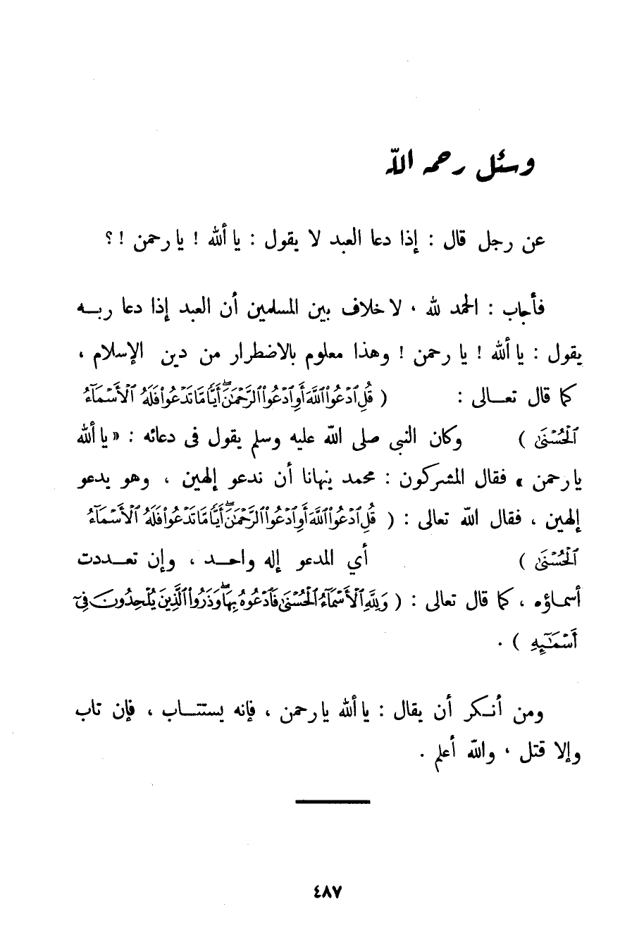 الْحَمْدُ لِلَّهِ، لَا خِلَافَ بَيْنِ الْمُسْلِمِينَ أَنَّ الْعَبْدَ إذَا دَعَا رَبَّهُ يَقُولُ: يَا اللَّهُ يَا رَحْمَنُ وَهَذَا مَعْلُومٌ بِالِاضْطِرَارِ مِنْ دِينِ الْإِسْلَامِ كَمَا قَالَ تَعَالَى: {قُلِ ادْعُوا اللَّهَ أَوِ ادْعُوا الرَّحْمَنَ أَيًّا مَا تَدْعُوا فَلَهُ الْأَسْمَاءُ الْحُسْنَى} وَكَانَ النَّبِيُّ صَلَّى اللَّهُ عَلَيْهِ وَسَلَّمَ يَقُولُ فِي دُعَائِهِ: {يَا اللَّهُ يَا رَحْمَنُ} فَقَالَ الْمُشْرِكُونَ: مُحَمَّدٌ يَنْهَانَا أَنْ نَدْعُوَ إلَهَيْنِ وَهُوَ يَدْعُو إلَهَيْنِ فَقَالَ اللَّهُ تَعَالَى: {قُلِ ادْعُوا اللَّهَ أَوِ ادْعُوا الرَّحْمَنَ أَيًّا مَا تَدْعُوا فَلَهُ الْأَسْمَاءُ الْحُسْنَى} أَيْ الْمَدْعُوُّ إلَهٌ وَاحِدٌ وَإِنْ تَعَدَّدَتْ أَسْمَاؤُهُ كَمَا قَالَ تَعَالَى: {وَلِلَّهِ الْأَسْمَاءُ الْحُسْنَى فَادْعُوهُ بِهَا وَذَرُوا الَّذِينَ يُلْحِدُونَ فِي أَسْمَائِهِ} . وَمَنْ أَنْكَرَ أَنْ يُقَالَ: يَا اللَّهُ يَا رَحْمَنُ فَإِنَّهُ يُسْتَتَابُ فَإِنْ تَابَ وَإِلَّا قُتِلَ وَاَللَّهُ أَعْلَمُ.