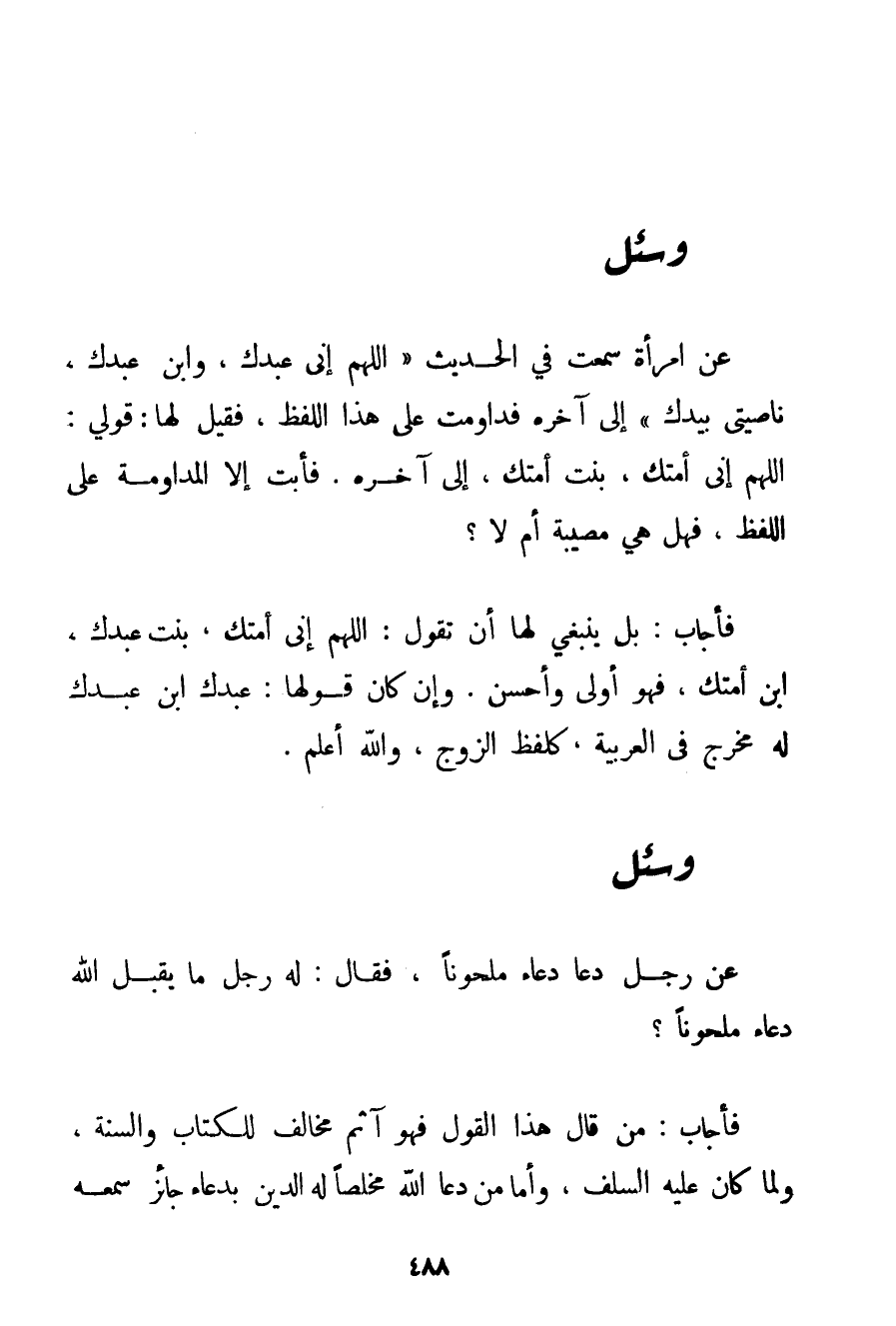 بَلْ يَنْبَغِي لَهَا أَنْ تَقُولَ: اللَّهُمَّ إنِّي أَمَتُك بِنْتُ عَبْدِك ابْنِ أَمَتِك فَهُوَ أَوْلَى وَأَحْسَنُ. وَإِنْ كَانَ قَوْلُهَا: عَبْدُك ابْنُ عَبْدِك لَهُ مَخْرَجٌ فِي الْعَرَبِيَّةِ كَلَفْظِ الزَّوْجِ وَاَللَّهُ أَعْلَمُ.