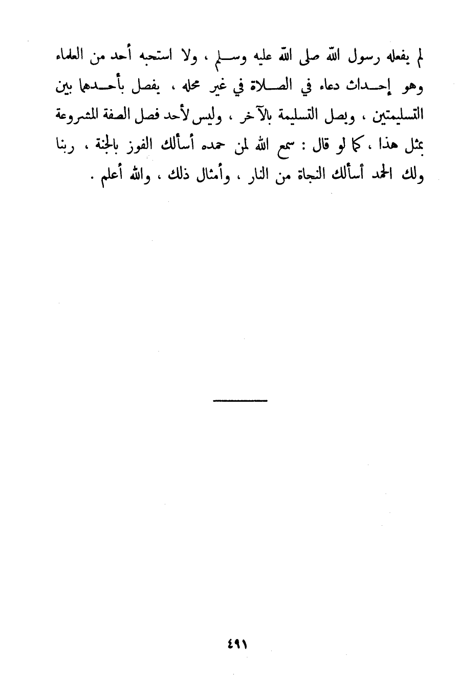 لَمْ يَفْعَلْهُ رَسُولُ اللَّهِ صَلَّى اللَّهُ عَلَيْهِ وَسَلَّمَ وَلَا اسْتَحَبَّهُ أَحَدٌ مِنْ الْعُلَمَاءِ وَهُوَ إحْدَاثُ دُعَاءٍ فِي الصَّلَاةِ فِي غَيْرِ مَحَلِّهِ يَفْصِلُ بِأَحَدِهِمَا بَيْنَ التَّسْلِيمَتَيْنِ وَيَصِلُ التَّسْلِيمَةَ بِالْآخَرِ وَلَيْسَ لِأَحَدِ فَصْلُ الصِّفَةِ الْمَشْرُوعَةِ بِمِثْلِ هَذَا كَمَا لَوْ قَالَ: سَمِعَ اللَّهُ لِمَنْ حَمِدَهُ أَسْأَلُك الْفَوْزَ بِالْجَنَّةِ رَبَّنَا وَلَك الْحَمْدُ أَسْأَلُك النَّجَاةَ مِنْ النَّارِ وَأَمْثَالِ ذَلِكَ وَاَللَّهُ أَعْلَمُ.