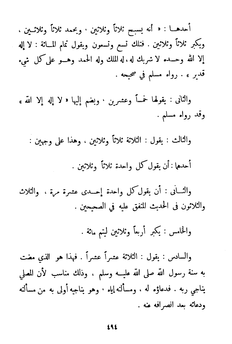 أَحَدُهَا: {أَنَّهُ يُسَبِّحُ ثَلَاثًا وَثَلَاثِينَ وَيَحْمَدُ ثَلَاثًا وَثَلَاثِينَ وَيُكَبِّرُ ثَلَاثًا وَثَلَاثِينَ. فَتِلْكَ تِسْعٌ وَتِسْعُونَ وَيَقُولُ تَمَامَ الْمِائَةِ: لَا إلَهَ إلَّا اللَّهُ وَحْدَهُ. لَا شَرِيكَ لَهُ لَهُ الْمُلْكُ وَلَهُ الْحَمْدُ وَهُوَ عَلَى كُلِّ شَيْءٍ قَدِيرٌ} . رَوَاهُ مُسْلِمٌ فِي صَحِيحِهِ. وَالثَّانِي: يَقُولُهَا خَمْسًا وَعِشْرِينَ وَيَضُمُّ إلَيْهَا " لَا إلَهَ إلَّا اللَّهُ " وَقَدْ رَوَاهُ مُسْلِمٌ. وَالثَّالِثُ: يَقُولُ الثَّلَاثَةَ ثَلَاثًا وَثَلَاثِينَ وَهَذَا عَلَى وَجْهَيْنِ: أَحَدُهُمَا: أَنْ يَقُولَ كُلَّ وَاحِدَةٍ ثَلَاثًا وَثَلَاثِينَ. وَالثَّانِي: أَنْ يَقُولَ كُلَّ وَاحِدَةٍ إحْدَى عَشْرَةَ مَرَّةً وَالثَّلَاثُ وَالثَّلَاثُونَ فِي الْحَدِيثِ الْمُتَّفَقِ عَلَيْهِ فِي الصَّحِيحَيْنِ. وَالْخَامِسُ: يُكَبِّرُ أَرْبَعًا وَثَلَاثِينَ لِيُتِمَّ مِائَةً. وَالسَّادِسُ: يَقُولُ: الثَّلَاثَةَ عَشْرًا عَشْرًا. فَهَذَا هُوَ الَّذِي مَضَتْ بِهِ سُنَّةُ رَسُولِ اللَّهِ صَلَّى اللَّهُ عَلَيْهِ وَسَلَّمَ وَذَلِكَ مُنَاسِبٌ لِأَنَّ الْمُصَلِّيَ يُنَاجِي رَبَّهُ. فَدُعَاؤُهُ لَهُ وَمَسْأَلَتُهُ إيَّاهُ وَهُوَ يُنَاجِيهِ أَوْلَى بِهِ مِنْ مَسْأَلَتِهِ وَدُعَائِهِ بَعْدَ انْصِرَافِهِ عَنْهُ.