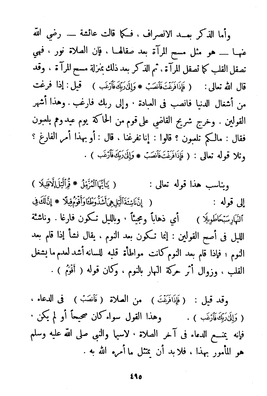 وَأَمَّا الذِّكْرُ بَعْدَ الِانْصِرَافِ فَكَمَا قَالَتْ عَائِشَةُ - رَضِيَ اللَّهُ عَنْهَا - هُوَ مِثْلَ مَسْحِ الْمِرْآةِ بَعْدَ صِقَالِهَا فَإِنَّ الصَّلَاةَ نُورٌ فَهِيَ تَصْقُلُ الْقَلْبَ كَمَا تُصْقَلُ الْمِرْآةُ ثُمَّ الذِّكْرُ بَعْدَ ذَلِكَ بِمَنْزِلَةِ مَسْحِ الْمِرْآةِ وَقَدْ قَالَ اللَّهُ تَعَالَى: {فَإِذَا فَرَغْتَ فَانْصَبْ} {وَإِلَى رَبِّكَ فَارْغَبْ} قِيلَ: إذَا فَرَغْت مِنْ أَشْغَالِ الدُّنْيَا فَانْصَبْ فِي الْعِبَادَةِ وَإِلَى رَبِّك فَارْغَبْ. وَهَذَا أَشْهَرُ الْقَوْلَيْنِ. وَخَرَجَ شريح الْقَاضِي عَلَى قَوْمٍ مِنْ الْحَاكَّةِ يَوْمَ عِيدٍ وَهُمْ يَلْعَبُونَ فَقَالَ: مَا لَكُمْ تَلْعَبُونَ؟ قَالُوا: إنَّا تَفَرَّغْنَا قَالَ: أَوَبِهَذَا أُمِرَ الْفَارِغُ؟ وَتَلَا قَوْله تَعَالَى {فَإِذَا فَرَغْتَ فَانْصَبْ} {وَإِلَى رَبِّكَ فَارْغَبْ} . وَيُنَاسِبُ هَذَا قَوْله تَعَالَى {يَا أَيُّهَا الْمُزَّمِّلُ} {قُمِ اللَّيْلَ إلَّا قَلِيلًا} إلَى قَوْلِهِ: {إنَّ نَاشِئَةَ اللَّيْلِ هِيَ أَشَدُّ وَطْئًا وَأَقْوَمُ قِيلًا} {إنَّ لَكَ فِي النَّهَارِ سَبْحًا طَوِيلًا} أَيْ ذَهَابًا وَمَجِيئًا وَبِاللَّيْلِ تَكُونُ فَارِغًا. وَنَاشِئَةُ اللَّيْلِ فِي أَصَحِّ الْقَوْلَيْنِ: إنَّمَا تَكُونُ بَعْدَ النَّوْمِ يُقَالُ نَشَأَ إذَا قَامَ بَعْدَ النَّوْمِ؛ فَإِذَا قَامَ بَعْدَ النَّوْمِ كَانَتْ مُوَاطَأَةُ قَلْبِهِ لِلِسَانِهِ أَشَدَّ لِعَدَمِ مَا يَشْغَلُ الْقَلْبَ وَزَوَالِ أَثَرِ حَرَكَةِ النَّهَارِ بِالنَّوْمِ وَكَانَ قَوْلُهُ (أَقْوَمُ. وَقَدْ قِيلَ: {فَإِذَا فَرَغْتَ} مِنْ الصَّلَاةِ {فَانْصَبْ} فِي الدُّعَاءِ {وَإِلَى رَبِّكَ فَارْغَبْ} . وَهَذَا الْقَوْلُ سَوَاءٌ كَانَ صَحِيحًا أَوْ لَمْ يَكُنْ فَإِنَّهُ يَمْنَعُ الدُّعَاءَ فِي آخِرِ الصَّلَاةِ لَا سِيَّمَا وَالنَّبِيُّ صَلَّى اللَّهُ عَلَيْهِ وَسَلَّمَ هُوَ الْمَأْمُورُ بِهَذَا فَلَا بُدَّ أَنْ يَمْتَثِلَ مَا أَمَرَهُ اللَّهُ بِهِ.