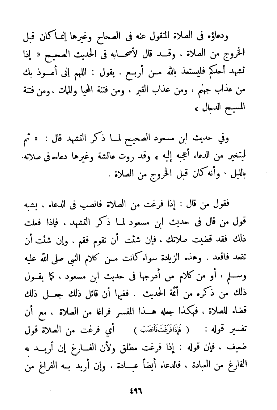 وَدُعَاؤُهُ فِي الصَّلَاةِ الْمَنْقُولُ عَنْهُ فِي الصِّحَاحِ وَغَيْرِهَا إنَّمَا كَانَ قَبْلَ الْخُرُوجِ مِنْ الصَّلَاةِ وَقَدْ قَالَ لِأَصْحَابِهِ فِي الْحَدِيثِ الصَّحِيحِ {إذَا تَشَهَّدَ أَحَدُكُمْ فَلْيَسْتَعِذْ بِاَللَّهِ مِنْ أَرْبَعٍ. يَقُولُ: اللَّهُمَّ إنِّي أَعُوذُ بِك مِنْ عَذَابِ جَهَنَّمَ وَمِنْ عَذَابِ الْقَبْرِ وَمِنْ فِتْنَةِ الْمَحْيَا وَالْمَمَاتِ وَمِنْ فِتْنَةِ الْمَسِيحِ الدَّجَّالِ} وَفِي حَدِيثِ ابْنِ مَسْعُودٍ الصَّحِيحِ لَمَّا ذَكَرَ التَّشَهُّدَ قَالَ: {ثُمَّ لِيَتَخَيَّر مِنْ الدُّعَاءِ أَعْجَبَهُ إلَيْهِ} وَقَدْ رَوَتْ عَائِشَةُ وَغَيْرُهَا دُعَاءَهُ فِي صَلَاتِهِ بِاللَّيْلِ. وَأَنَّهُ كَانَ قَبْلَ الْخُرُوجِ مِنْ الصَّلَاةِ. فَقَوْلُ مَنْ قَالَ: إذَا فَرَغْت مِنْ الصَّلَاةِ فَانْصَبْ فِي الدُّعَاءِ يُشْبِهُ قَوْلَ مَنْ قَالَ فِي حَدِيثِ ابْنِ مَسْعُودٍ لَمَّا ذَكَرَ التَّشَهُّدَ فَإِذَا فَعَلْت ذَلِكَ فَقَدْ قَضَيْت صَلَاتَك فَإِنْ شِئْت أَنْ تَقُومَ فَقُمْ وَإِنْ شِئْت أَنْ تَقْعُدَ فَاقْعُدْ. وَهَذِهِ الزِّيَادَةُ سَوَاءٌ كَانَتْ مِنْ كَلَامِ النَّبِيِّ صَلَّى اللَّهُ عَلَيْهِ وَسَلَّمَ أَوْ مِنْ كَلَامِ مَنْ أَدْرَجَهَا فِي حَدِيثِ ابْنِ مَسْعُودٍ كَمَا يَقُولُ ذَلِكَ مَنْ ذَكَرَهُ مِنْ أَئِمَّةِ الْحَدِيثِ. فَفِيهَا أَنَّ قَائِلَ ذَلِكَ جَعَلَ ذَلِكَ قَضَاءً لِلصَّلَاةِ فَهَكَذَا جَعَلَهُ هَذَا الْمُفَسِّرُ فَرَاغًا مِنْ الصَّلَاةِ مَعَ أَنَّ تَفْسِيرَ قَوْلِهِ: {فَإِذَا فَرَغْتَ فَانْصَبْ} أَيْ فَرَغْت مِنْ الصَّلَاةِ قَوْلٌ ضَعِيفٌ فَإِنَّ قَوْلَهُ: إذَا فَرَغْت مُطْلَقٌ وَلِأَنَّ الْفَارِغَ إنْ أُرِيدَ بِهِ الْفَارِغُ مِنْ الْعِبَادَةِ فَالدُّعَاءُ أَيْضًا عِبَادَةٌ وَإِنْ أُرِيدَ بِهِ الْفَرَاغُ مِنْ