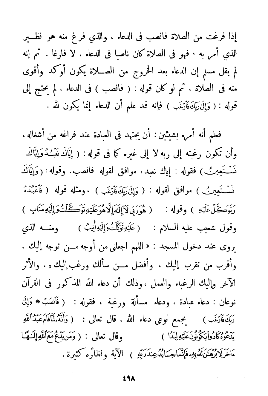 إذَا فَرَغْت مِنْ الصَّلَاةِ فَانْصَبْ فِي الدُّعَاءِ وَاَلَّذِي فَرَغَ مِنْهُ هُوَ نَظِيرُ الَّذِي أُمِرَ بِهِ فَهُوَ فِي الصَّلَاةِ كَانَ نَاصِبًا فِي الدُّعَاءِ لَا فَارِغًا. ثُمَّ إنَّهُ لَمْ يَقُلْ مُسْلِمٌ إنَّ الدُّعَاءَ بَعْدَ الْخُرُوجِ مِنْ الصَّلَاةِ يَكُونُ أَوْكَدَ وَأَقْوَى مِنْهُ فِي الصَّلَاةِ ثُمَّ لَوْ كَانَ قَوْلُهُ: (فَانْصَبْ فِي الدُّعَاءِ لَمْ يُحْتَجْ إلَى قَوْلِهِ: {وَإِلَى رَبِّكَ فَارْغَبْ} فَإِنَّهُ قَدْ عُلِمَ أَنَّ الدُّعَاءَ إنَّمَا يَكُونُ لِلَّهِ. فَعُلِمَ أَنَّهُ أَمَرَهُ بِشَيْئَيْنِ: أَنْ يَجْتَهِدَ فِي الْعِبَادَةِ عِنْدَ فَرَاغِهِ مِنْ أَشْغَالِهِ وَأَنْ تَكُونَ رَغْبَتُهُ إلَى رَبِّهِ لَا إلَى غَيْرِهِ كَمَا فِي قَوْلِهِ: {إيَّاكَ نَعْبُدُ وَإِيَّاكَ نَسْتَعِينُ} فَقَوْلُهُ: {إيَّاكَ نَعْبُدُ} مُوَافِقٌ لِقَوْلِهِ فَانْصَبْ. وَقَوْلُهُ: {وَإِيَّاكَ نَسْتَعِينُ} مُوَافِقٌ لِقَوْلِهِ: {وَإِلَى رَبِّكَ فَارْغَبْ} وَمِثْلُهُ قَوْلُهُ {فَاعْبُدْهُ وَتَوَكَّلْ عَلَيْهِ} وَقَوْلُهُ: {هُوَ رَبِّي لَا إلَهَ إلَّا هُوَ عَلَيْهِ تَوَكَّلْتُ وَإِلَيْهِ مَتَابِ} وَقَوْلُ شُعَيْبٍ عَلَيْهِ السَّلَامُ {عَلَيْهِ تَوَكَّلْتُ وَإِلَيْهِ أُنِيبُ} وَمِنْهُ الَّذِي يُرْوَى عِنْدَ دُخُولِ الْمَسْجِدِ: {اللَّهُمَّ اجْعَلْنِي مِنْ أَوْجَهِ مَنْ تَوَجَّهَ إلَيْك وَأَقْرَبِ مَنْ تَقَرَّبَ إلَيْك وَأَفْضَلِ مَنْ سَأَلَك وَرَغِبَ إلَيْك} وَالْأَثَرُ الْآخَرُ وَإِلَيْك الرغباء وَالْعَمَلُ وَذَلِكَ أَنَّ دُعَاءَ اللَّهِ الْمَذْكُورَ فِي الْقُرْآنِ نَوْعَانِ: دُعَاءُ عِبَادَةٍ وَدُعَاءُ مَسْأَلَةٍ وَرَغْبَةٍ فَقَوْلُهُ: {فَانْصَبْ} {وَإِلَى رَبِّكَ فَارْغَبْ} يَجْمَعُ نَوْعَيْ دُعَاءِ اللَّهِ قَالَ تَعَالَى: {وَأَنَّهُ لَمَّا قَامَ عَبْدُ اللَّهِ يَدْعُوهُ كَادُوا يَكُونُونَ عَلَيْهِ لِبَدًا} وَقَالَ تَعَالَى: {وَمَنْ يَدْعُ مَعَ اللَّهِ إلَهًا آخَرَ لَا بُرْهَانَ لَهُ بِهِ فَإِنَّمَا حِسَابُهُ عِنْدَ رَبِّهِ} الْآيَةَ وَنَظَائِرُهُ كَثِيرَةٌ.