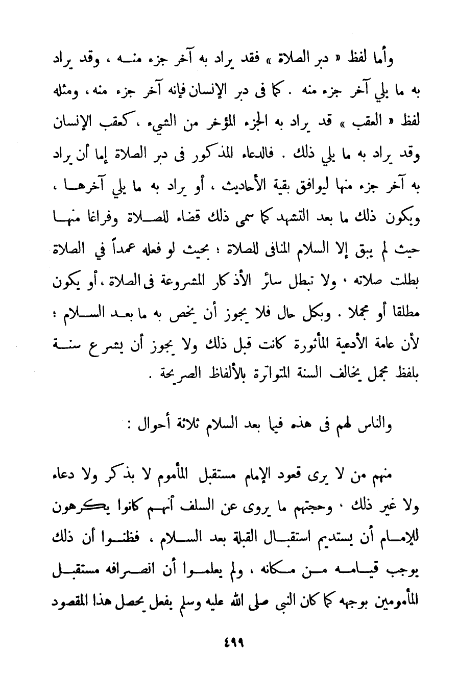 وَأَمَّا لَفْظُ " دُبُرَ الصَّلَاةِ " فَقَدْ يُرَادُ بِهِ آخِرَ جُزْءٍ مِنْهُ وَقَدْ يُرَادُ بِهِ مَا يَلِي آخِرَ جُزْءٍ مِنْهُ. كَمَا فِي دُبُرِ الْإِنْسَانِ فَإِنَّهُ آخِرُ جُزْءٍ مِنْهُ وَمِثْلُهُ لَفْظُ " الْعَقِبِ " قَدْ يُرَادُ بِهِ الْجُزْءَ الْمُؤَخَّرَ مِنْ الشَّيْءِ كَعَقِبِ الْإِنْسَانِ وَقَدْ يُرَادُ بِهِ مَا يَلِي ذَلِكَ. فَالدُّعَاءُ الْمَذْكُورُ فِي دُبُرِ الصَّلَاةِ إمَّا أَنْ يُرَادَ بِهِ آخِرَ جُزْءٍ مِنْهَا لِيُوَافَقَ بَقِيَّةَ الْأَحَادِيثِ أَوْ يُرَادَ بِهِ مَا يَلِي آخِرَهَا وَيَكُونُ ذَلِكَ مَا بَعْدَ التَّشَهُّدِ كَمَا سُمِّيَ ذَلِكَ قَضَاءً لِلصَّلَاةِ وَفَرَاغًا مِنْهَا حَيْثُ لَمْ يَبْقَ إلَّا السَّلَامُ الْمُنَافِي لِلصَّلَاةِ؛ بِحَيْثُ لَوْ فَعَلَهُ عَمْدًا فِي الصَّلَاةِ بَطَلَتْ صَلَاتُهُ وَلَا تَبْطُلُ سَائِرُ الْأَذْكَارِ الْمَشْرُوعَةِ فِي الصَّلَاةِ أَوْ يَكُونُ مُطْلَقًا أَوْ مُجْمَلًا. وَبِكُلِّ حَالٍ فَلَا يَجُوزُ أَنْ يُخَصَّ بِهِ مَا بَعْدَ السَّلَامِ؛ لِأَنَّ عَامَّةَ الْأَدْعِيَةِ الْمَأْثُورَةِ كَانَتْ قَبْلَ ذَلِكَ وَلَا يَجُوزُ أَنْ يُشَرِّعَ سُنَّةً بِلَفْظِ مُجْمَلٍ يُخَالِفُ السُّنَّةَ الْمُتَوَاتِرَةَ بِالْأَلْفَاظِ الصَّرِيحَةِ. وَالنَّاسُ لَهُمْ فِي هَذِهِ فِيمَا بَعْدَ السَّلَامِ ثَلَاثَةُ أَحْوَالٍ: مِنْهُمْ مَنْ لَا يَرَى قُعُودَ الْإِمَامِ مُسْتَقْبِلَ الْمَأْمُومِ لَا بِذِكْرِ وَلَا دُعَاءٍ وَلَا غَيْرِ ذَلِكَ وَحُجَّتُهُمْ مَا يُرْوَى عَنْ السَّلَفِ أَنَّهُمْ كَانُوا يَكْرَهُونَ لِلْإِمَامِ أَنْ يَسْتَدِيمَ اسْتِقْبَالَ الْقِبْلَةِ بَعْدَ السَّلَامِ فَظَنُّوا أَنَّ ذَلِكَ يُوجِبُ قِيَامَهُ مِنْ مَكَانِهِ وَلَمْ يَعْلَمُوا أَنَّ انْصِرَافَهُ مُسْتَقْبِلَ الْمَأْمُومِينَ بِوَجْهِهِ كَمَا كَانَ النَّبِيُّ صَلَّى اللَّهُ عَلَيْهِ وَسَلَّمَ يَفْعَلُ يُحَصِّلُ هَذَا الْمَقْصُودَ