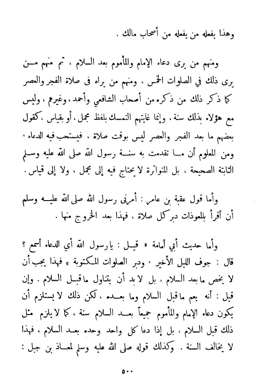 وَهَذَا يَفْعَلُهُ مَنْ يَفْعَلُهُ مِنْ أَصْحَابِ مَالِكٍ. وَمِنْهُمْ مَنْ يَرَى دُعَاءَ الْإِمَامِ وَالْمَأْمُومِ بَعْدَ السَّلَامِ ثُمَّ مِنْهُمْ مَنْ يَرَى ذَلِكَ فِي الصَّلَوَاتِ الْخَمْسِ وَمِنْهُمْ مَنْ يَرَاهُ فِي صَلَاةِ الْفَجْرِ وَالْعَصْرِ كَمَا ذَكَرَ ذَلِكَ مَنْ ذَكَرَهُ مِنْ أَصْحَابِ الشَّافِعِيِّ وَأَحْمَد وَغَيْرِهِمْ وَلَيْسَ مَعَ هَؤُلَاءِ بِذَلِكَ سُنَّةٌ وَإِنَّمَا غَايَتُهُمْ التَّمَسُّكُ بِلَفْظِ مُجْمَلٍ أَوْ بِقِيَاسِ كَقَوْلِ بَعْضِهِمْ مَا بَعْدَ الْفَجْرِ وَالْعَصْرِ لَيْسَ بِوَقْتِ صَلَاةٍ فَيُسْتَحَبُّ فِيهِ الدُّعَاءُ وَمِنْ الْمَعْلُومِ أَنَّ مَا تَقَدَّمَتْ بِهِ سُنَّةُ رَسُولِ اللَّهِ صَلَّى اللَّهُ عَلَيْهِ وَسَلَّمَ الثَّابِتَةُ الصَّحِيحَةُ بَلْ الْمُتَوَاتِرَةُ لَا يُحْتَاجُ فِيهِ إلَى مُجْمَلٍ وَلَا إلَى قِيَاسٍ. وَأَمَّا قَوْلُ عُقْبَةَ بْنِ عَامِرٍ: أَمَرَنِي رَسُولُ اللَّهِ صَلَّى اللَّهُ عَلَيْهِ وَسَلَّمَ أَنْ اقْرَأْ بِالْمُعَوِّذَاتِ دُبُرَ كُلِّ صَلَاةٍ فَهَذَا بَعْدَ الْخُرُوجِ مِنْهَا. وَأَمَّا {حَدِيثُ أَبِي أمامة قِيلَ: يَا رَسُولَ اللَّهِ أَيُّ الدُّعَاءِ أَسْمَعُ؟ قَالَ: جَوْفَ اللَّيْلِ الْأَخِيرِ وَدُبُرَ الصَّلَوَاتِ الْمَكْتُوبَةِ} فَهَذَا يَجِبُ أَنْ لَا يَخُصَّ مَا بَعْدَ السَّلَامِ بَلْ لَا بُدَّ أَنْ يَتَنَاوَلَ مَا قَبْلَ السَّلَامِ. وَإِنْ قِيلَ: إنَّهُ يَعُمُّ مَا قَبْلَ السَّلَامِ وَمَا بَعْدَهُ لَكِنَّ ذَلِكَ لَا يَسْتَلْزِمُ أَنْ يَكُونَ دُعَاءُ الْإِمَامِ وَالْمَأْمُومِ جَمِيعًا بَعْدَ السَّلَامِ سُنَّةً كَمَا لَا يَلْزَمُ مِثْلُ ذَلِكَ قَبْلَ السَّلَامِ بَلْ إذَا دَعَا كُلُّ وَاحِدٍ وَحْدَهُ بَعْدَ السَّلَامِ فَهَذَا لَا يُخَالِفُ السُّنَّةَ. وَكَذَلِكَ قَوْلُهُ صَلَّى اللَّهُ عَلَيْهِ وَسَلَّمَ لِمُعَاذِ بْنِ جَبَلٍ: