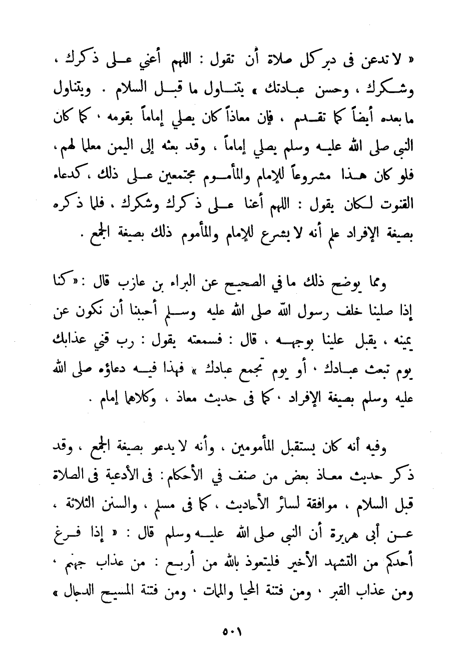 {لَا تَدَعَنَّ فِي دُبُرِ كُلِّ صَلَاةٍ أَنْ تَقُولَ: اللَّهُمَّ أَعِنِّي عَلَى ذِكْرِك وَشُكْرِك وَحُسْنِ عِبَادَتِك} يَتَنَاوَلُ مَا قَبْلَ السَّلَامِ. وَيَتَنَاوَلُ مَا بَعْدَهُ أَيْضًا كَمَا تَقَدَّمَ فَإِنَّ مُعَاذًا كَانَ يُصَلِّي إمَامًا بِقَوْمِهِ كَمَا كَانَ النَّبِيُّ صَلَّى اللَّهُ عَلَيْهِ وَسَلَّمَ يُصَلِّي إمَامًا وَقَدْ بَعَثَهُ إلَى الْيَمَنِ مُعَلِّمًا لَهُمْ فَلَوْ كَانَ هَذَا مَشْرُوعًا لِلْإِمَامِ وَالْمَأْمُومِ مُجْتَمِعَيْنِ عَلَى ذَلِكَ كَدُعَاءِ الْقُنُوتِ لَكَانَ يَقُولُ: اللَّهُمَّ أَعِنَّا عَلَى ذِكْرِك وَشُكْرِك فَلَمَّا ذَكَرَهُ بِصِيغَةِ الْإِفْرَادِ عُلِمَ أَنَّهُ لَا يُشْرَع لِلْإِمَامِ وَالْمَأْمُومِ ذَلِكَ بِصِيغَةِ الْجَمْعِ. وَمِمَّا يُوَضِّحُ ذَلِكَ مَا فِي الصَّحِيحِ عَنْ الْبَرَاءِ بْنِ عَازِبٍ قَالَ: {كُنَّا إذَا صَلَّيْنَا خَلْفَ رَسُولِ اللَّهِ صَلَّى اللَّهُ عَلَيْهِ وَسَلَّمَ أَحْبَبْنَا أَنْ نَكُونَ عَنْ يَمِينِهِ يُقْبِلُ عَلَيْنَا بِوَجْهِهِ قَالَ: فَسَمِعْته يَقُولُ: رَبِّ قِنِي عَذَابَك يَوْمَ تَبْعَثُ عِبَادَك أَوْ يَوْمَ تَجْمَعُ عِبَادَك} فَهَذَا فِيهِ دُعَاؤُهُ صَلَّى اللَّهُ عَلَيْهِ وَسَلَّمَ بِصِيغَةِ الْإِفْرَادِ كَمَا فِي حَدِيثِ مَعَاذٍ وَكِلَاهُمَا إمَامٌ. وَفِيهِ أَنَّهُ كَانَ يَسْتَقْبِلُ الْمَأْمُومِينَ وَأَنَّهُ لَا يَدْعُو بِصِيغَةِ الْجَمْعِ وَقَدْ ذَكَرَ حَدِيثَ مُعَاذٍ بَعْضُ مَنْ صَنَّفَ الْأَحْكَامَ: فِي الْأَدْعِيَةِ فِي الصَّلَاةِ قَبْلَ السَّلَامِ مُوَافِقَةً لِسَائِرِ الْأَحَادِيثِ كَمَا فِي مُسْلِمٍ وَالسُّنَنِ الثَّلَاثَةِ عَنْ أَبِي هُرَيْرَةَ أَنَّ النَّبِيَّ صَلَّى اللَّهُ عَلَيْهِ وَسَلَّمَ قَالَ: {إذَا فَرَغَ أَحَدُكُمْ مِنْ التَّشَهُّدِ الْأَخِيرِ فَلْيَتَعَوَّذْ بِاَللَّهِ مِنْ أَرْبَعٍ: مِنْ عَذَابِ جَهَنَّمَ وَمِنْ عَذَابِ الْقَبْرِ وَمِنْ فِتْنَةِ الْمَحْيَا وَالْمَمَاتِ وَمِنْ فِتْنَةِ الْمَسِيحِ الدَّجَّالِ}