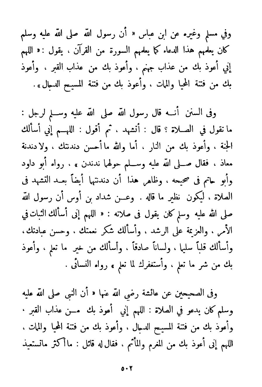 وَفِي مُسْلِمٍ وَغَيْرِهِ عَنْ ابْنِ عَبَّاسٍ " أَنَّ رَسُولَ اللَّهِ صَلَّى اللَّهُ عَلَيْهِ وَسَلَّمَ كَانَ يُعَلِّمُهُمْ هَذَا الدُّعَاءَ كَمَا يُعَلِّمُهُمْ السُّورَةَ مِنْ الْقُرْآنِ يَقُولُ: {اللَّهُمَّ إنِّي أَعُوذُ بِك مِنْ عَذَابِ جَهَنَّمَ وَأَعُوذُ بِك مِنْ عَذَابِ الْقَبْرِ وَأَعُوذُ بِك مِنْ فِتْنَةِ الْمَحْيَا وَالْمَمَاتِ وَأَعُوذُ بِك مِنْ فِتْنَةِ الْمَسِيحِ الدَّجَّالِ} . وَفِي السُّنَنِ {أَنَّهُ قَالَ رَسُولُ اللَّهِ صَلَّى اللَّهُ عَلَيْهِ وَسَلَّمَ لِرَجُلِ: مَا تَقُولُ فِي الصَّلَاةِ؟ قَالَ: أَتَشَهَّدُ ثُمَّ أَقُولُ: اللَّهُمَّ إنِّي أَسْأَلُك الْجَنَّةَ وَأَعُوذُ بِك مِنْ النَّارِ أَمَا وَاَللَّهِ مَا أُحْسِنُ دَنْدَنَتَك وَلَا دَنْدَنَةَ مُعَاذٍ فَقَالَ صَلَّى اللَّهُ عَلَيْهِ وَسَلَّمَ حَوْلَهُمَا نُدَنْدِنُ} رَوَاهُ أَبُو دَاوُد وَأَبُو حَاتِمٍ فِي صَحِيحِهِ وَظَاهِرُ هَذَا أَنَّ دَنْدَنَتَهُمَا أَيْضًا بَعْدَ التَّشَهُّدِ فِي الصَّلَاةِ لِيَكُونَ نَطِيرَ مَا قَالَهُ. وَعَنْ شَدَّادِ بْنِ أَوْسٍ {أَنَّ رَسُولَ اللَّهِ صَلَّى اللَّهُ عَلَيْهِ وَسَلَّمَ كَانَ يَقُولُ فِي صَلَاتِهِ: اللَّهُمَّ إنِّي أَسْأَلُك الثَّبَاتَ فِي الْأَمْرِ وَالْعَزِيمَةَ عَلَى الرُّشْدِ وَأَسْأَلُك شُكْرَ نِعْمَتِك وَحُسْنَ عِبَادَتِك وَأَسْأَلُك قَلْبًا سَلِيمًا وَلِسَانًا صَادِقًا وَأَسْأَلُك مِنْ خَيْرِ مَا تَعْلَمُ وَأَعُوذُ بِك مِنْ شَرِّ مَا تَعْلَمُ وَأَسْتَغْفِرُك لِمَا تَعْلَمُ} رَوَاهُ النَّسَائِي. وَفِي الصَّحِيحَيْنِ عَنْ عَائِشَةَ رَضِيَ اللَّهُ عَنْهَا " أَنَّ النَّبِيَّ صَلَّى اللَّهُ عَلَيْهِ وَسَلَّمَ كَانَ يَدْعُو فِي الصَّلَاةِ {: اللَّهُمَّ إنِّي أَعُوذُ بِك مِنْ عَذَابِ الْقَبْرِ وَأَعُوذُ بِك مِنْ فِتْنَةِ الْمَسِيحِ الدَّجَّالِ وَأَعُوذُ بِك مِنْ فِتْنَةِ الْمَحْيَا وَالْمَمَاتِ اللَّهُمَّ إنِّي أَعُوذُ بِك مِنْ الْمَغْرَمِ وَالْمَأْثَمِ فَقَالَ لَهُ قَائِلٌ: مَا أَكْثَرَ مَا تَسْتَعِيذُ