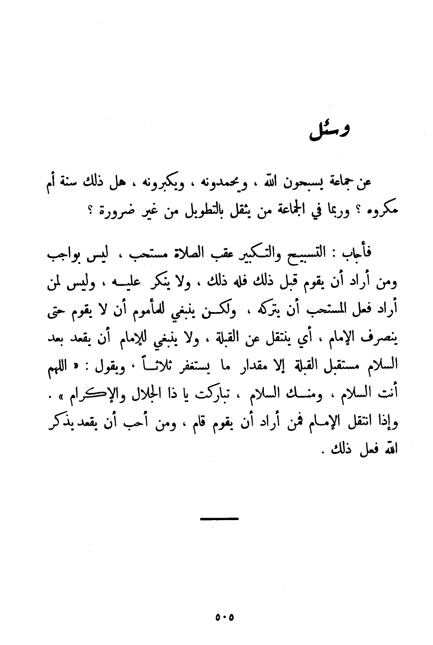 التَّسْبِيحُ وَالتَّكْبِيرُ عَقِبَ الصَّلَاةِ مُسْتَحَبٌّ لَيْسَ بِوَاجِبِ وَمَنْ أَرَادَ أَنْ يَقُومَ قَبْلَ ذَلِكَ فَلَهُ ذَلِكَ وَلَا يُنْكَرُ عَلَيْهِ وَلَيْسَ لِمَنْ أَرَادَ فِعْلَ الْمُسْتَحَبِّ أَنْ يَتْرُكَهُ وَلَكِنْ يَنْبَغِي لِلْمَأْمُومِ أَنْ لَا يَقُومَ حَتَّى يَنْصَرِفَ الْإِمَامُ أَيْ يَنْتَقِلَ عَنْ الْقِبْلَةِ وَلَا يَنْبَغِي لِلْإِمَامِ أَنْ يَقْعُدَ بَعْدَ السَّلَامِ مُسْتَقْبِلَ الْقِبْلَةِ إلَّا مِقْدَارَ مَا يَسْتَغْفِرُ ثَلَاثًا وَيَقُولُ: {اللَّهُمَّ أَنْتَ السَّلَامُ وَمِنْك السَّلَامُ تَبَارَكْت يَا ذَا الْجَلَالِ وَالْإِكْرَامِ} . وَإِذَا انْتَقَلَ الْإِمَامُ فَمَنْ أَرَادَ أَنْ يَقُومَ قَامَ وَمَنْ أَحَبَّ أَنْ يَقْعُدَ يَذْكُرُ اللَّهَ فَعَلَ ذَلِكَ.