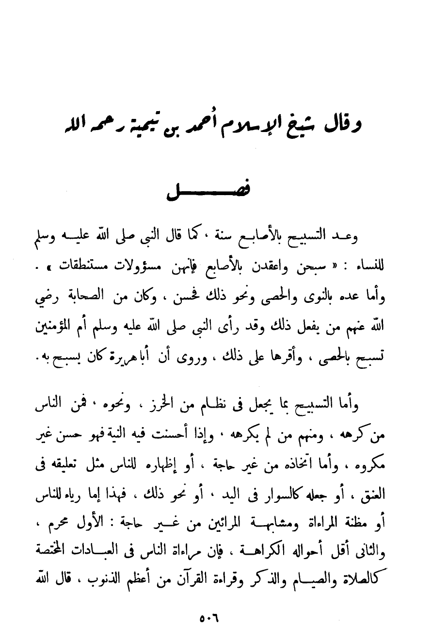 وَأَمَّا التَّسْبِيحُ بِمَا يُجْعَلُ فِي نِظَامٍ مِنْ الْخَرَزِ وَنَحْوِهِ فَمِنْ النَّاسِ مَنْ كَرِهَهُ وَمِنْهُمْ مَنْ لَمْ يَكْرَهْهُ وَإِذَا أُحْسِنَتْ فِيهِ النِّيَّةُ فَهُوَ حَسَنٌ غَيْرُ مَكْرُوهٍ وَأَمَّا اتِّخَاذُهُ مِنْ غَيْرِ حَاجَةٍ أَوْ إظْهَارُهُ لِلنَّاسِ مِثْلُ تَعْلِيقِهِ فِي الْعُنُقِ أَوْ جَعْلِهِ كَالسُّوَارِ فِي الْيَدِ أَوْ نَحْوِ ذَلِكَ فَهَذَا إمَّا رِيَاءٌ لِلنَّاسِ أَوْ مَظِنَّةُ الْمُرَاءَاةِ وَمُشَابَهَةِ الْمُرَائِينَ مِنْ غَيْرِ حَاجَةٍ: الْأَوَّلُ مُحَرَّمٌ وَالثَّانِي أَقَلُّ أَحْوَالِهِ الْكَرَاهَةُ فَإِنَّ مُرَاءَاةَ النَّاسِ فِي الْعِبَادَاتِ الْمُخْتَصَّةِ كَالصَّلَاةِ وَالصِّيَامِ وَالذِّكْرِ وَقِرَاءَةِ الْقُرْآنِ مِنْ أَعْظَمِ الذُّنُوبِ قَالَ اللَّهُ